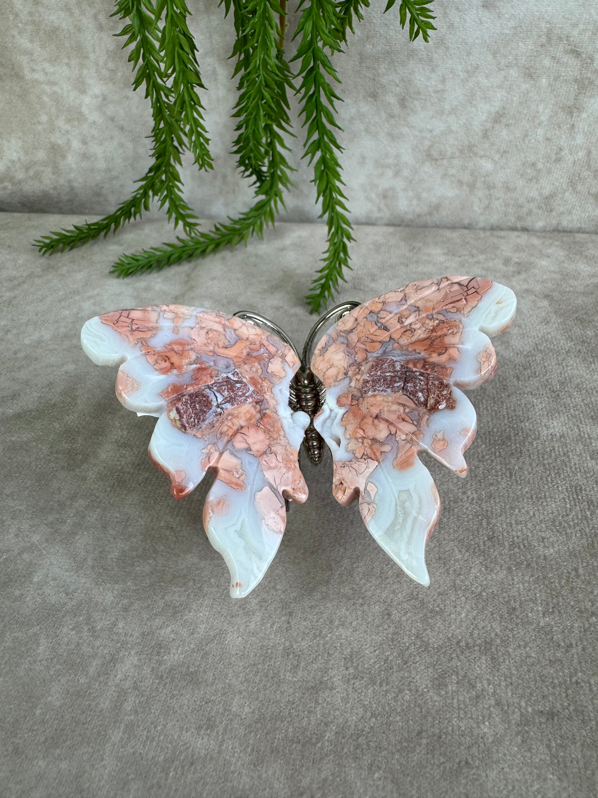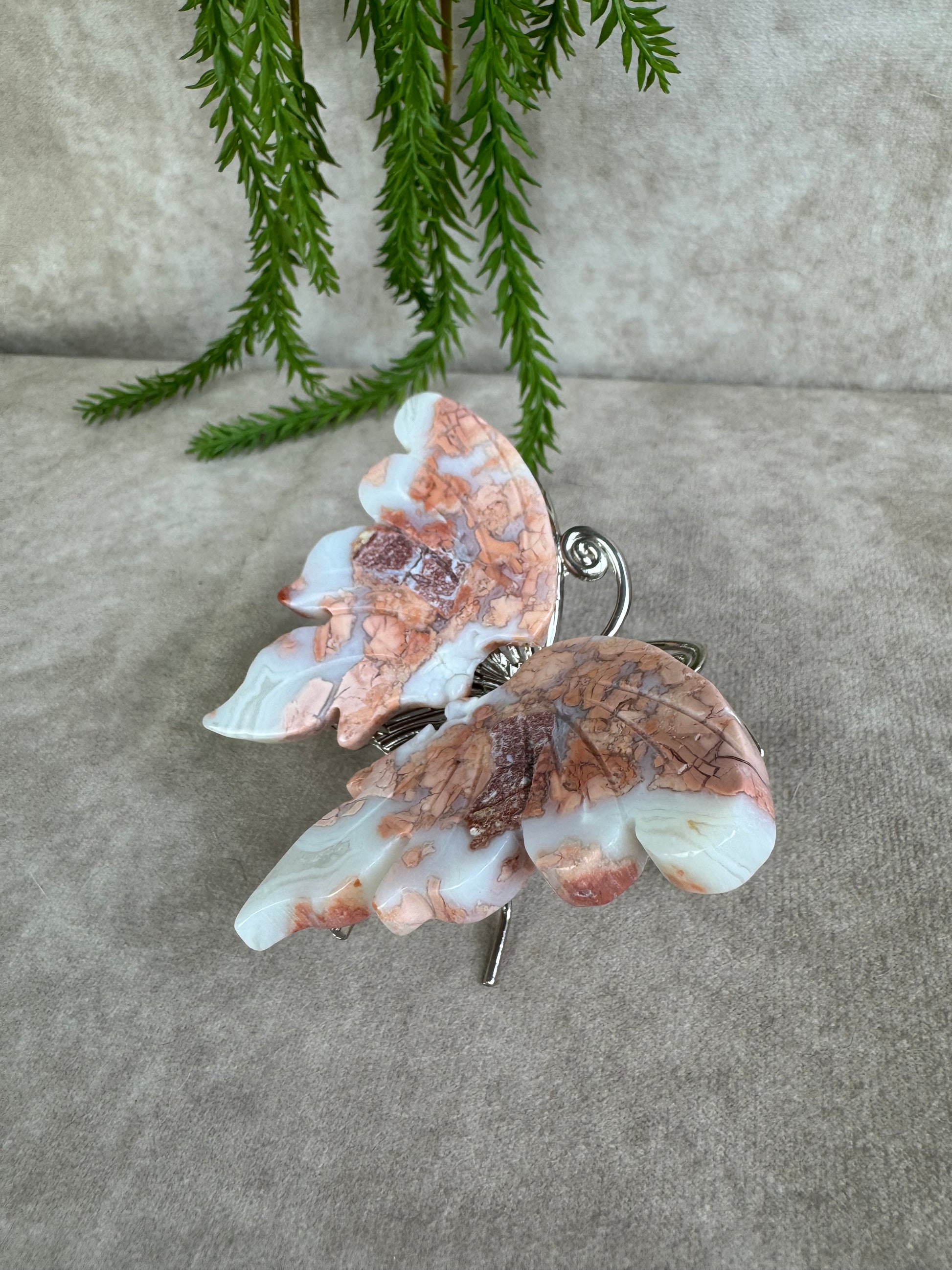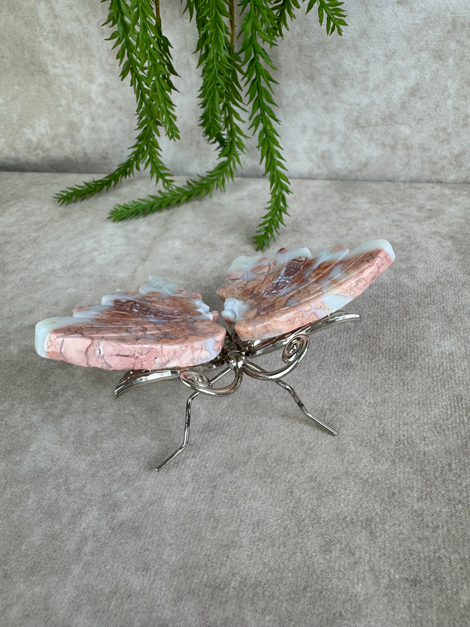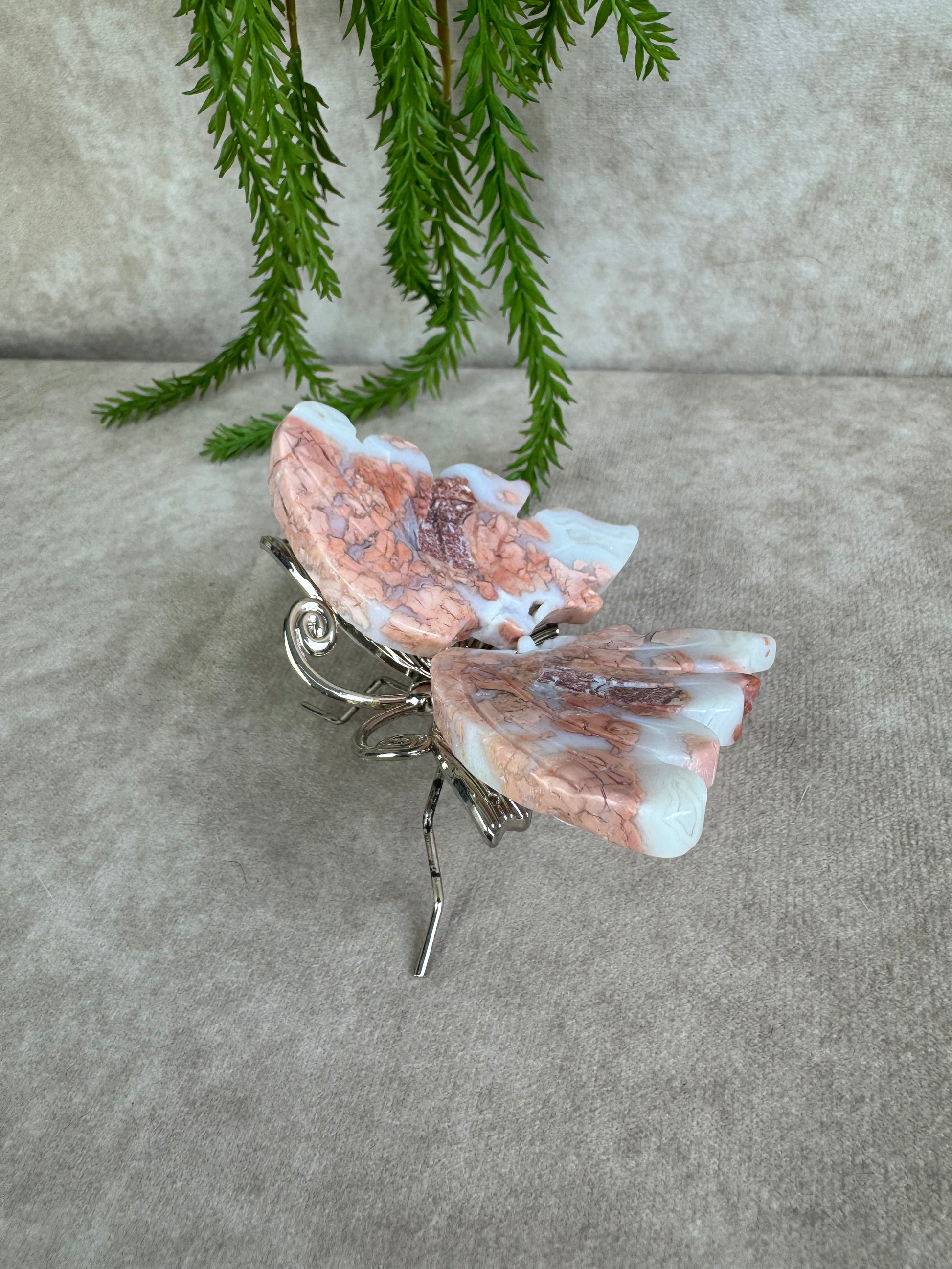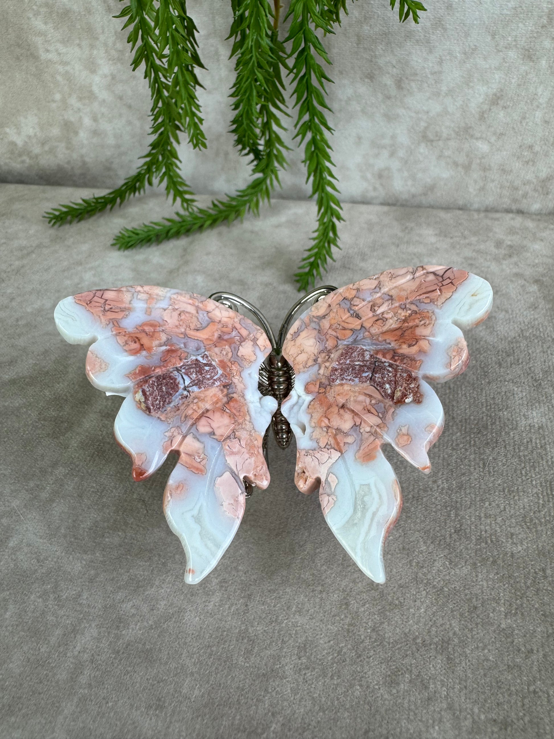 Roze agaat is een steen van rust, harmonie en emotionele heling. In de vorm van een vlinder het symbool van transformatie en lichtheid versterkt deze steen gevoelens van liefde, zelfzorg en innerlijke balans.