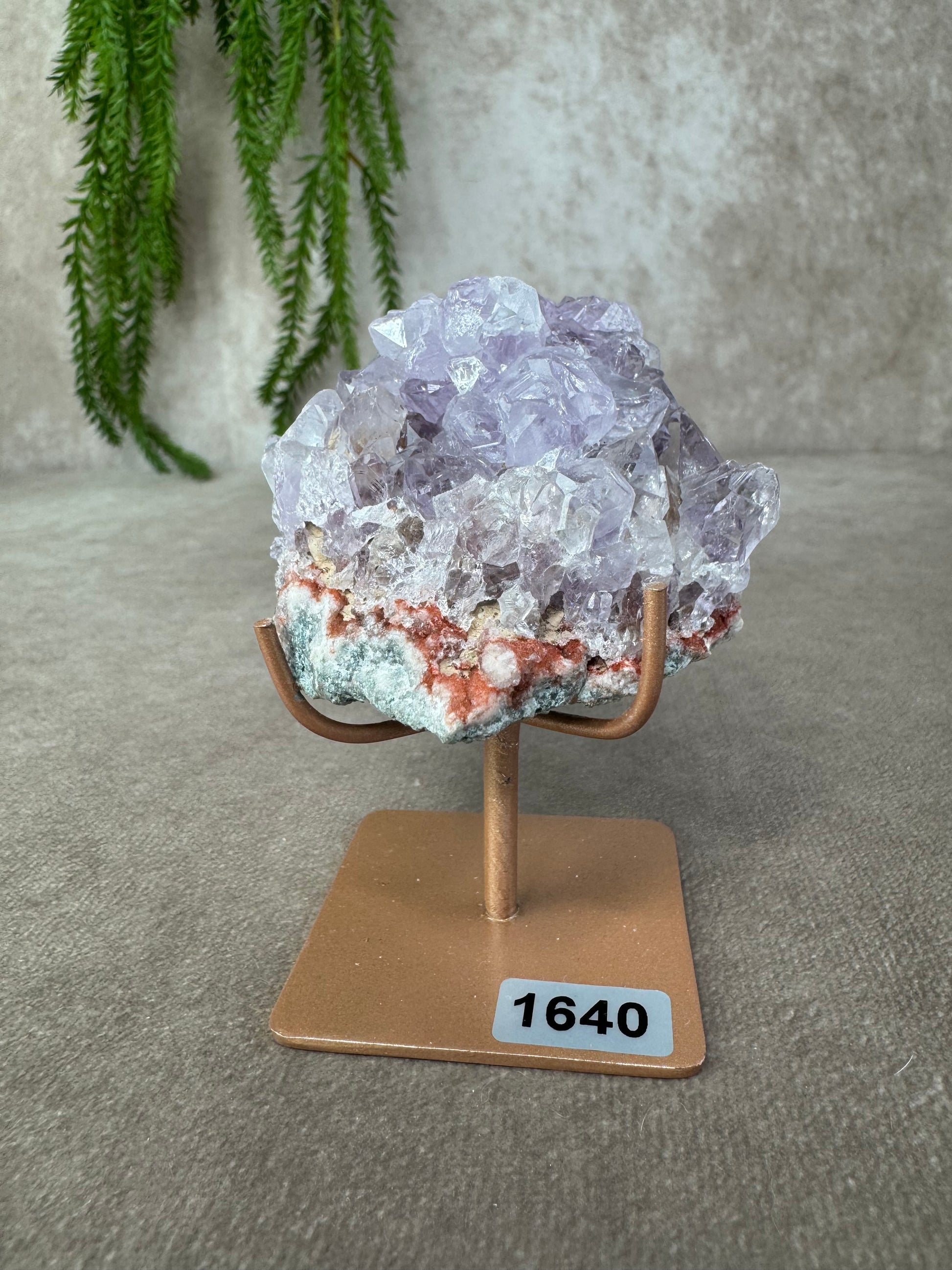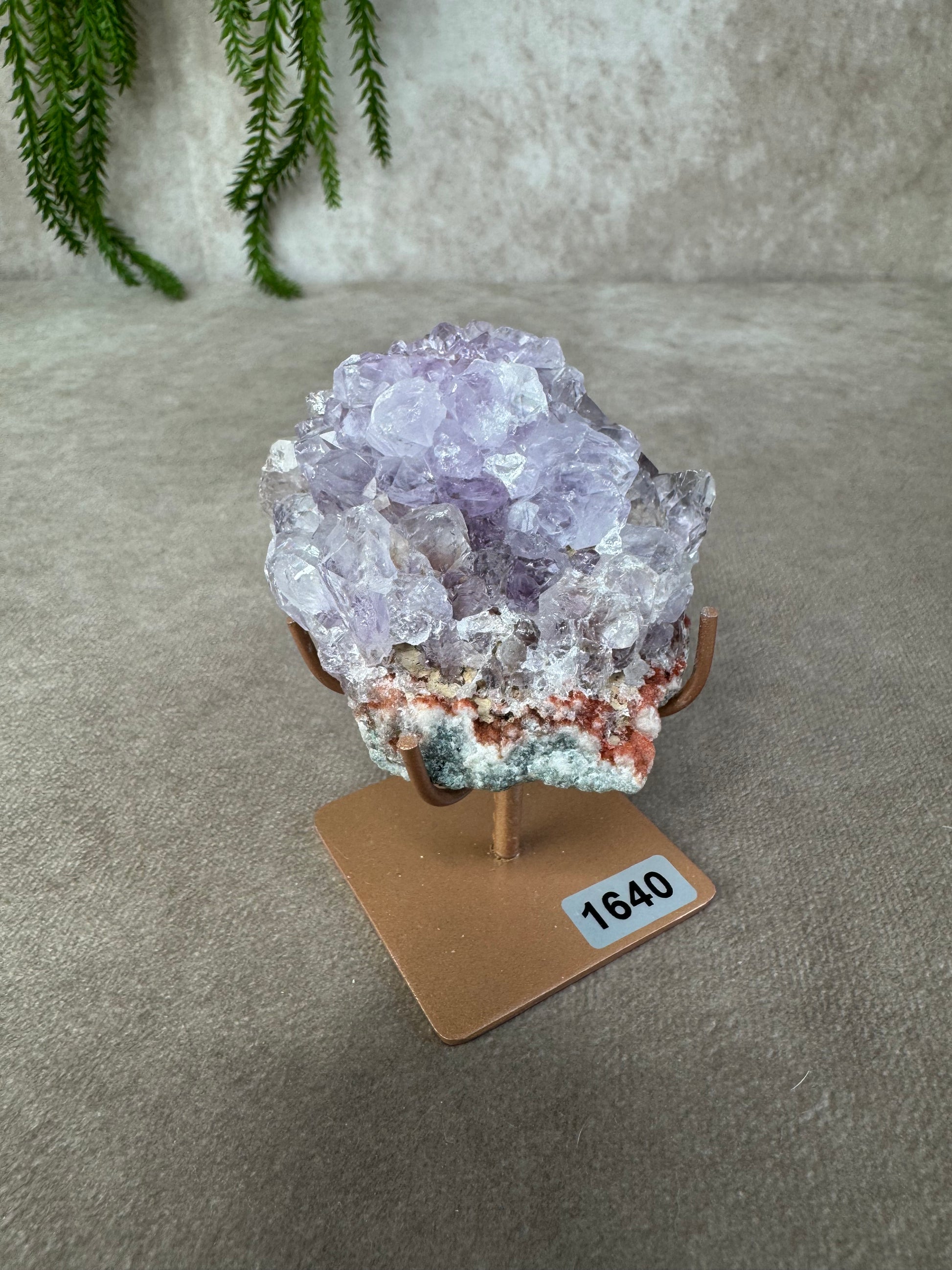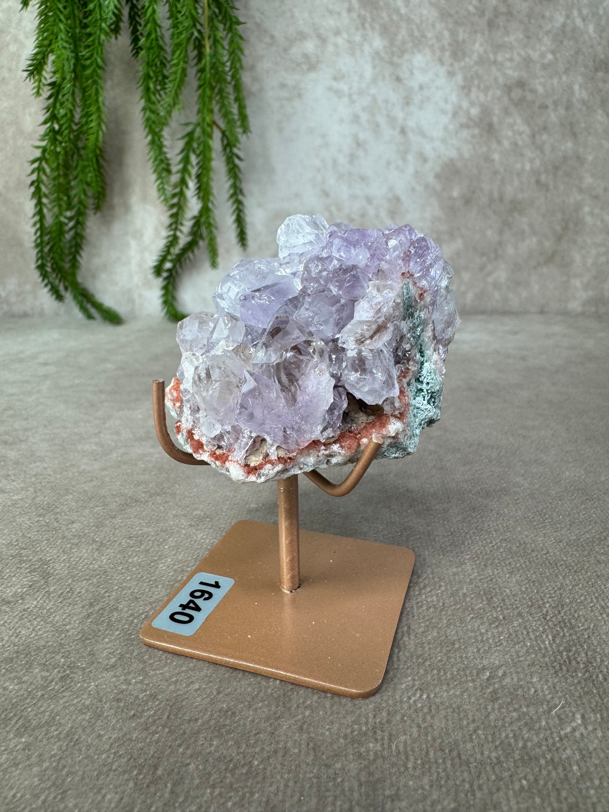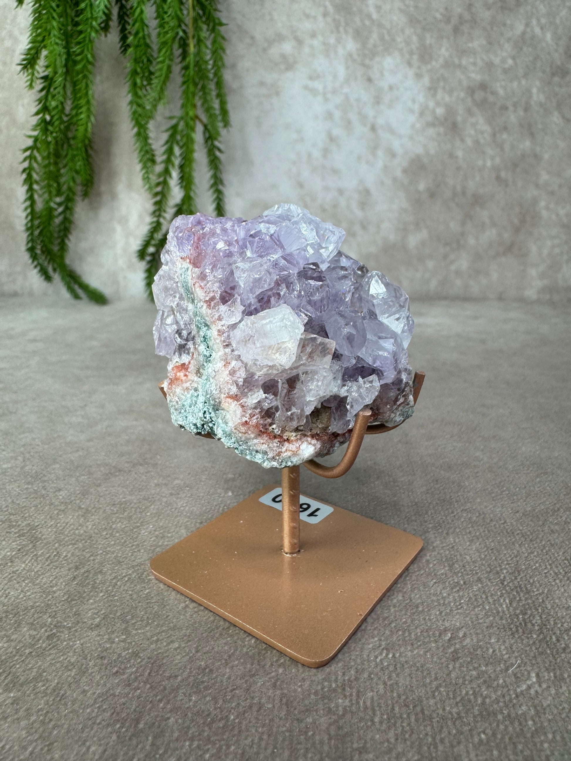 Deze schitterende roze amethist cluster is een compact maar opvallend stuk vol natuurlijke schoonheid. Het meet 8,7 cm hoog en 6,2 cm breed.