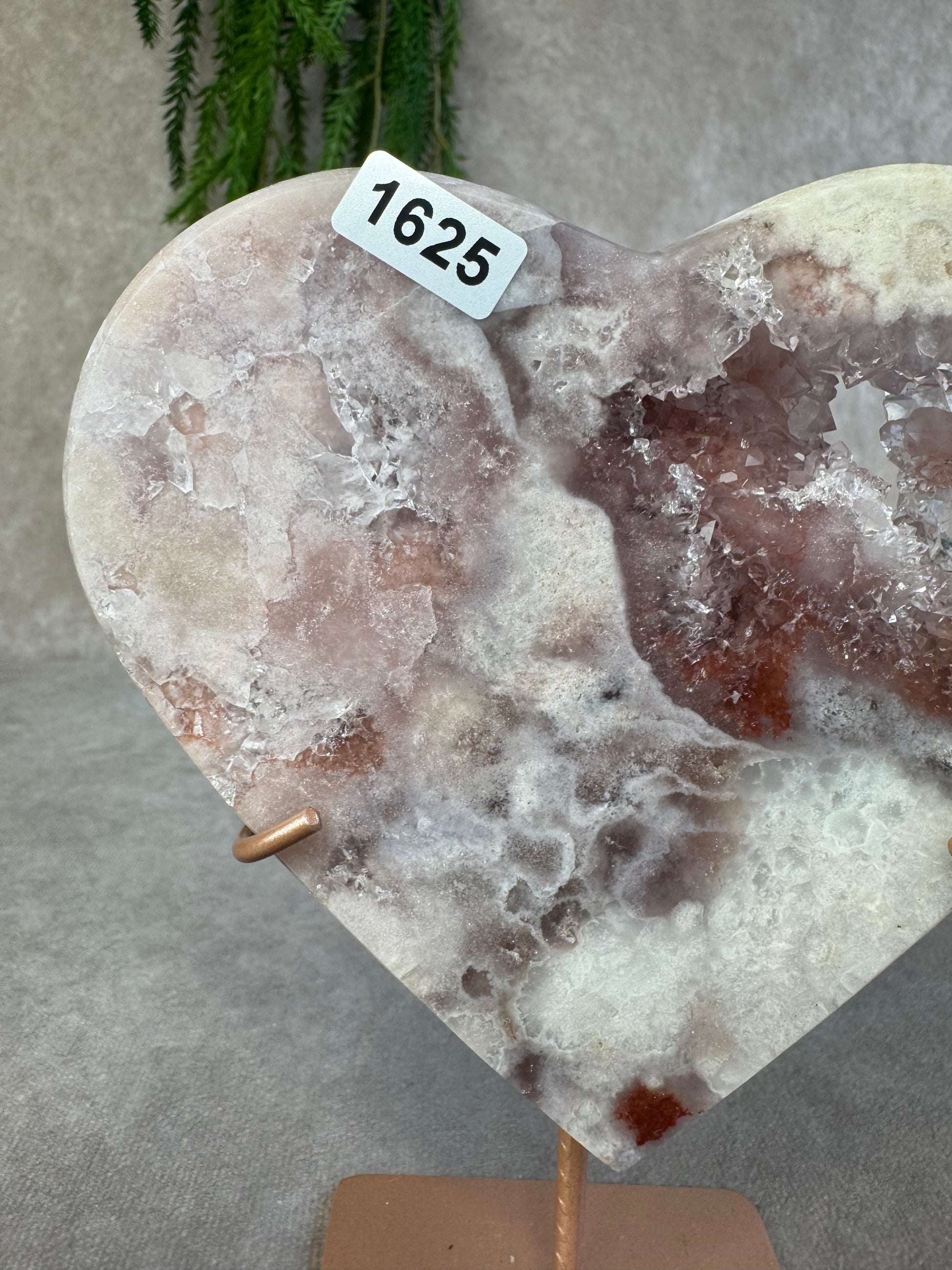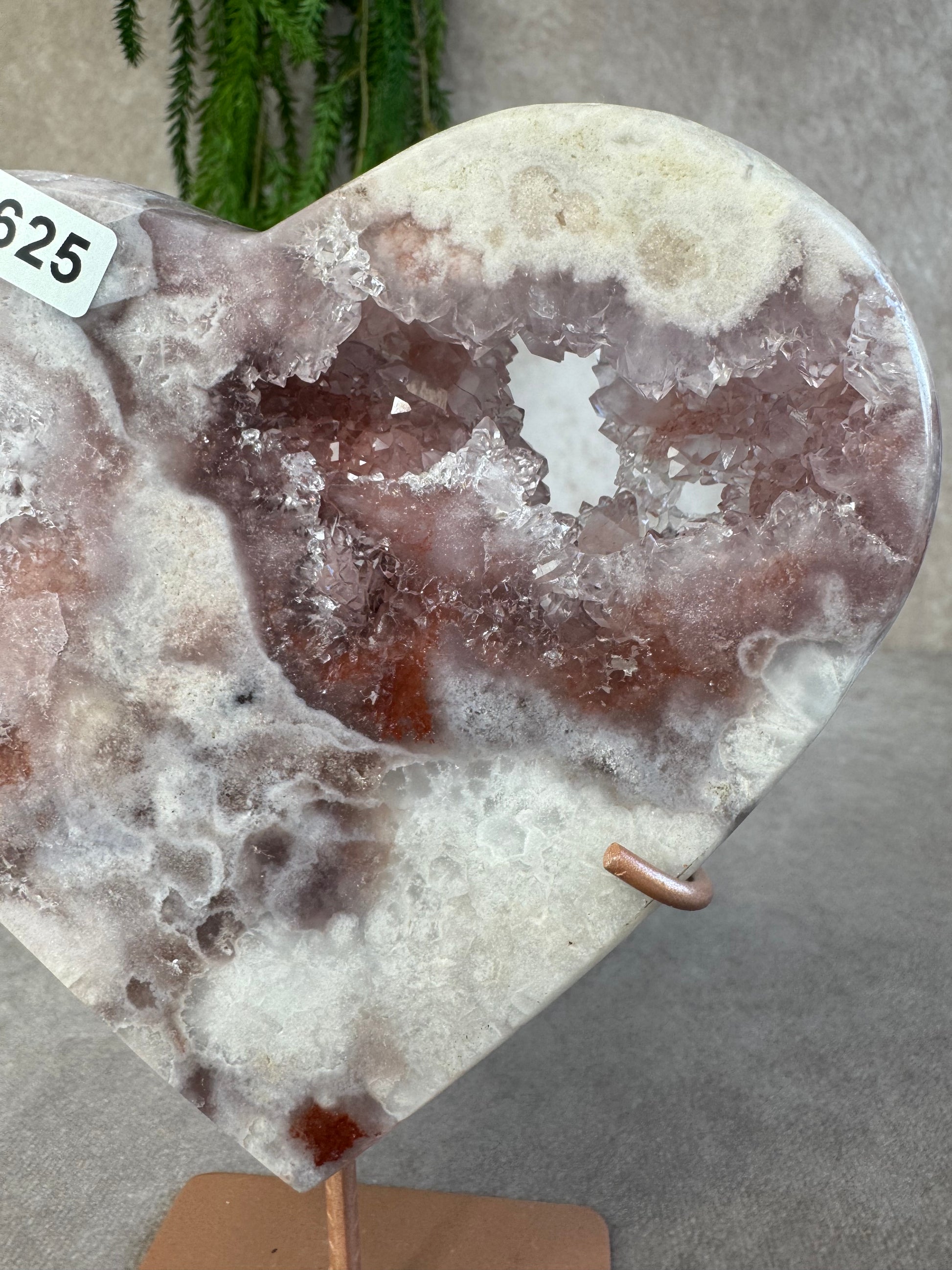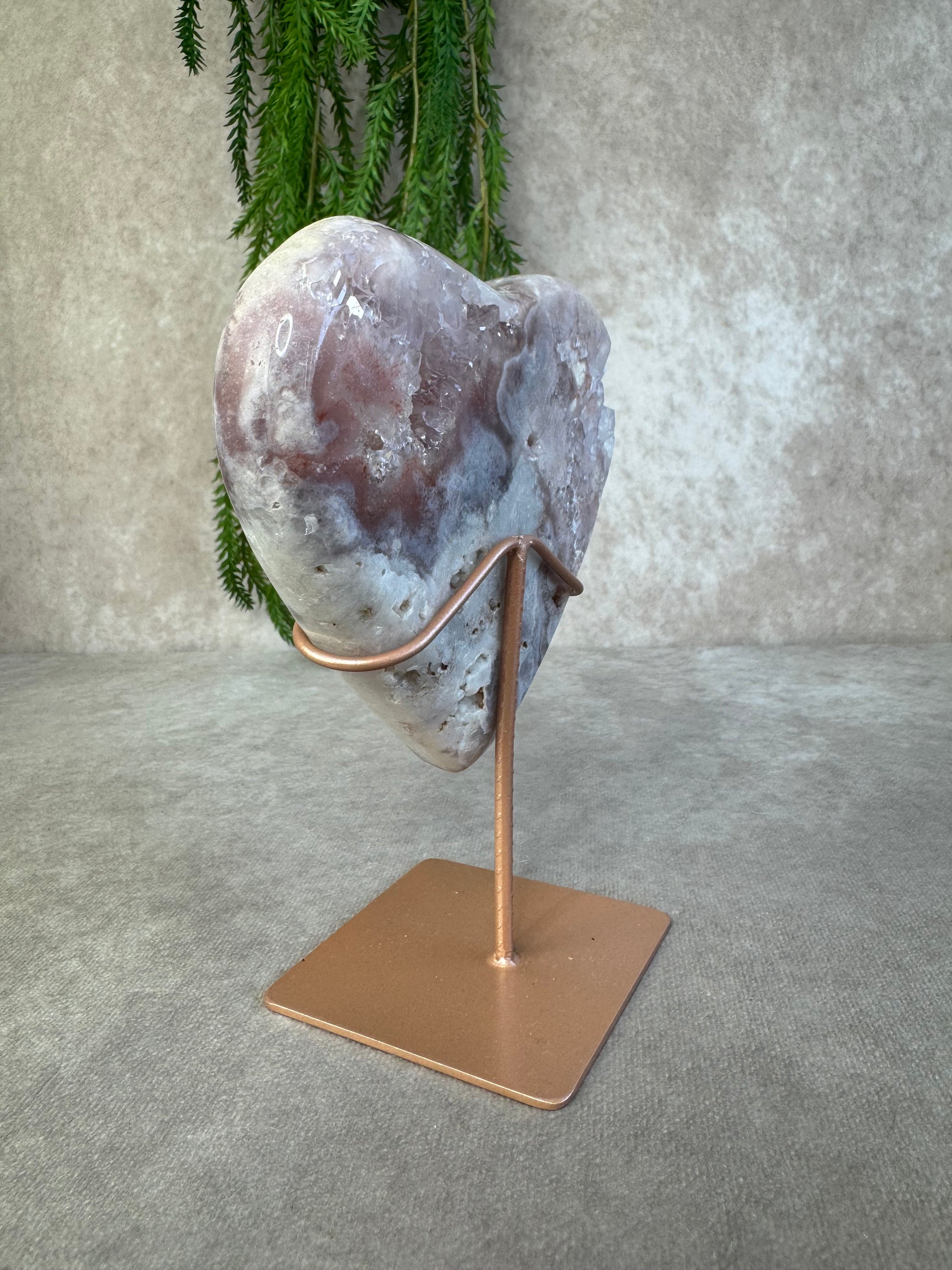 Dit indrukwekkende hart van roze amethist weegt 706 gram en meet 17,5 cm hoog en 14 cm breed. Het stuk wordt geleverd met een elegante roze-gouden standaard en is verrijkt met een fonkelende druzy, die prachtig schittert bij elke lichtval.