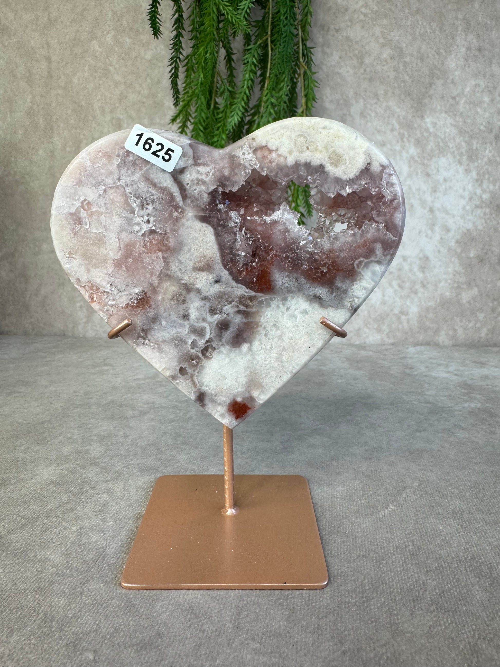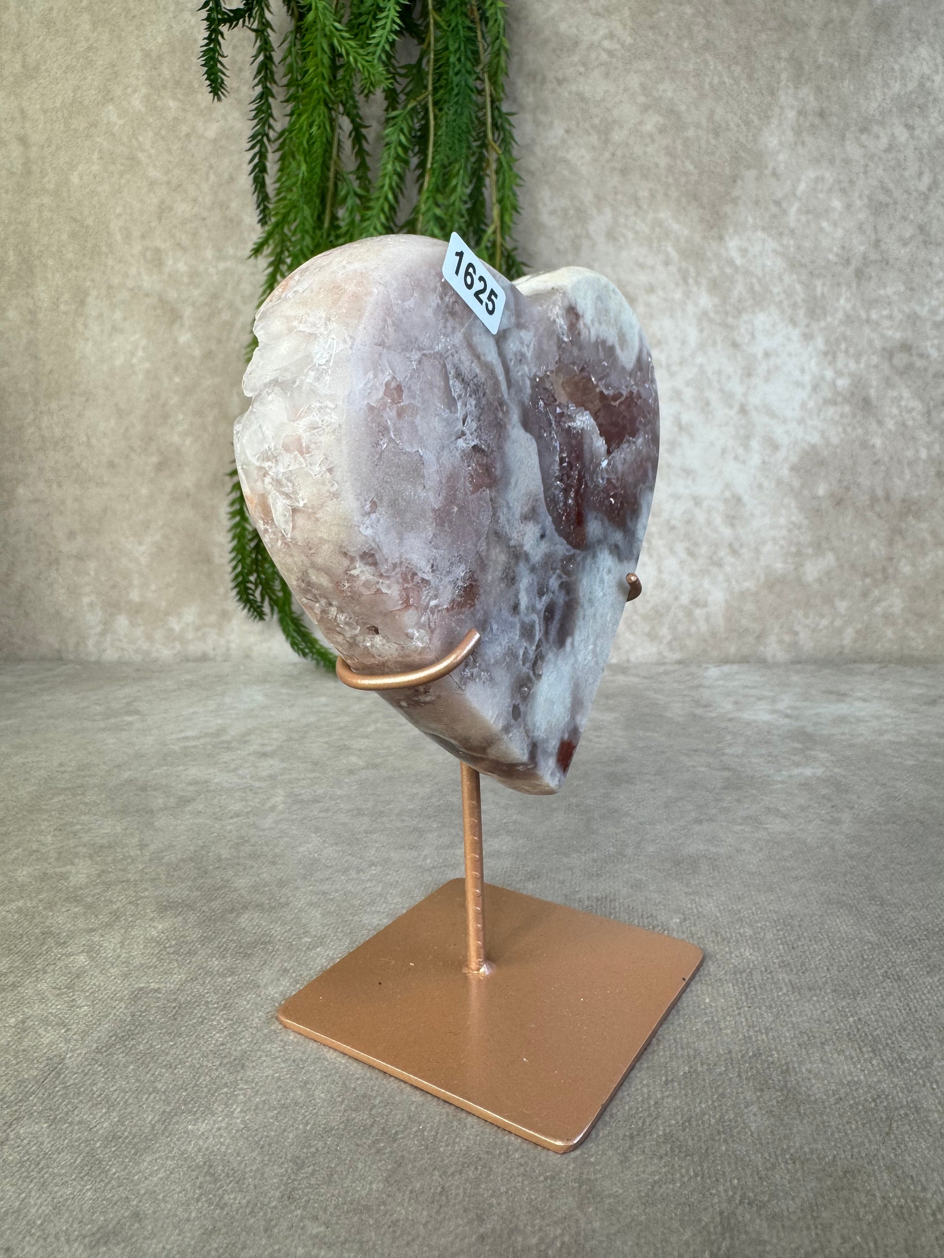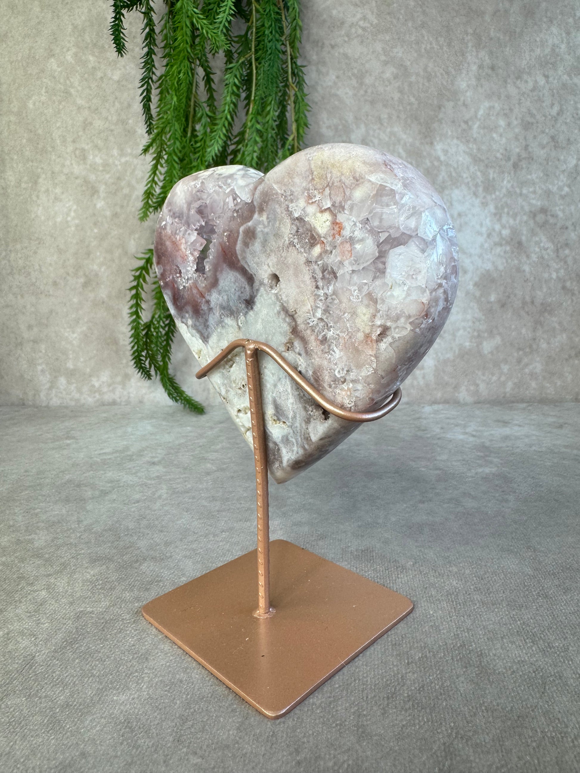 Dit indrukwekkende hart van roze amethist weegt 706 gram en meet 17,5 cm hoog en 14 cm breed. Het stuk wordt geleverd met een elegante roze-gouden standaard en is verrijkt met een fonkelende druzy, die prachtig schittert bij elke lichtval.