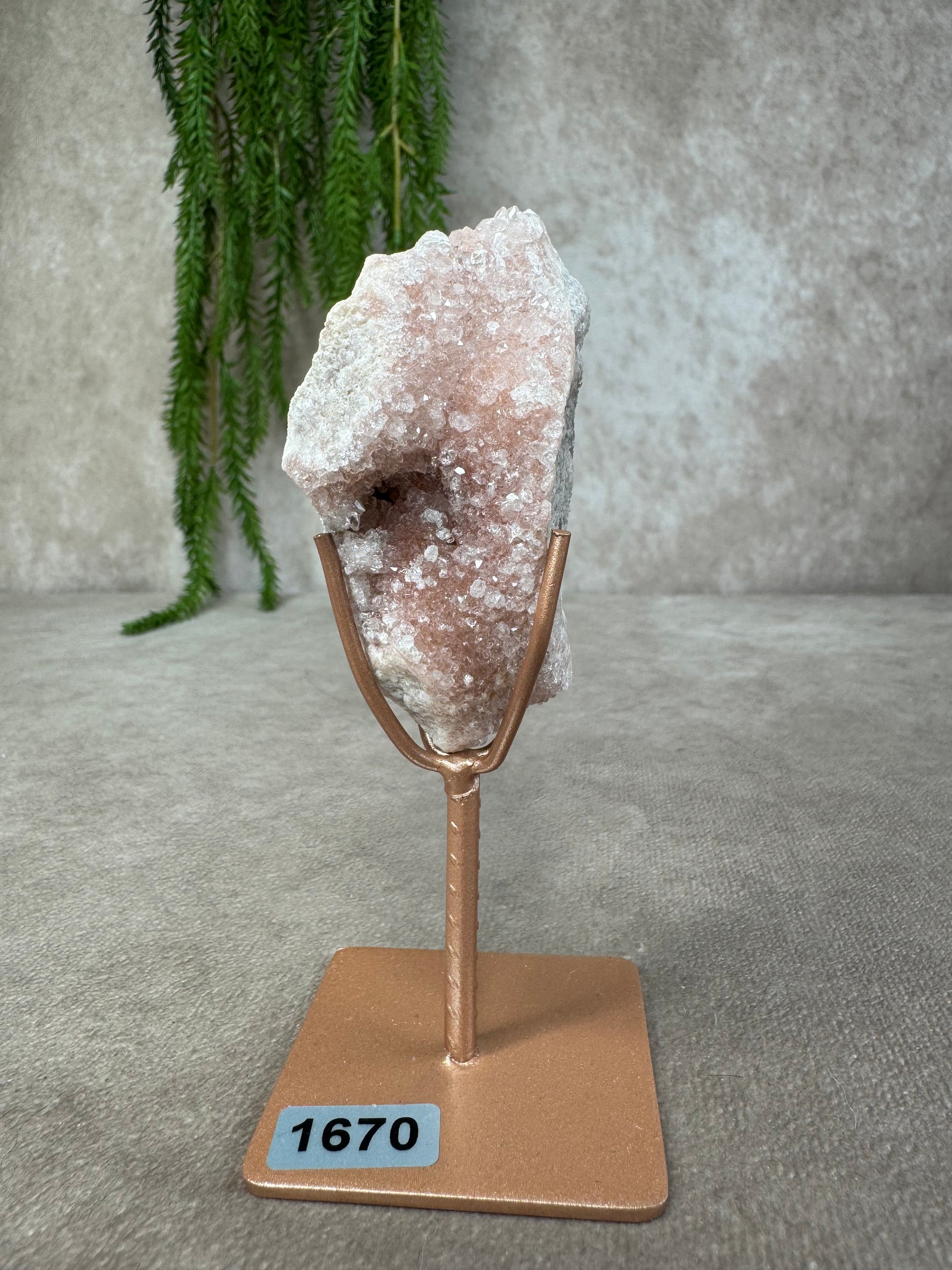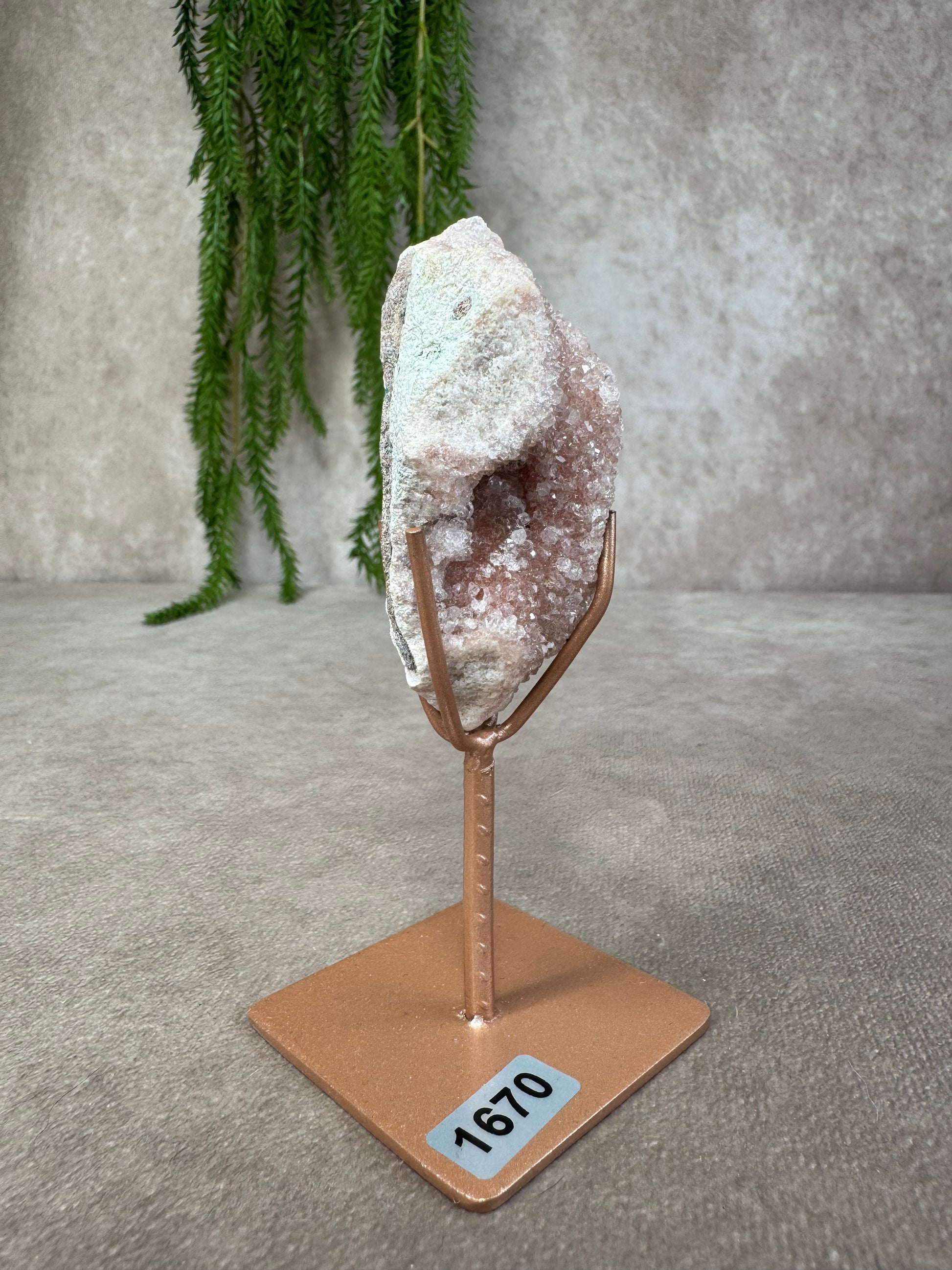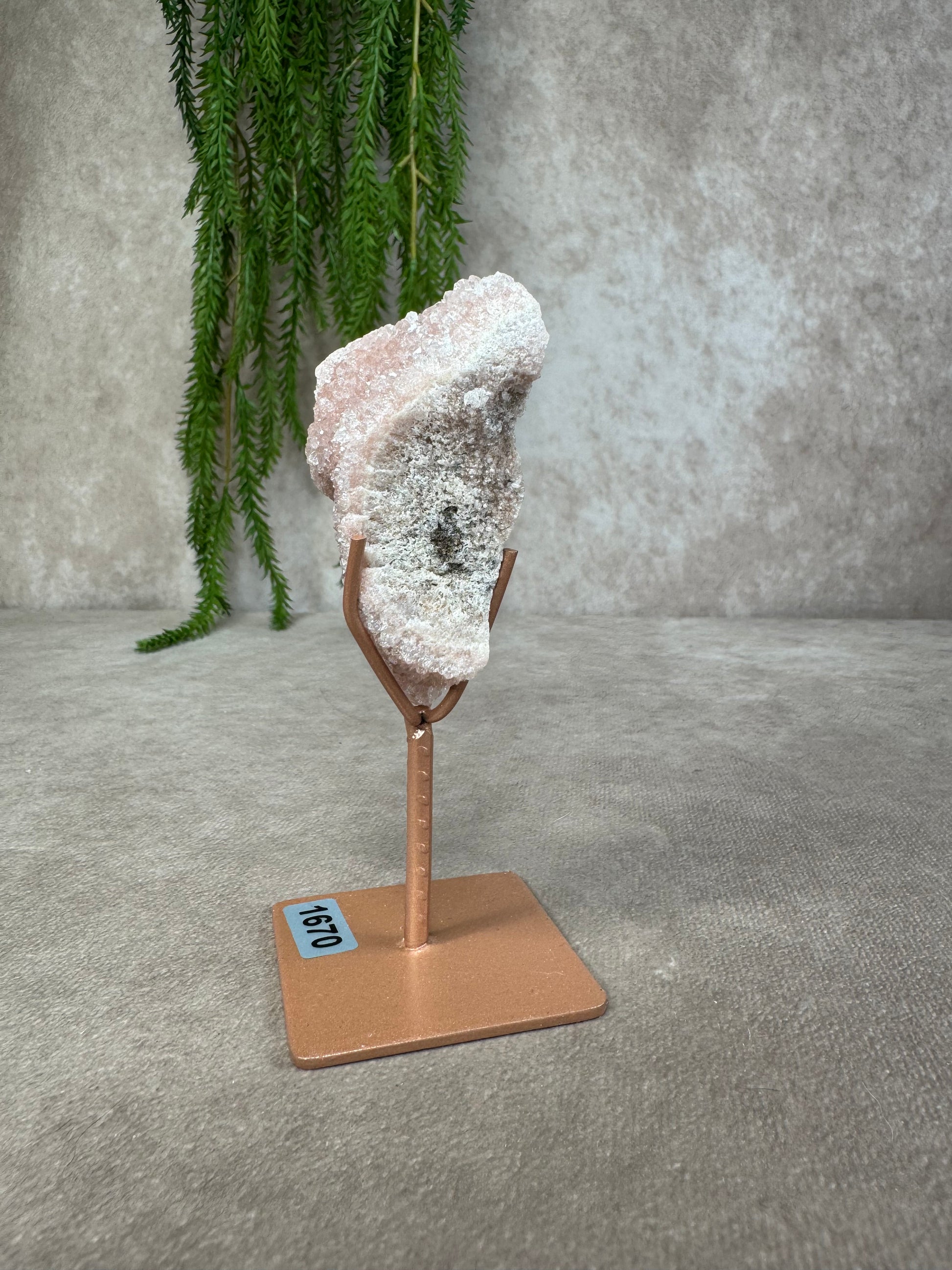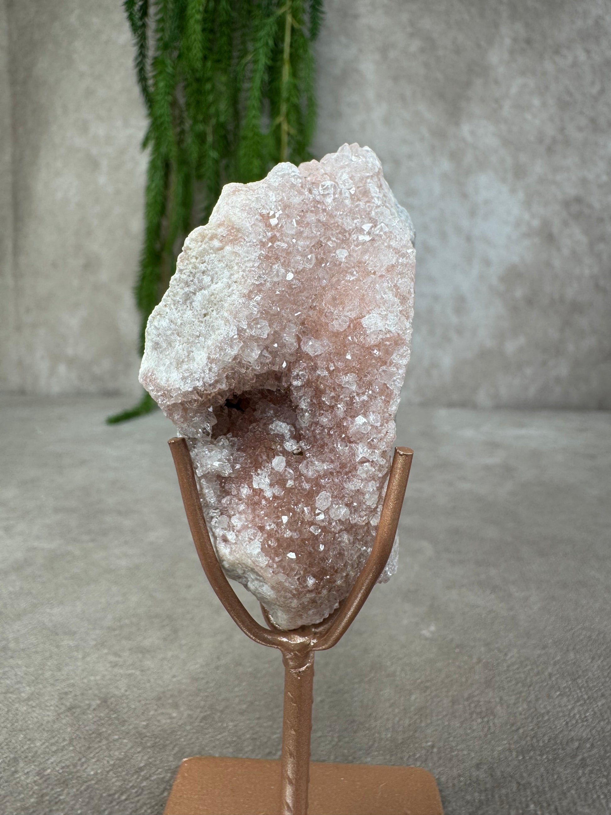 Deze roze amethist cluster is een subtiel en elegant stuk van 11,5 cm hoog en 5 cm breed, met een heel lichte, zachte roze kleur en fijne kristalstructuren die prachtig glanzen in het licht. Geplaatst op een bijpassende standaard komt dit natuurlijke kunstwerk perfect tot zijn recht.