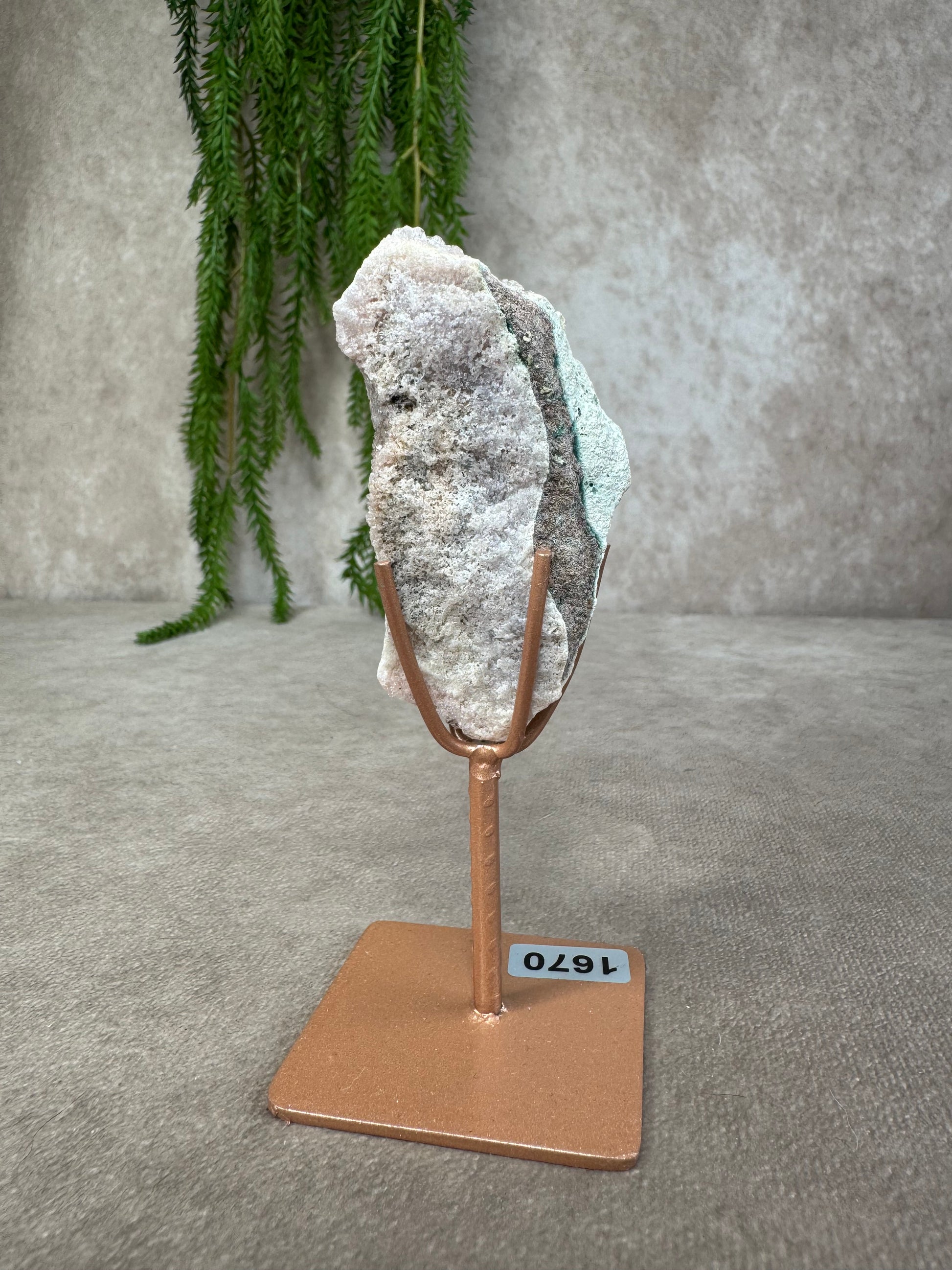 De naam roze amethist is een handelsnaam de steen bestaat eigenlijk uit chalcedoon met amethiststructuren. Dit zorgt voor de kenmerkende zachtheid, glans en unieke tekening van elk stuk.