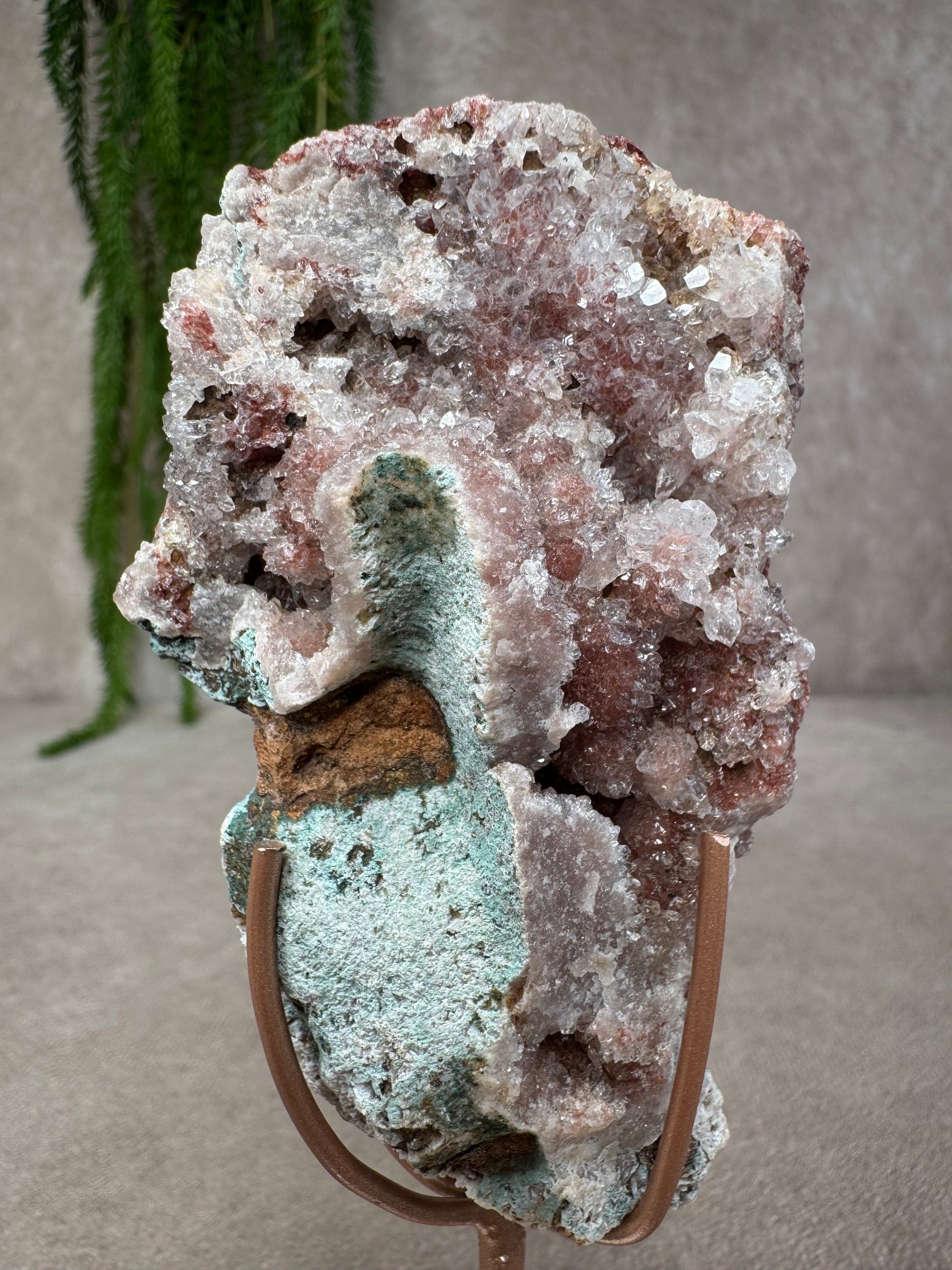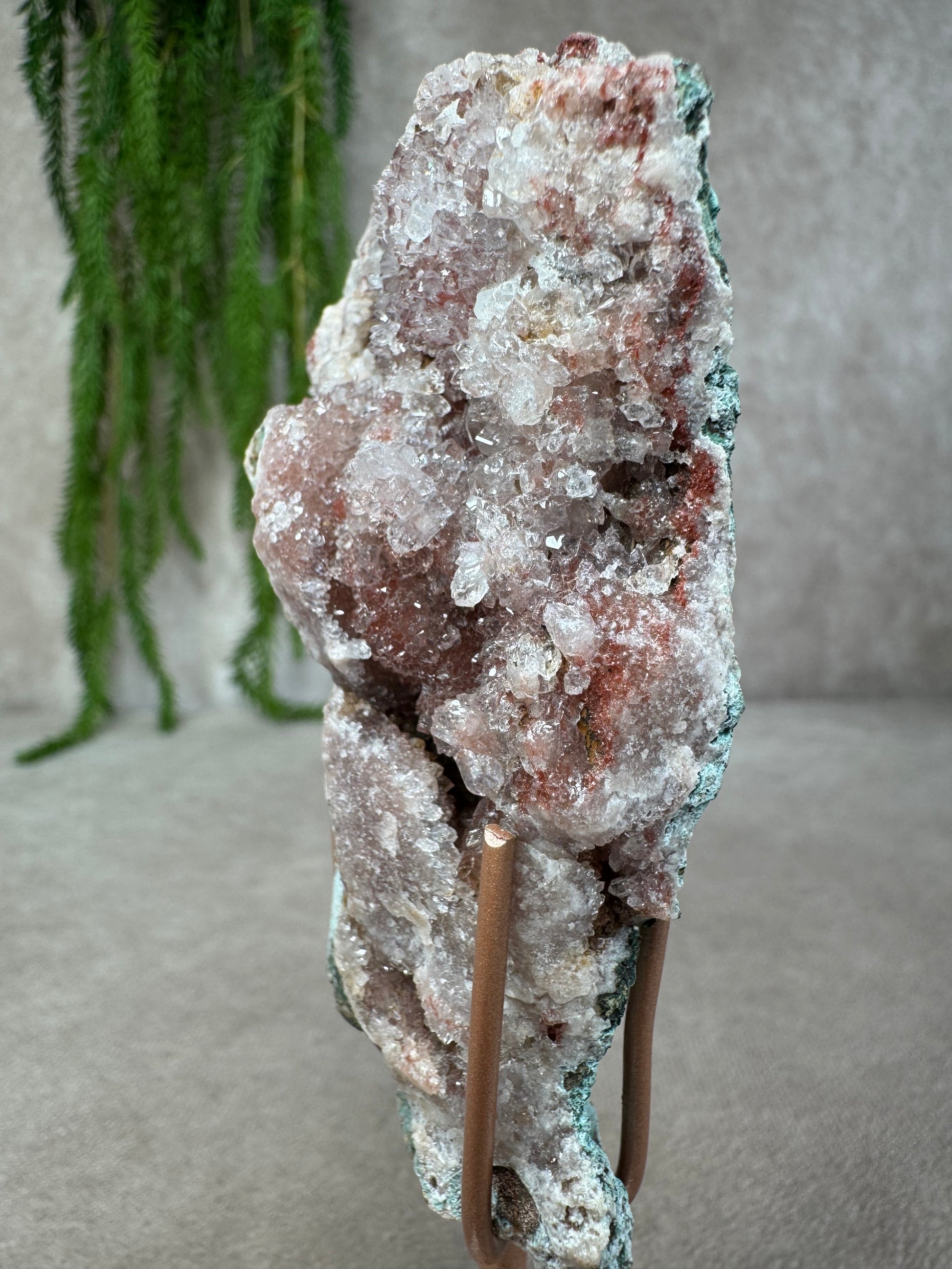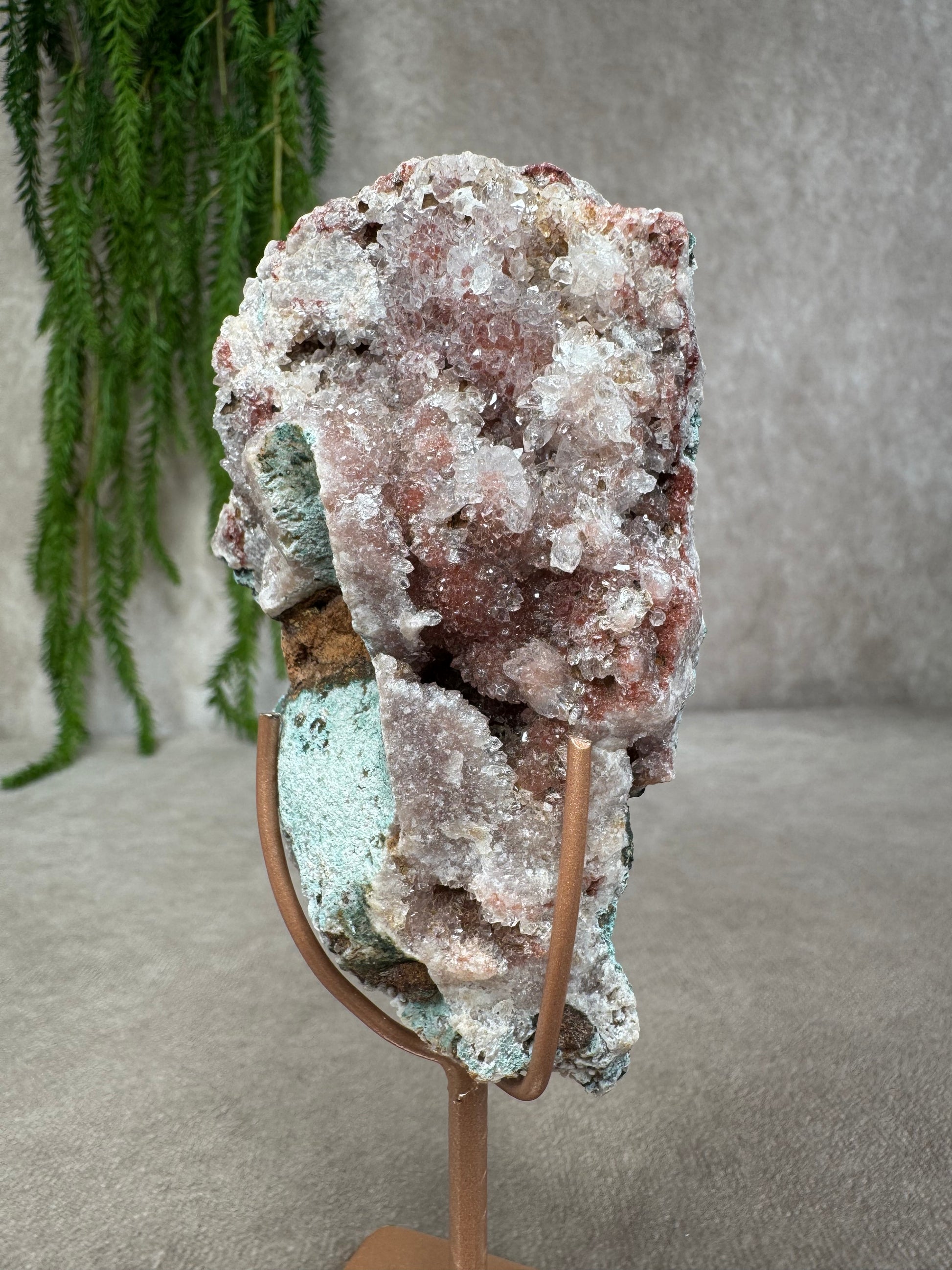 Deze prachtige roze amethist cluster is een elegant stuk met warme roze en roodachtige tinten en een hele fijne, fonkelende druzy die het licht op een subtiele manier vangt. Het stuk is 13,7 cm hoog en 5 cm breed, en staat op een bijpassende standaard waardoor het direct klaar is om neer te zetten.
