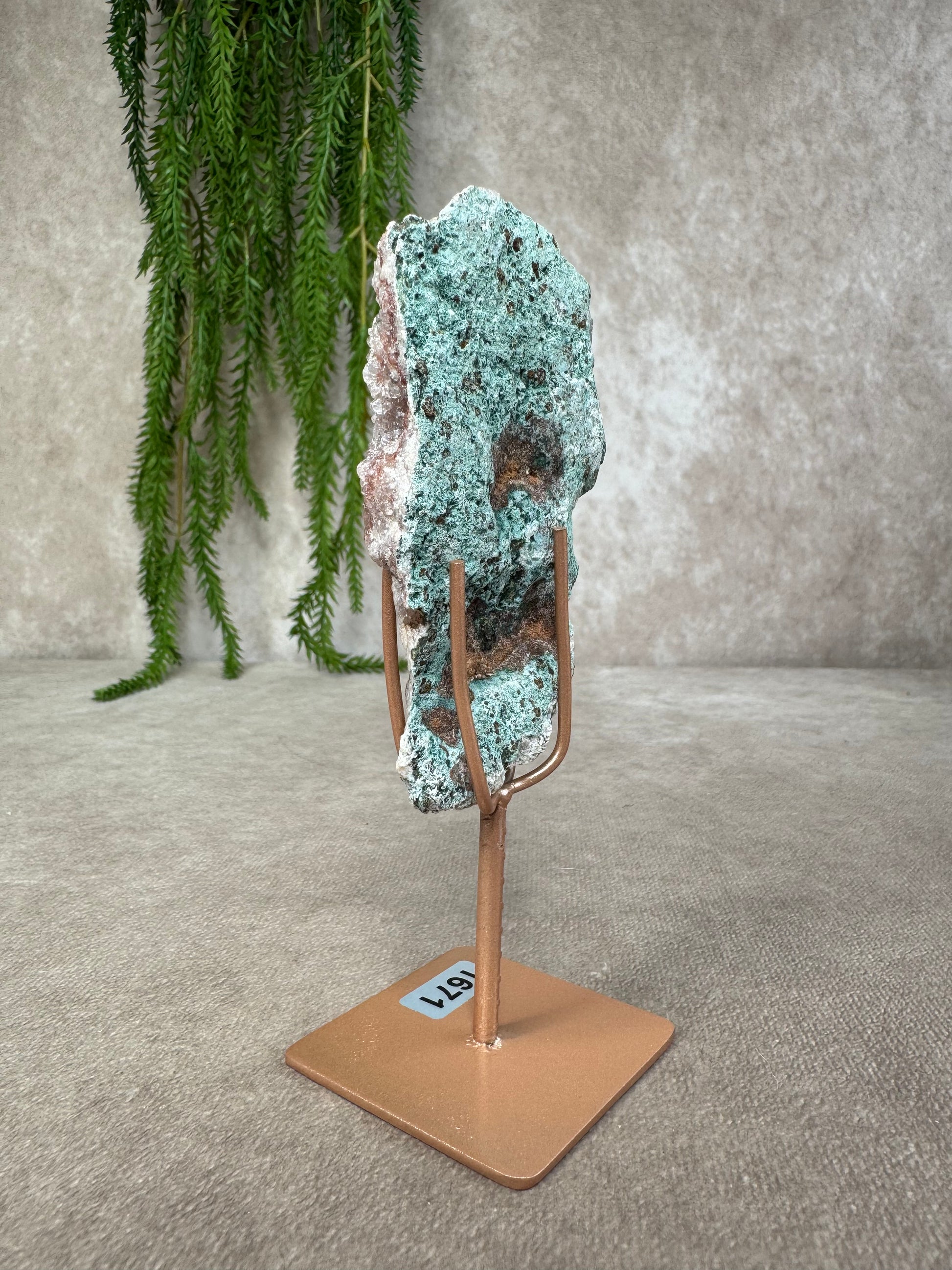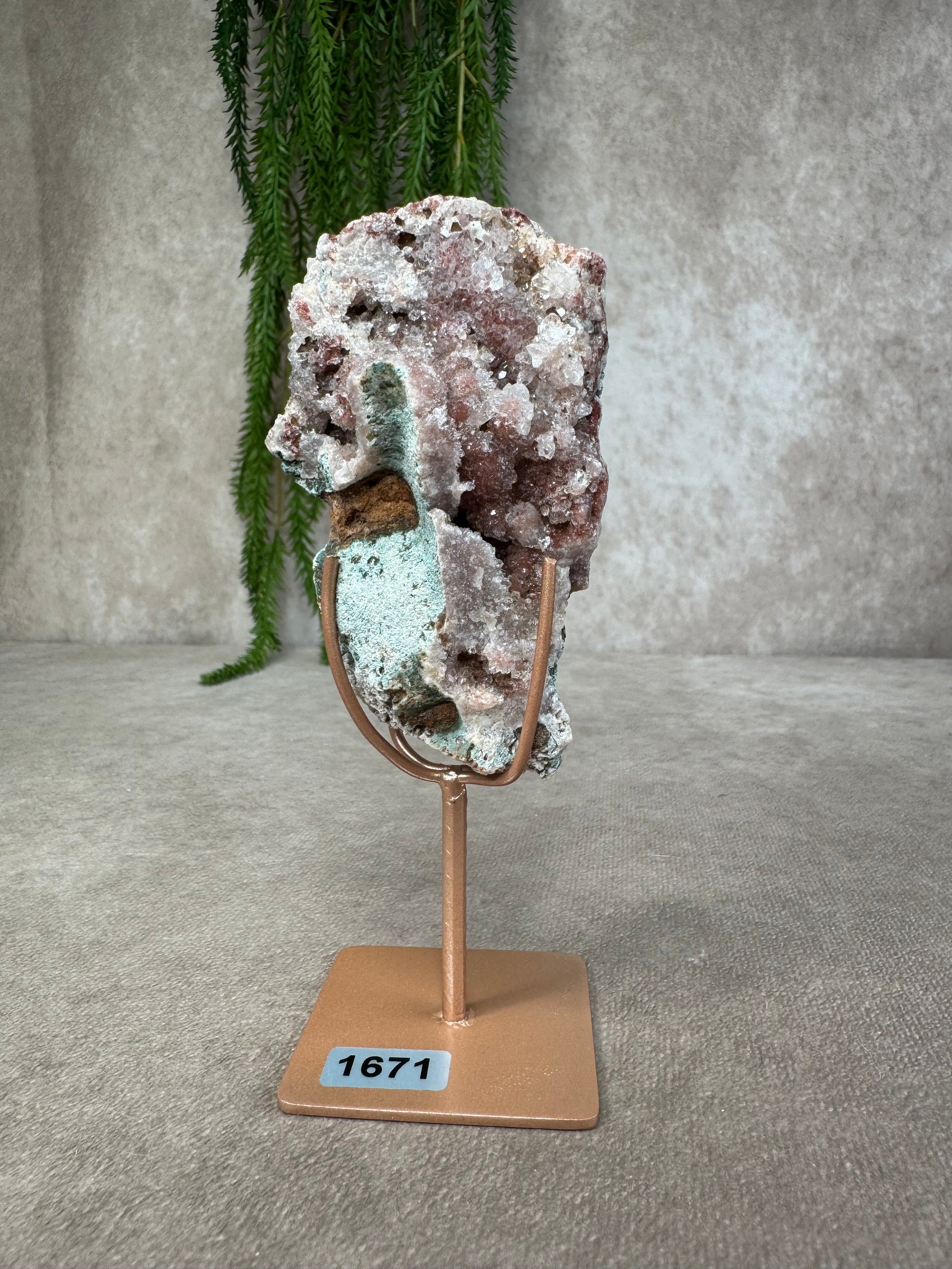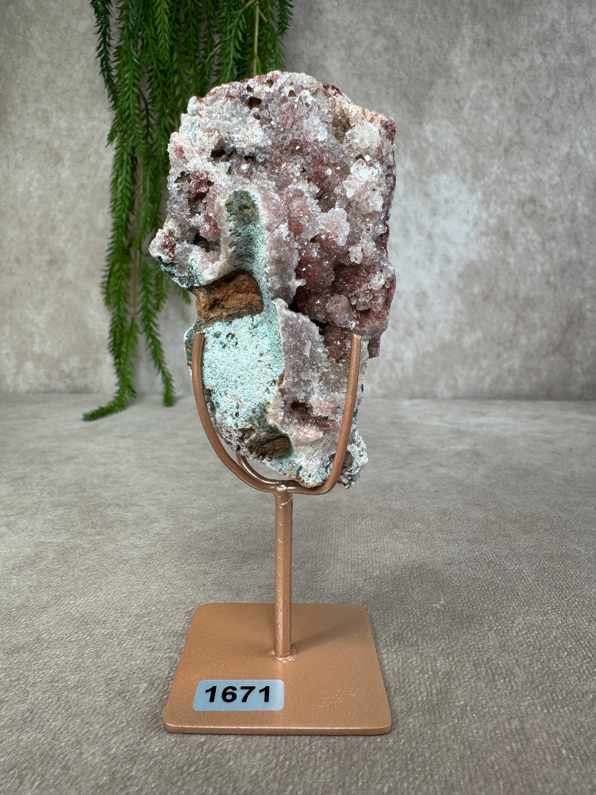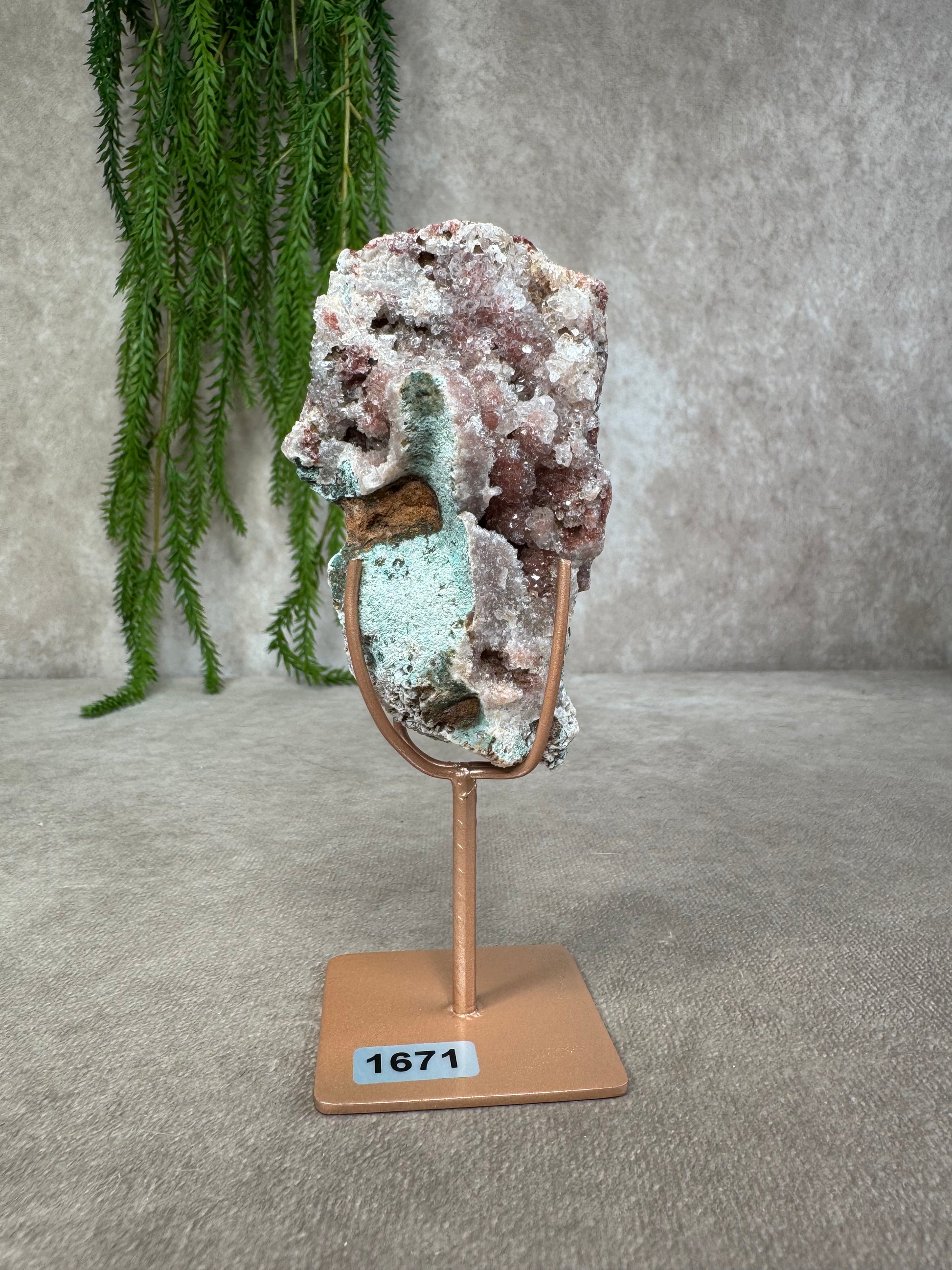 Deze prachtige roze amethist cluster is een elegant stuk met warme roze en roodachtige tinten en een hele fijne, fonkelende druzy die het licht op een subtiele manier vangt. Het stuk is 13,7 cm hoog en 5 cm breed, en staat op een bijpassende standaard waardoor het direct klaar is om neer te zetten.