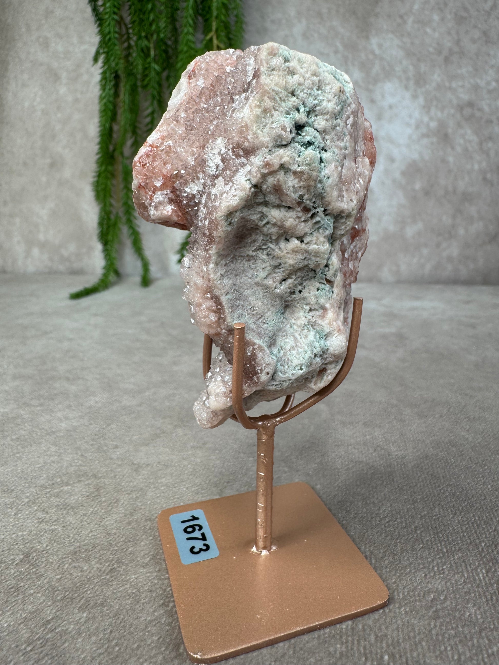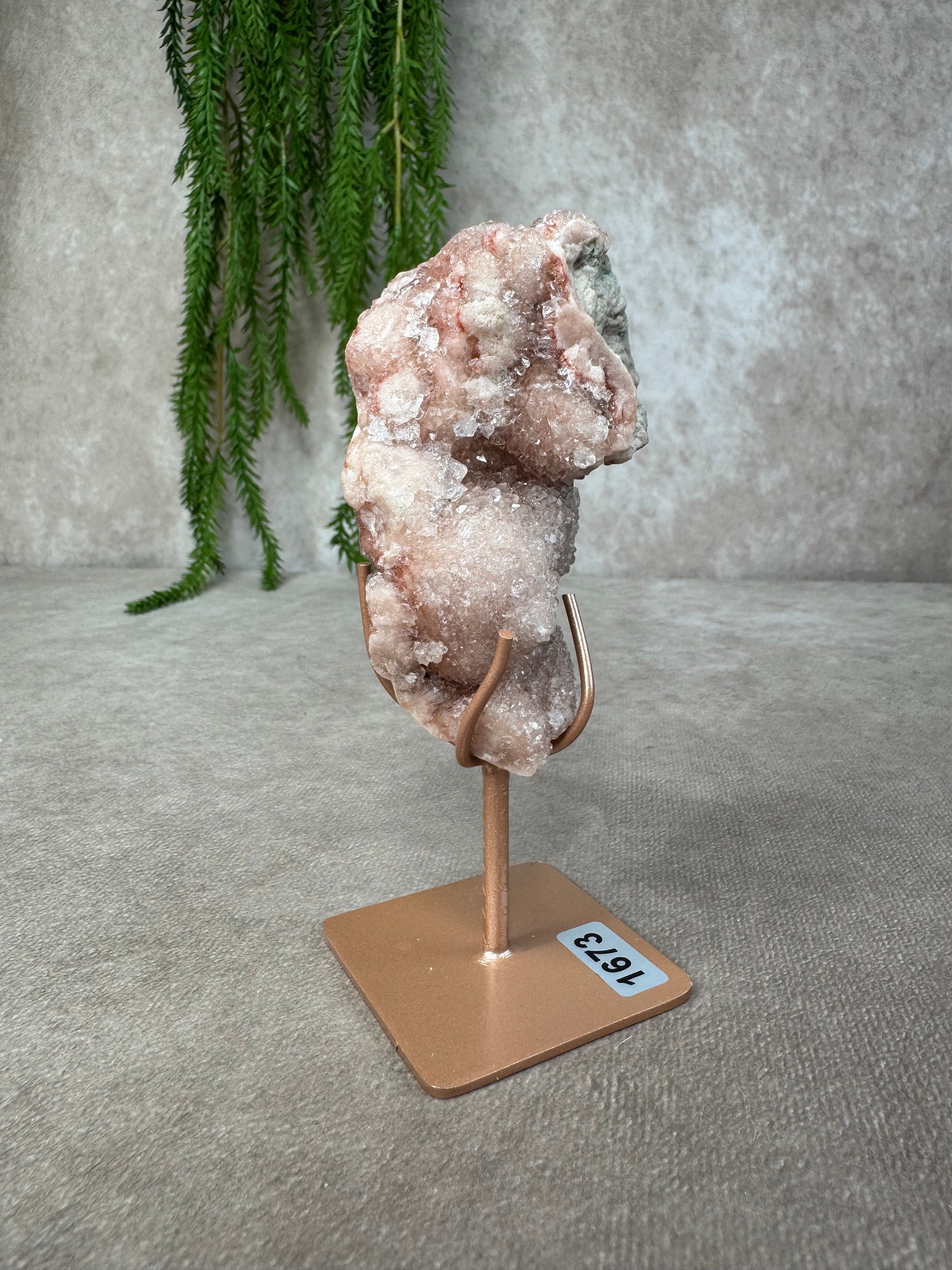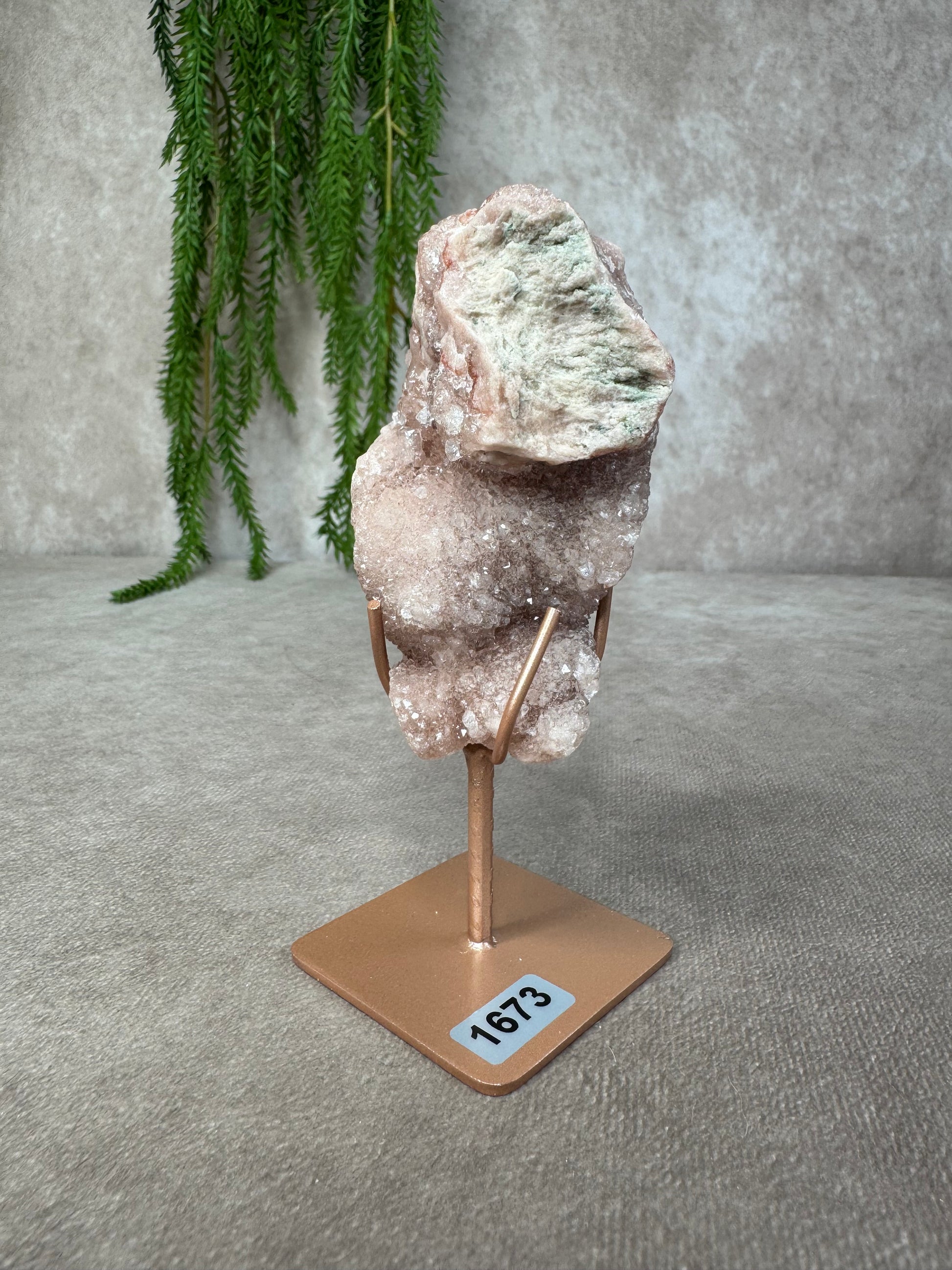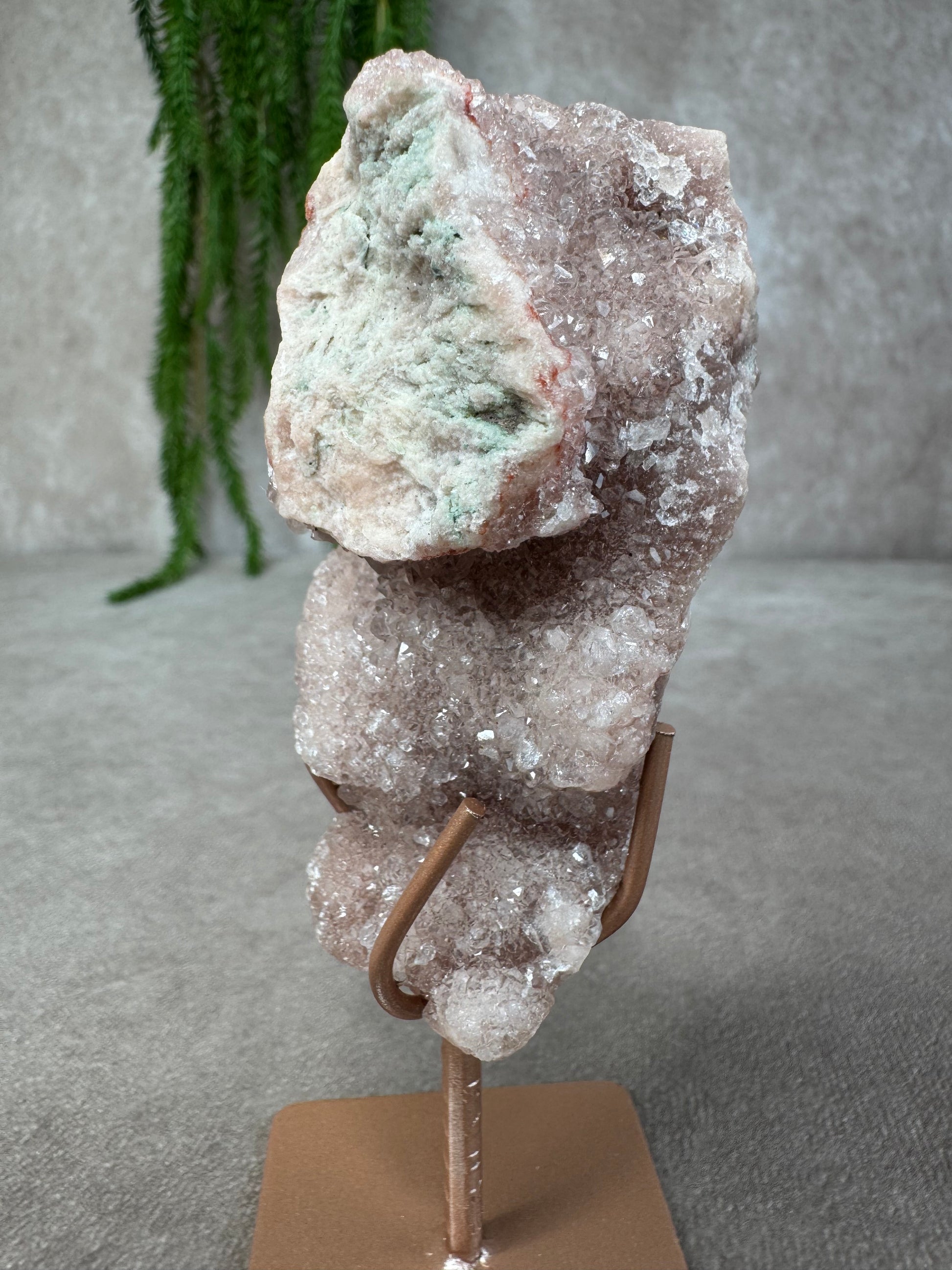 Deze roze amethist cluster is een subtiel en elegant stuk van 12,6 cm hoog en 5 cm breed, met een heel lichte, zachte roze kleur en fijne kristalstructuren die prachtig glanzen in het licht. Geplaatst op een bijpassende standaard komt dit natuurlijke kunstwerk perfect tot zijn recht.