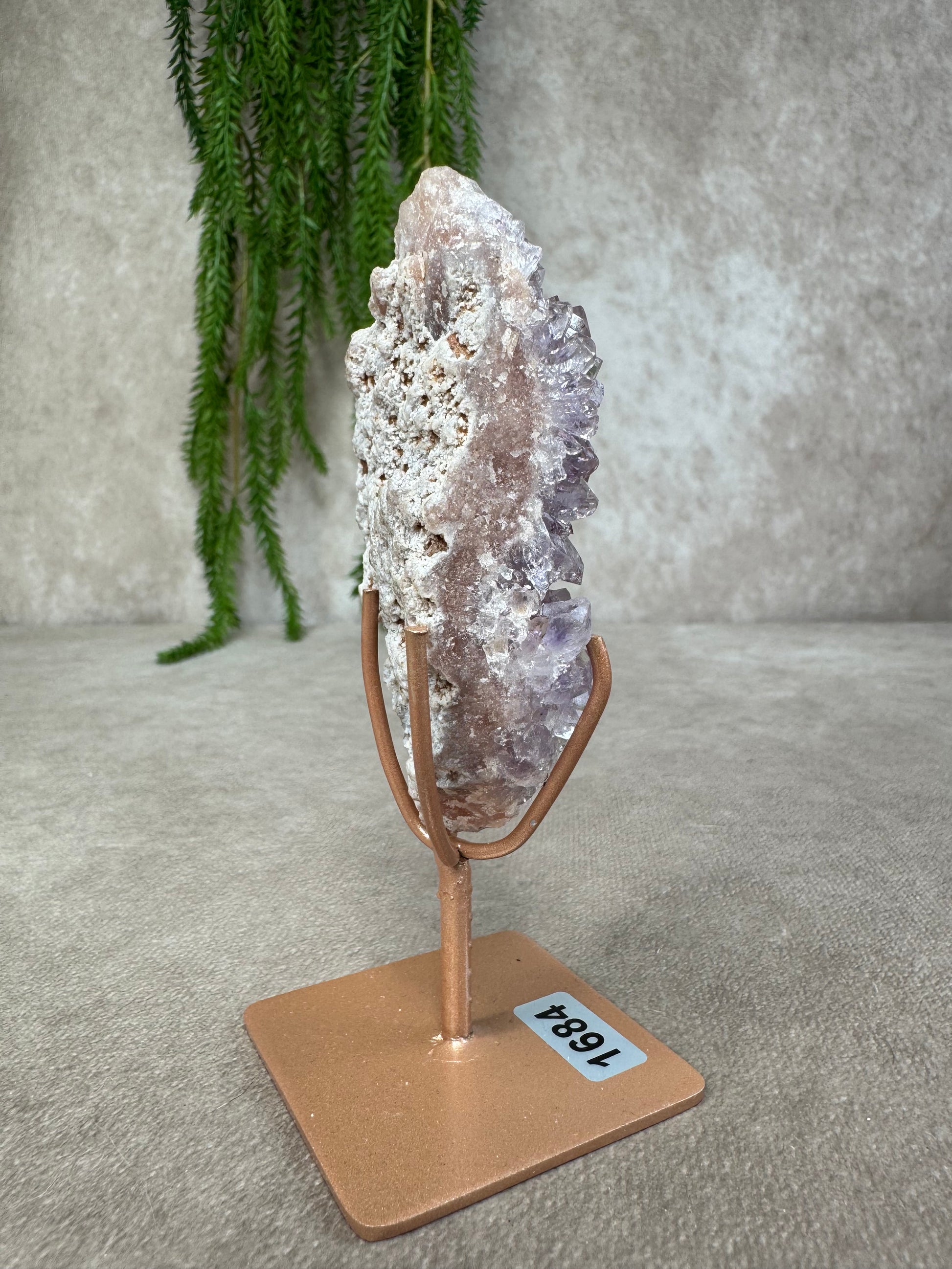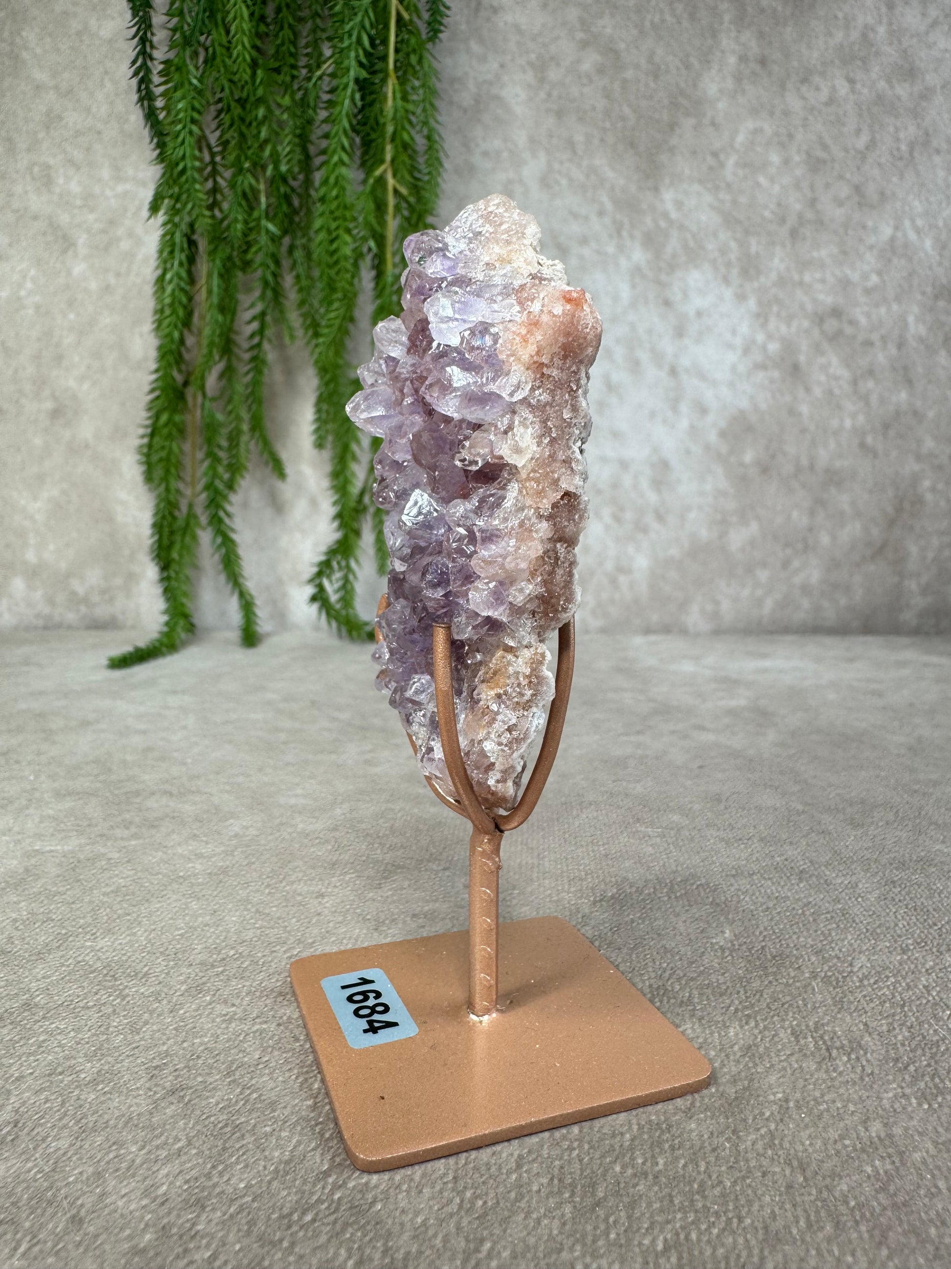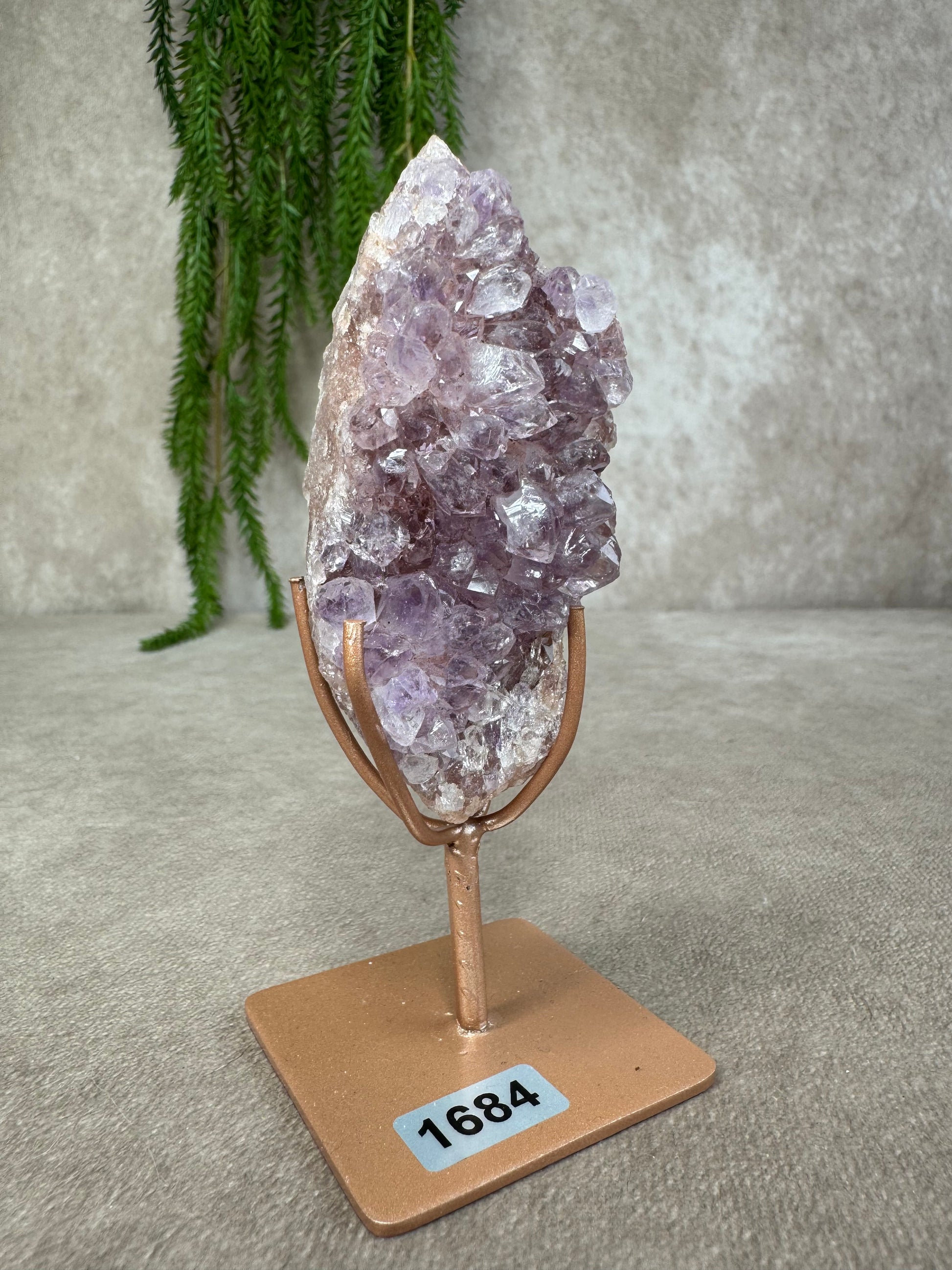 Deze prachtige roze amethist cluster is een elegant en verfijnd stuk van 11,7 cm hoog en 4,9 cm breed, geplaatst op een bijpassende standaard. De cluster toont zachte roze tinten met natuurlijke kristalstructuren die prachtig fonkelen in het licht.