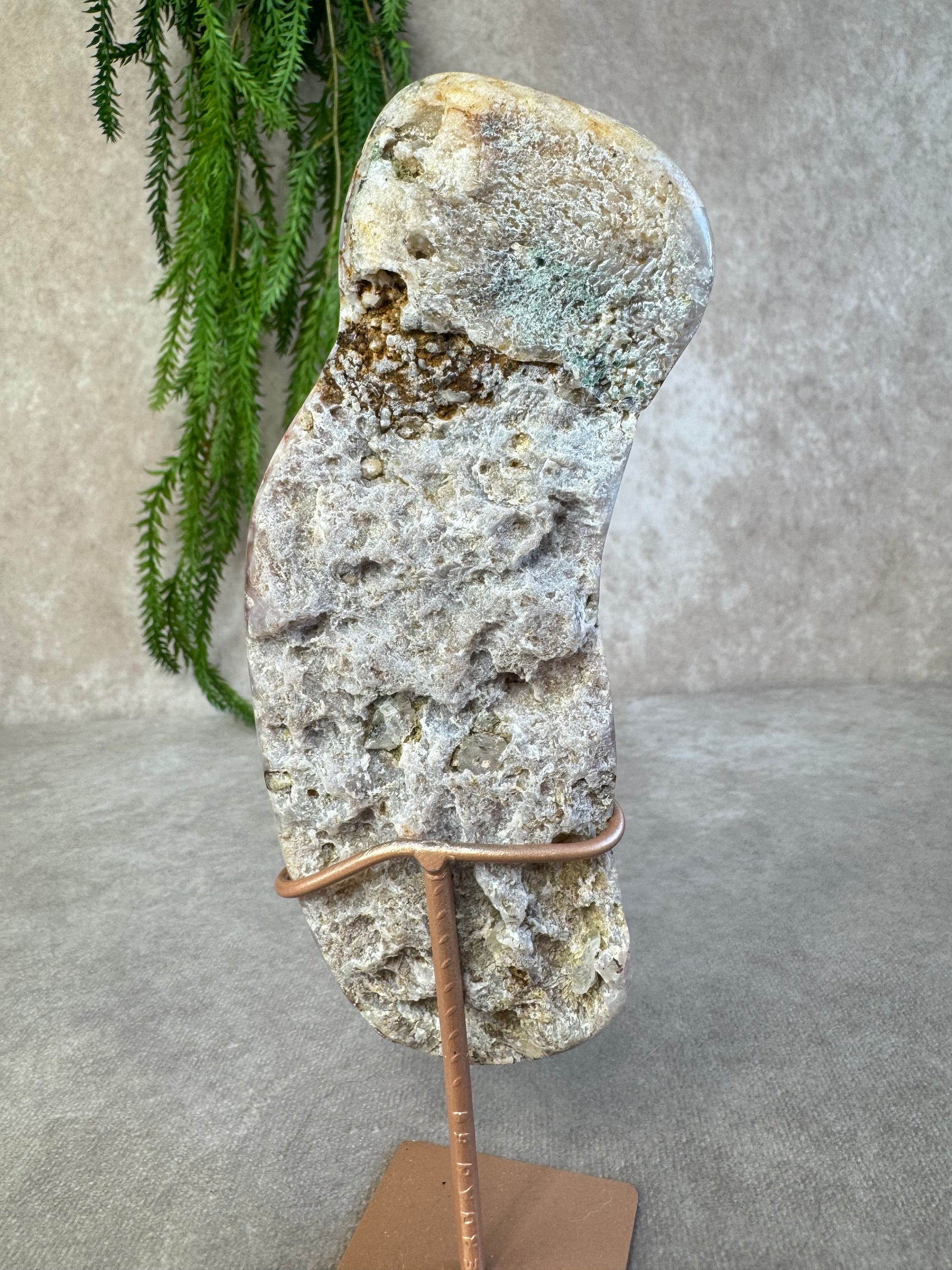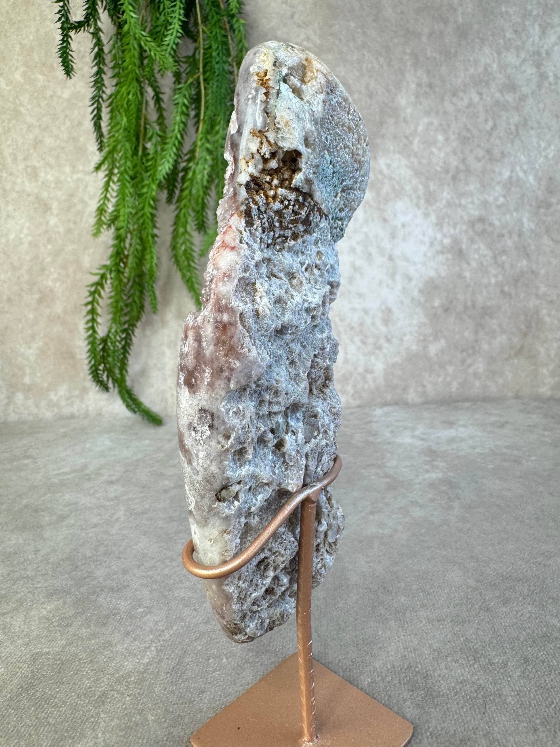 Chalcedoon staat bekend om zijn rustgevende en harmoniserende energie. In slabvorm komt de schoonheid van de steen extra goed tot zijn recht, waardoor dit stuk ideaal is als decoratief object of voor energetisch gebruik.