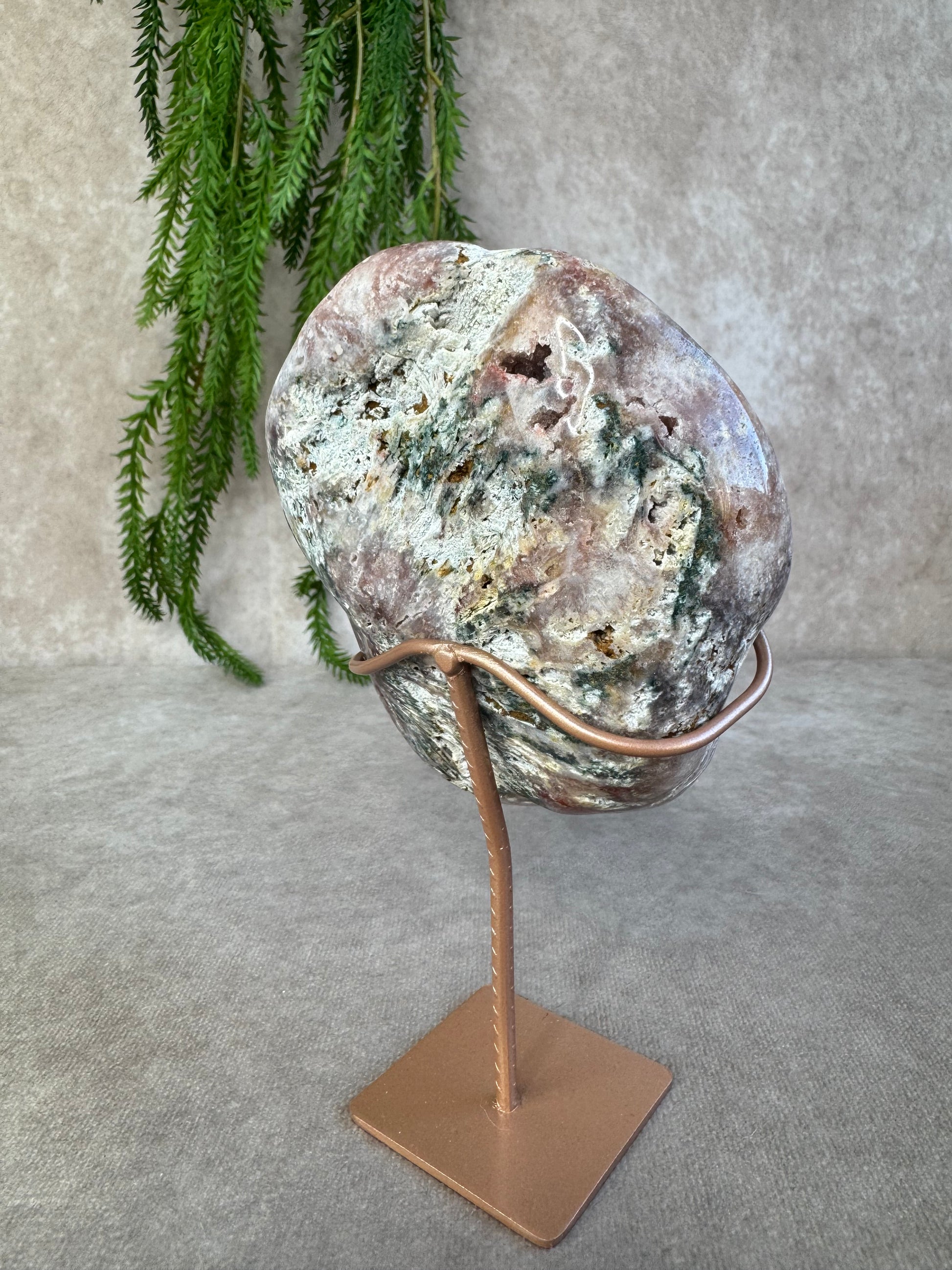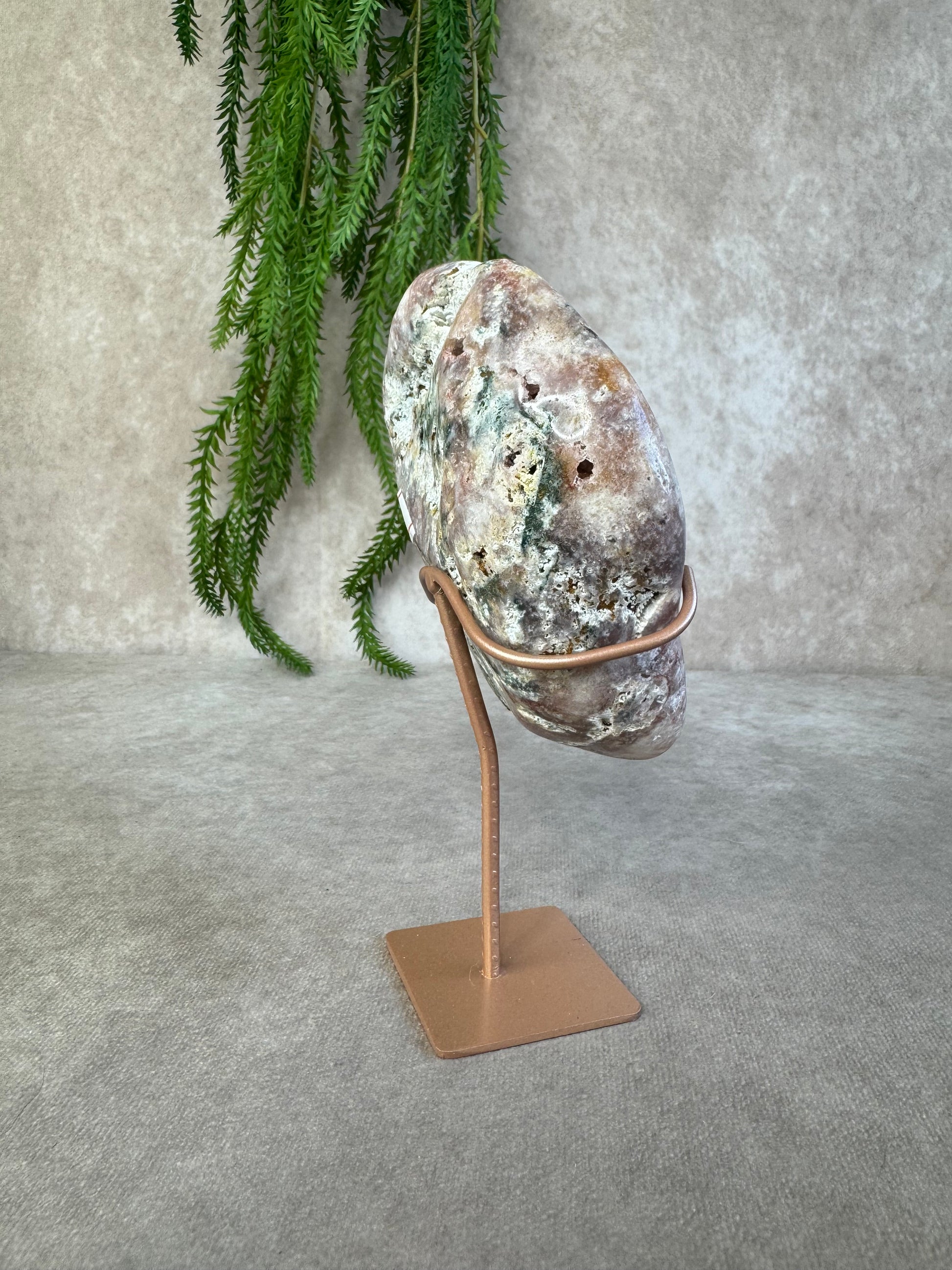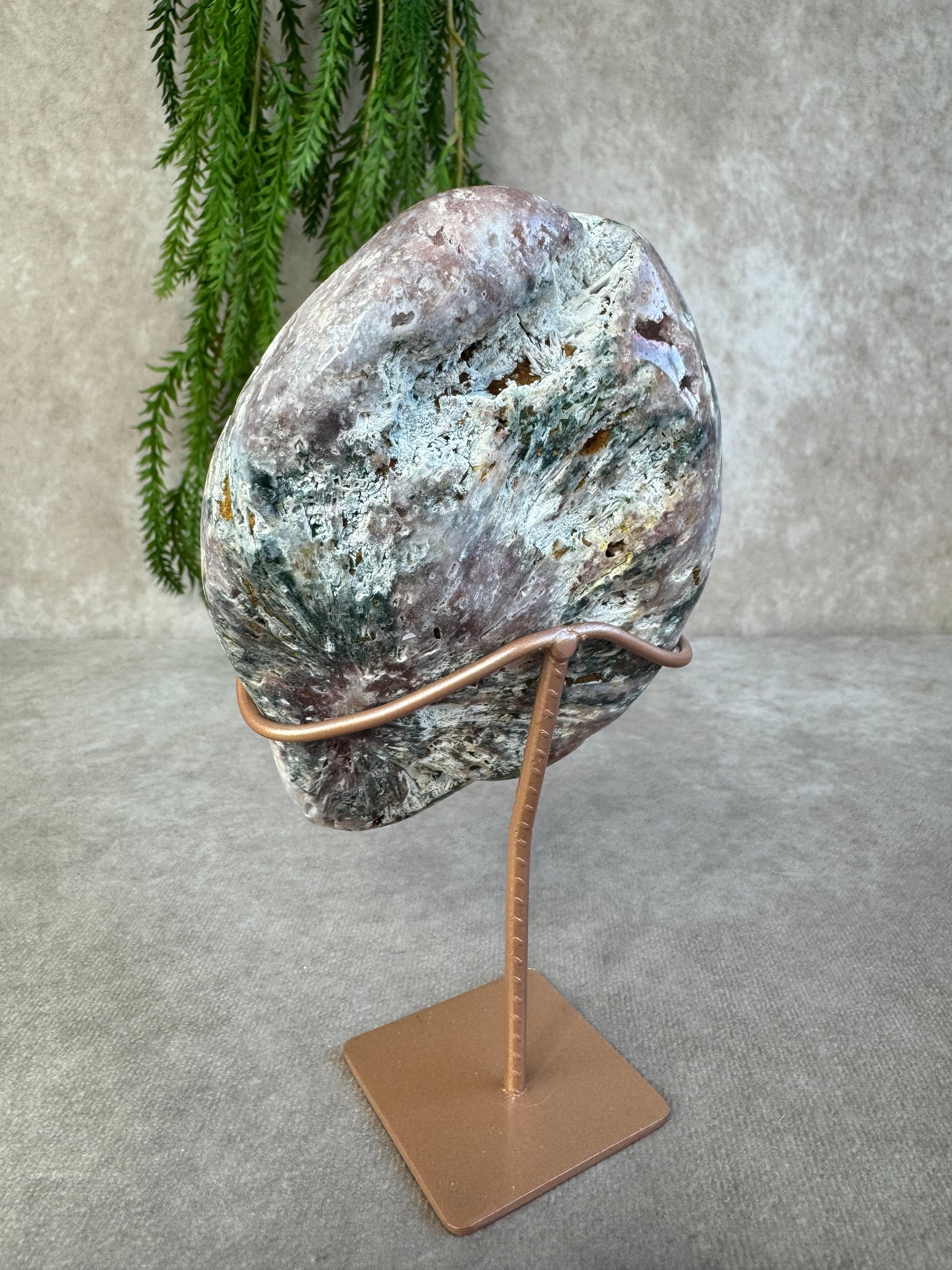 Chalcedoon staat bekend om zijn rustgevende en harmoniserende energie. In slabvorm komt de schoonheid van de steen extra goed tot zijn recht, waardoor dit stuk ideaal is als decoratief object of voor energetisch gebruik.