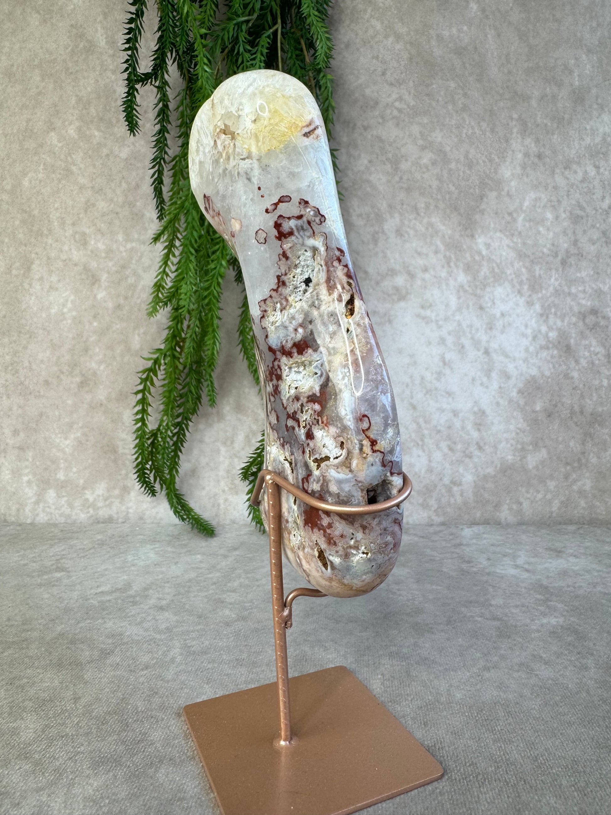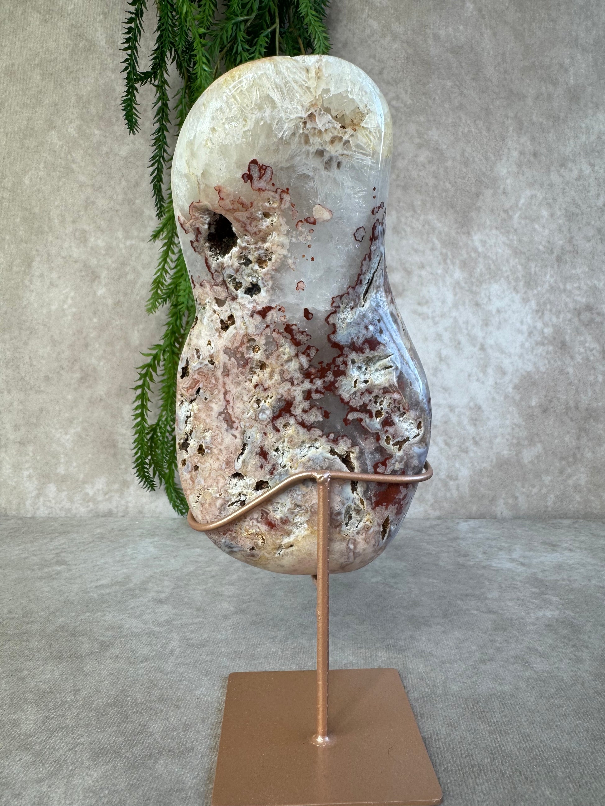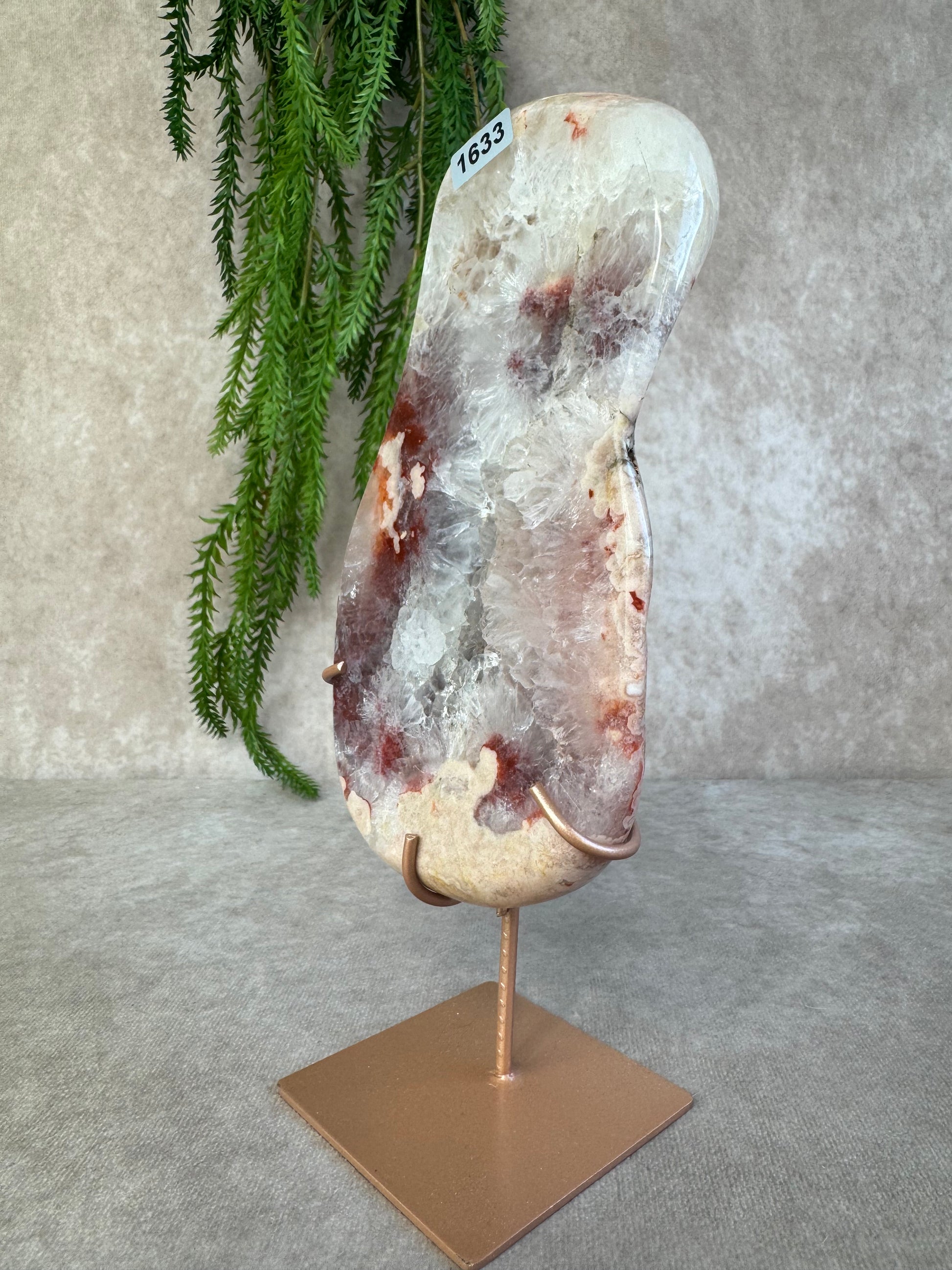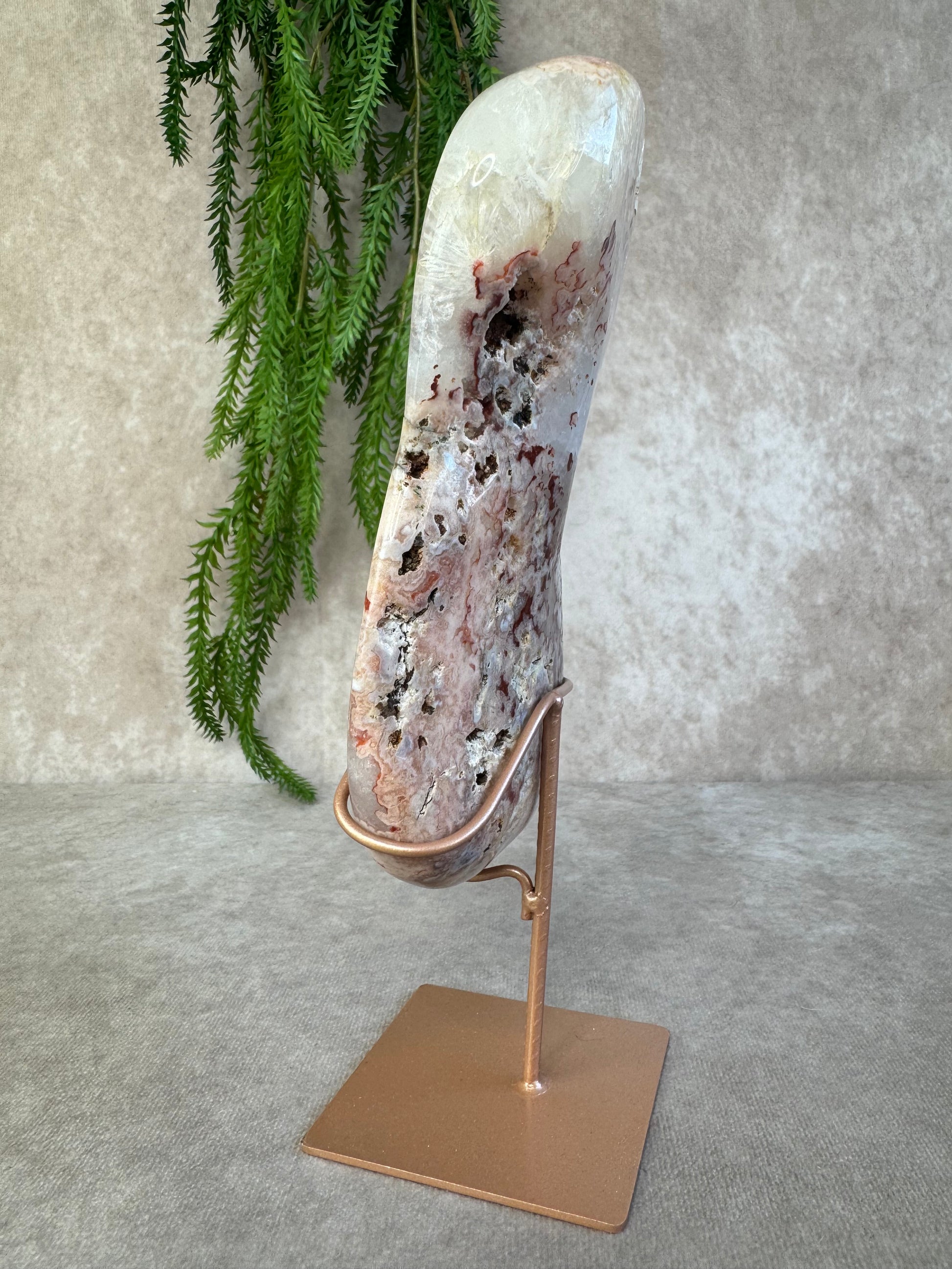 Chalcedoon staat bekend om zijn rustgevende en harmoniserende energie. In slabvorm komt de schoonheid van de steen extra goed tot zijn recht, waardoor dit stuk ideaal is als decoratief object of voor energetisch gebruik.