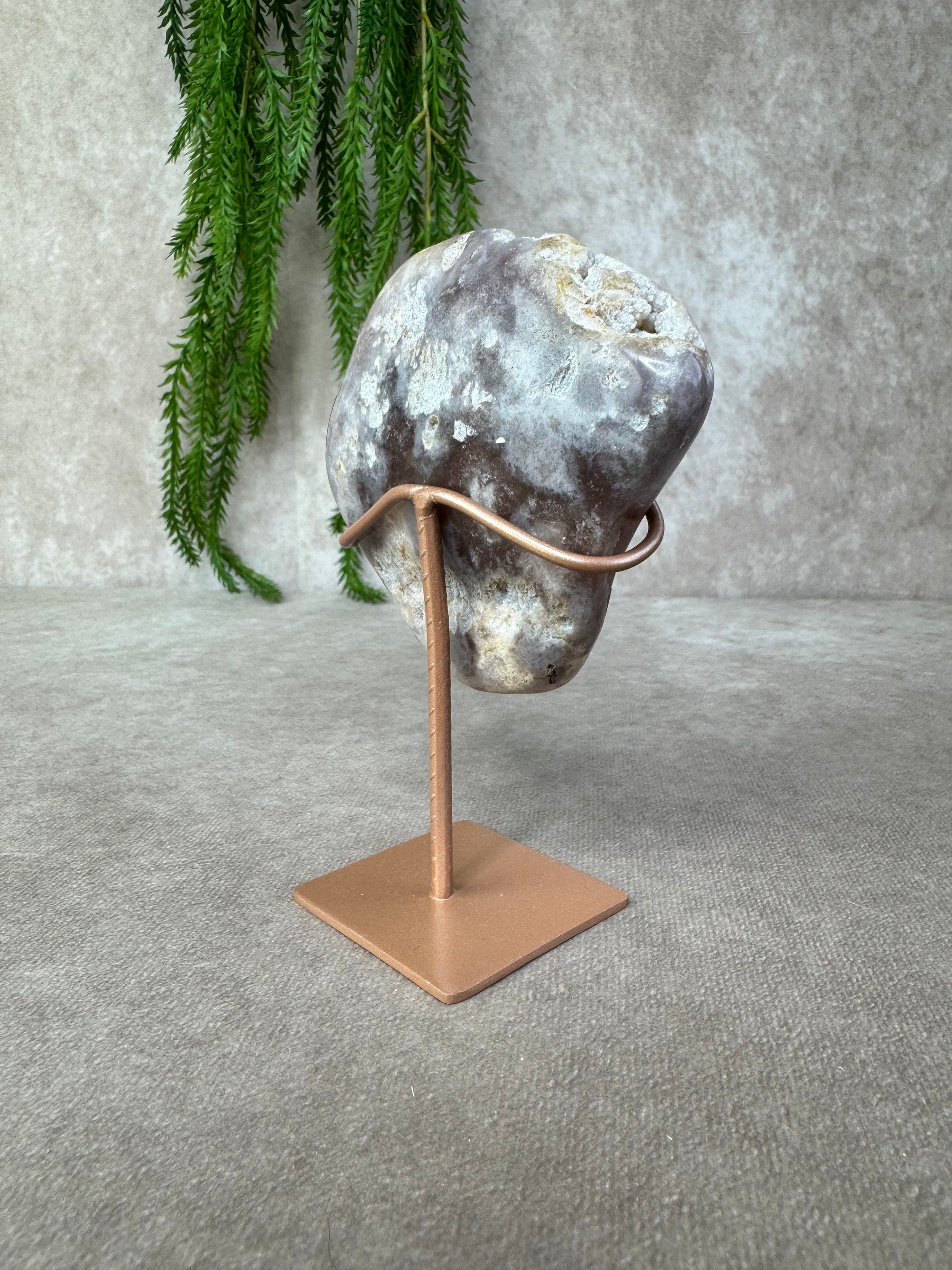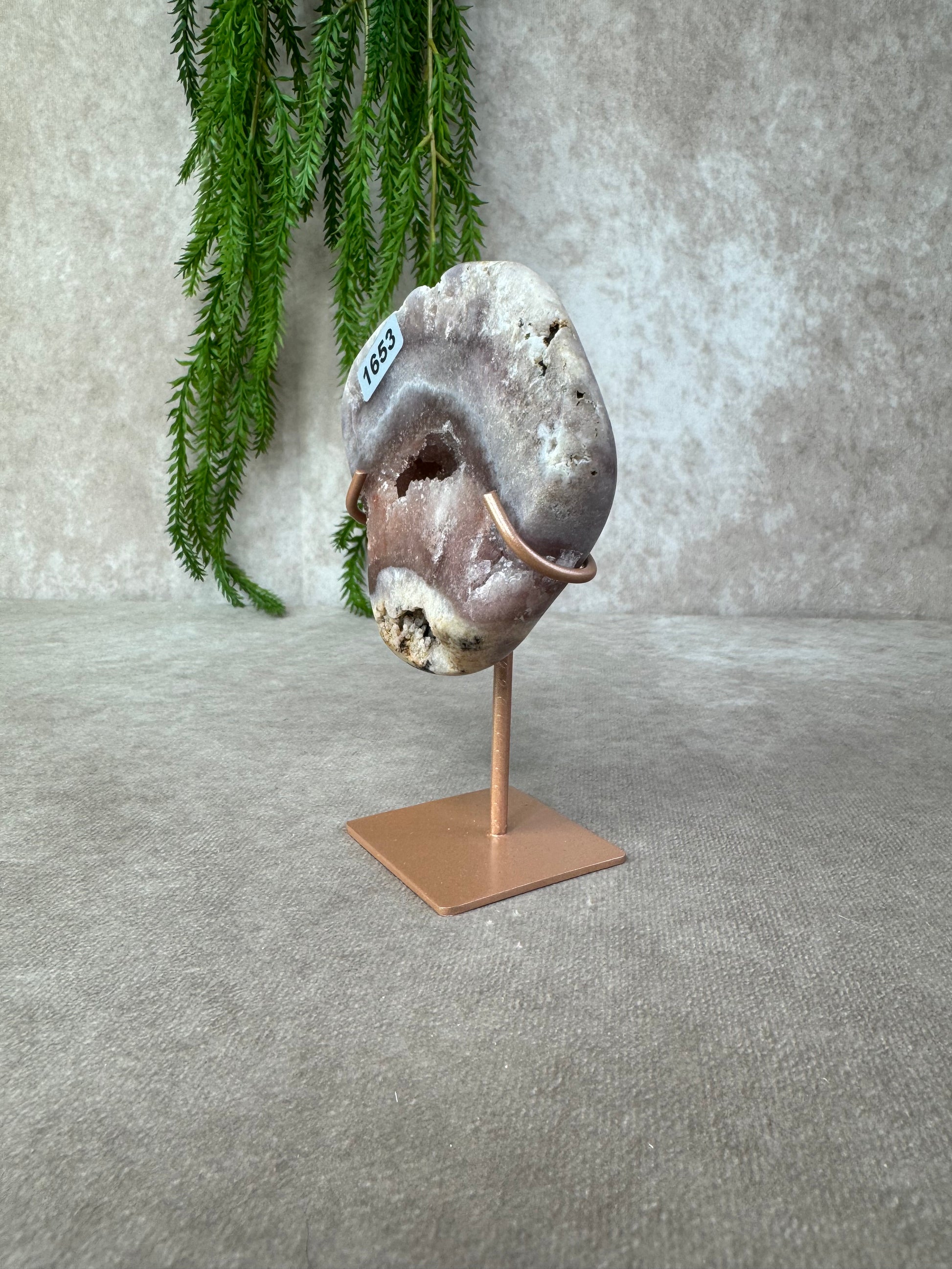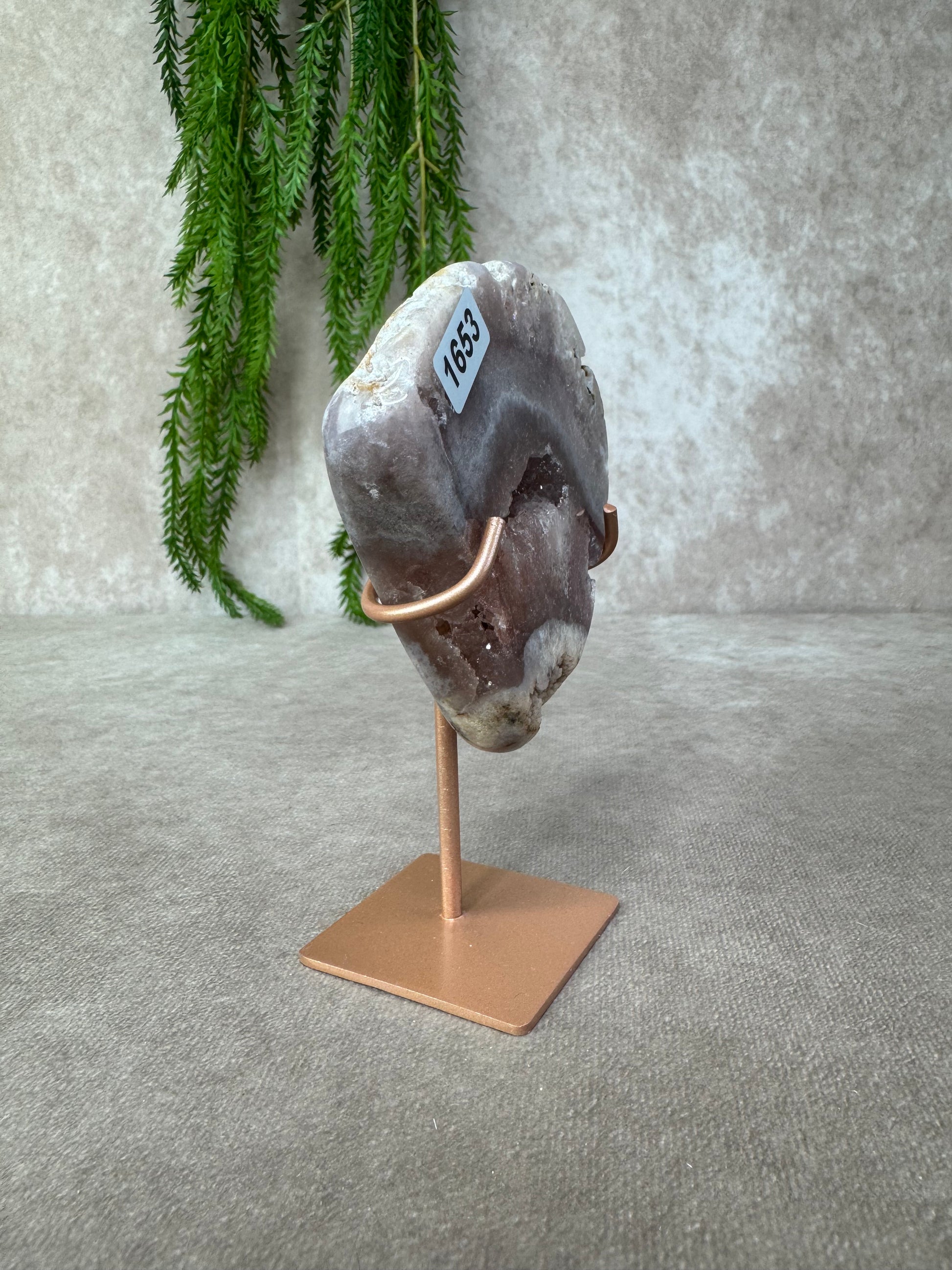 Hoewel dit kristal bekendstaat onder de naam roze amethist, is dat eigenlijk een handelsnaam de steen bestaat in werkelijkheid uit chalcedoon. Dit maakt elk stuk bijzonder en uniek in kleur en textuur.