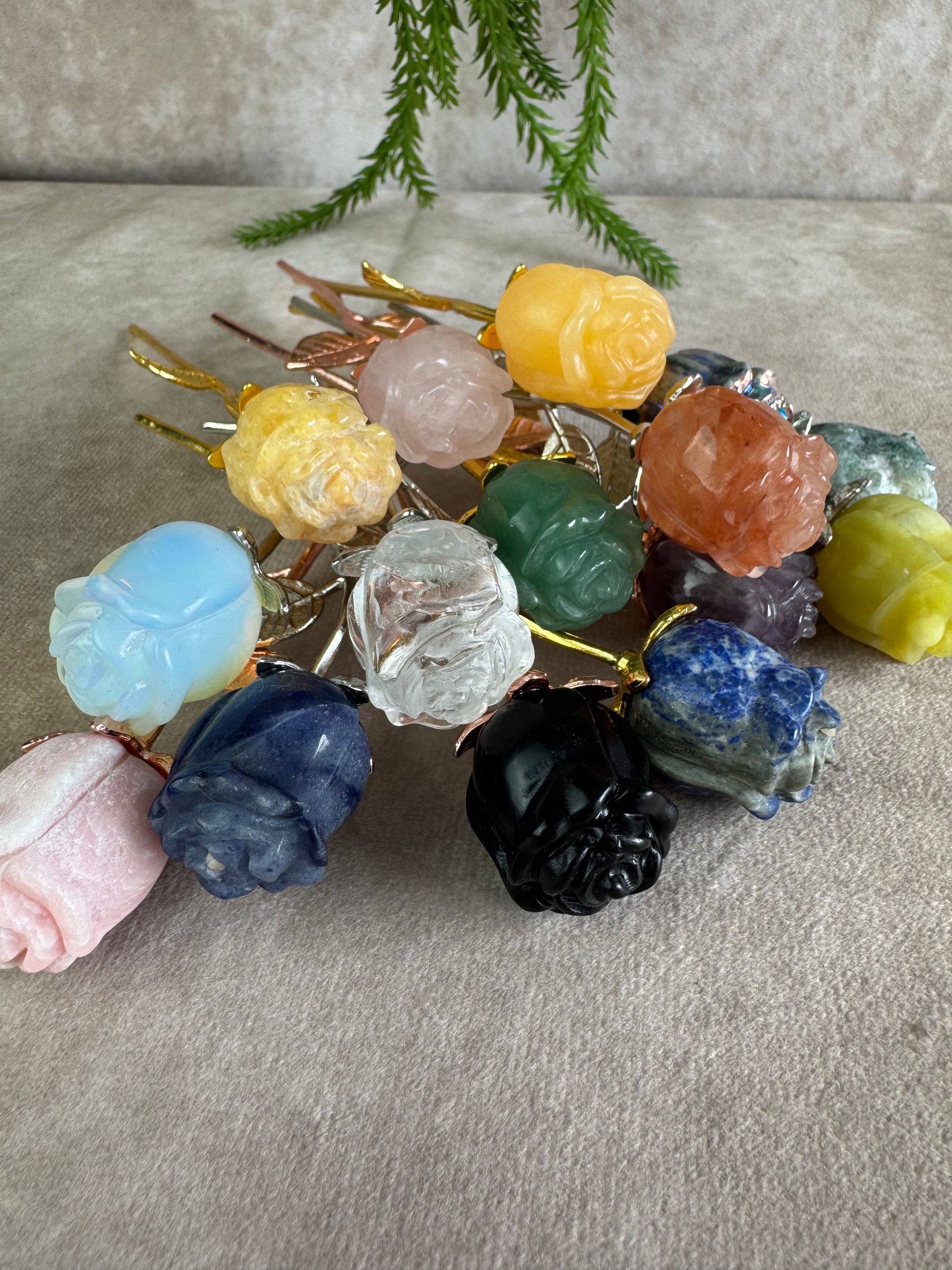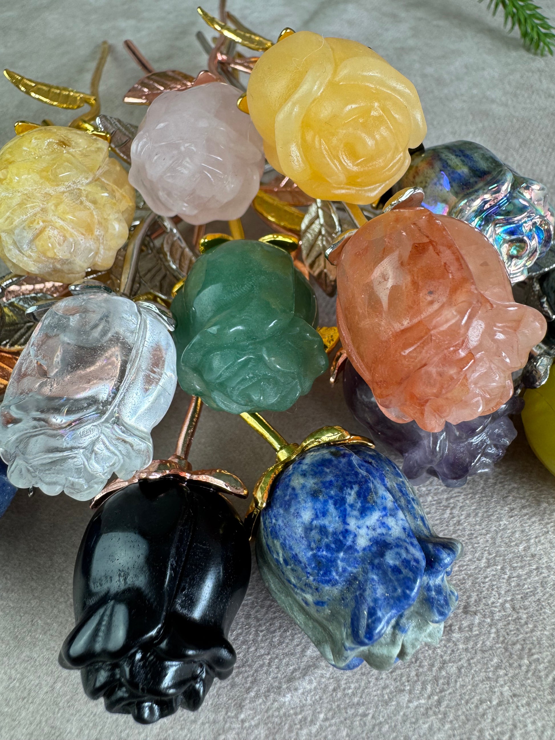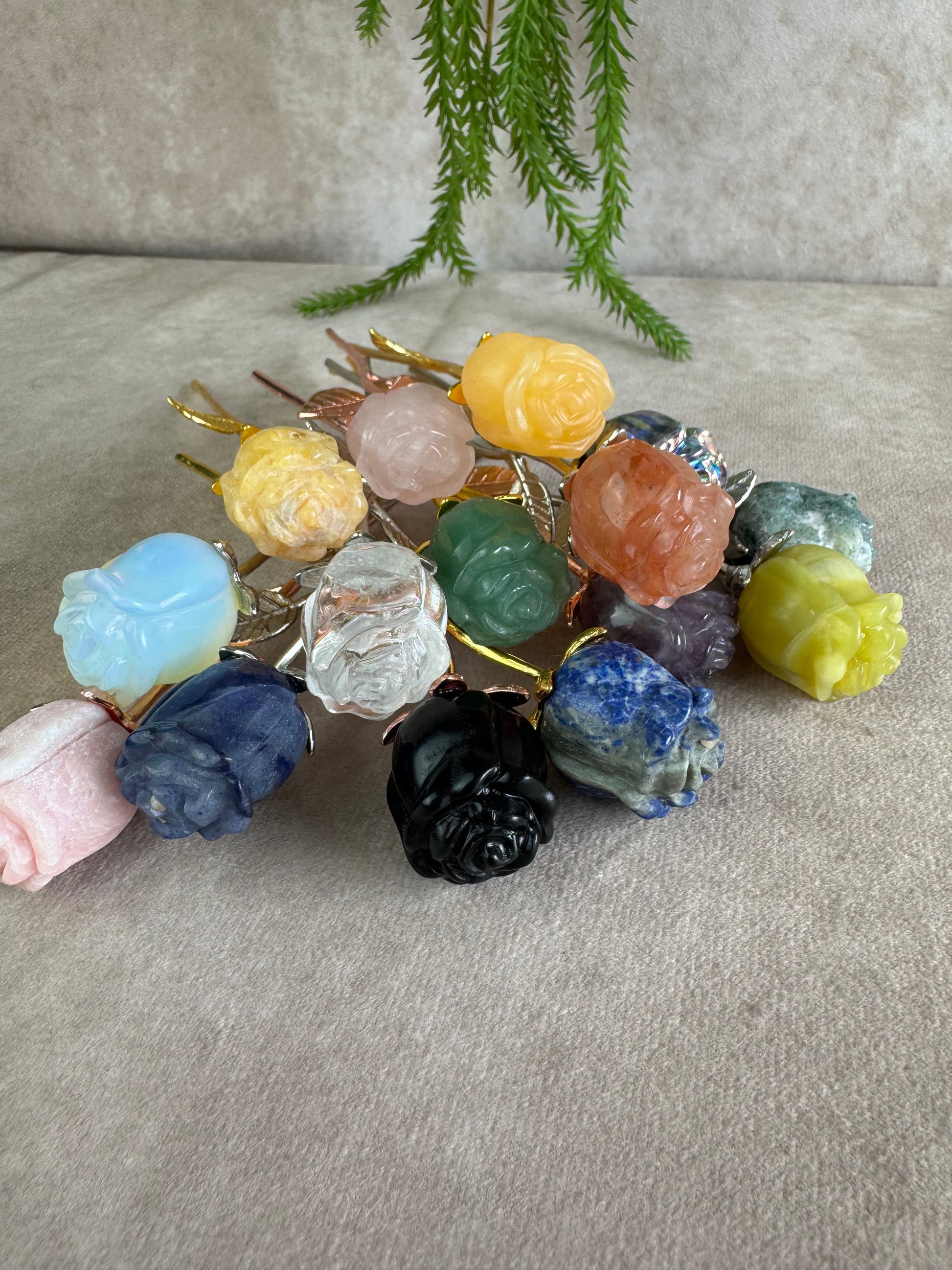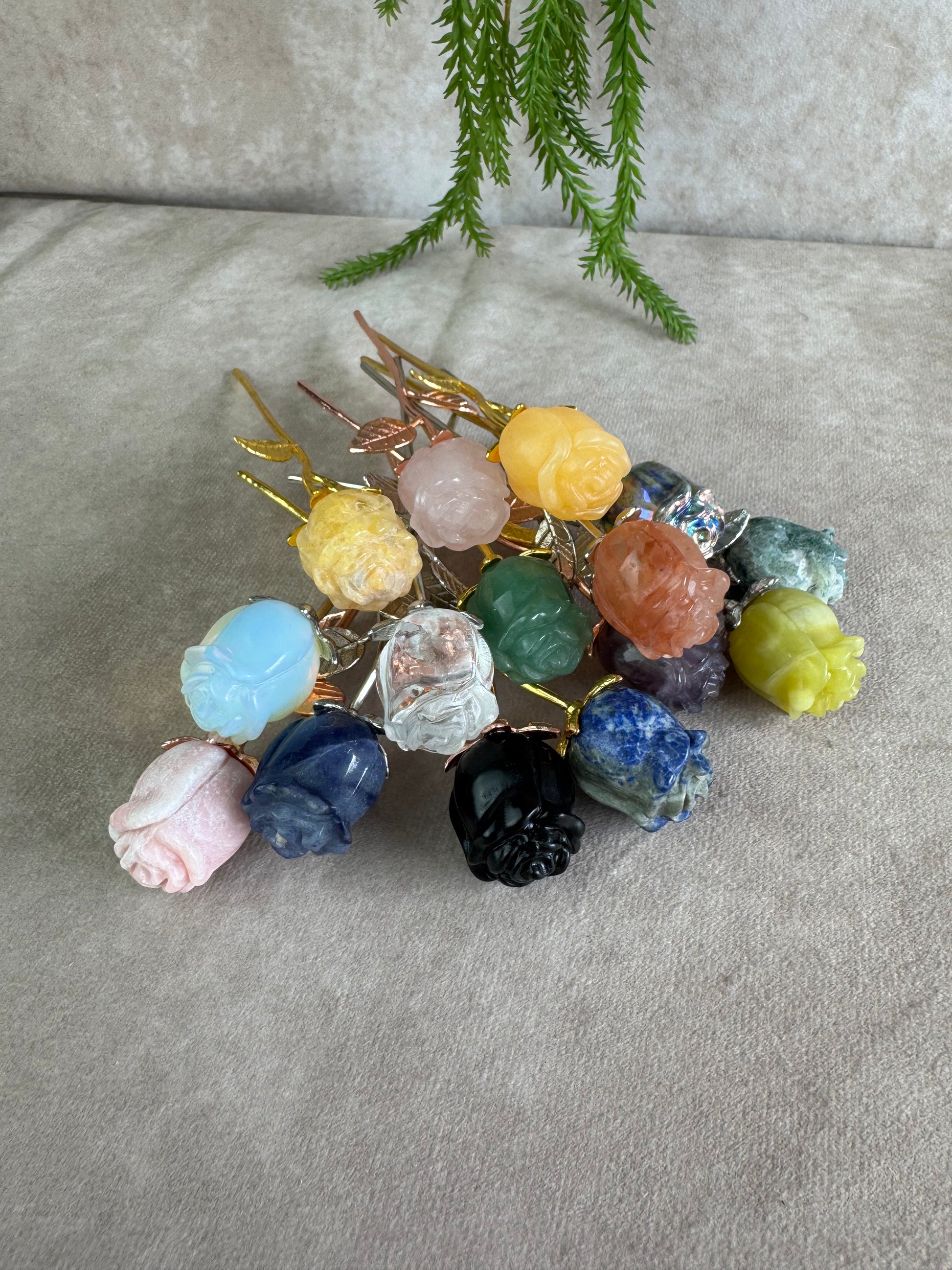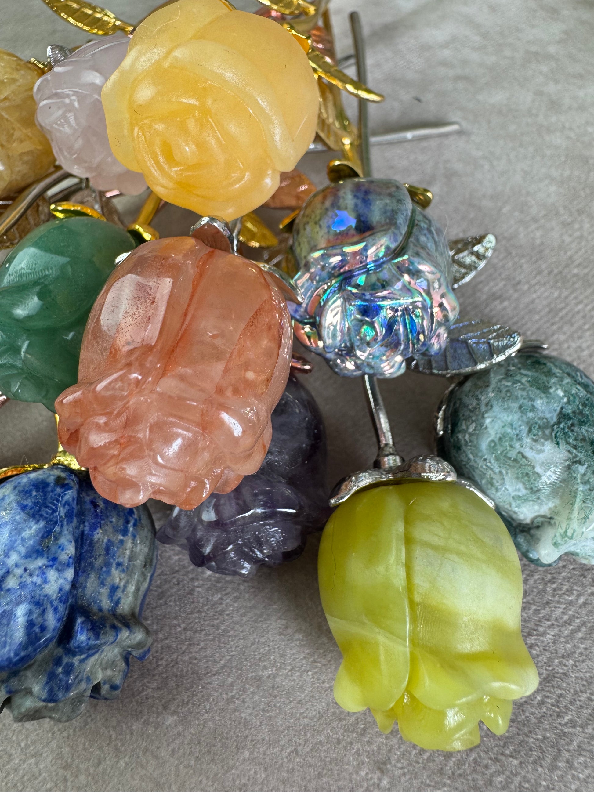 Deze prachtige edelstenen roosjes combineren de symboliek van de roos met de kracht van kristallen. Elke roos is met zorg geslepen uit een echte edelsteen en bevestigd op een verfijnde metalen steel in jouw keuze: goud, roségoud of zilver. Het resultaat is een tijdloos, elegant en energetisch waardevol decoratiestuk.