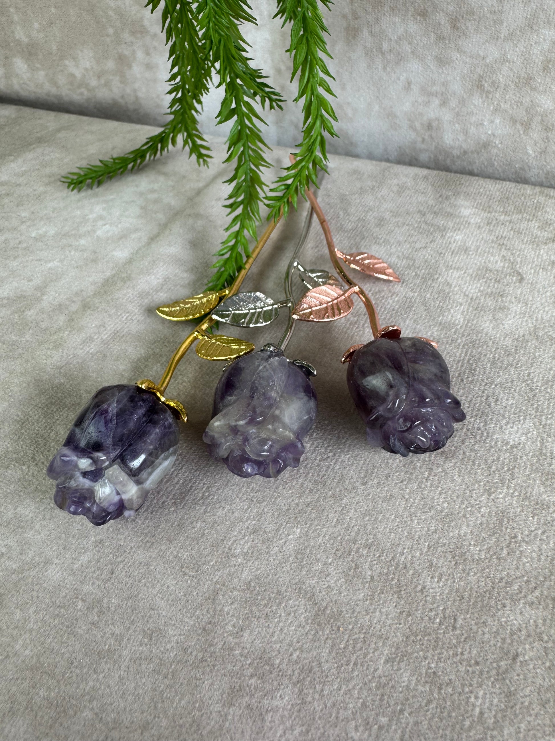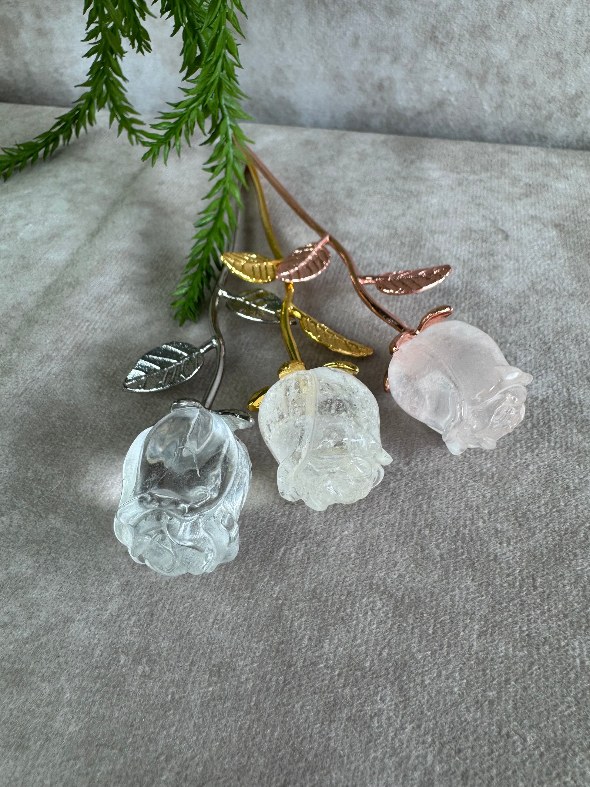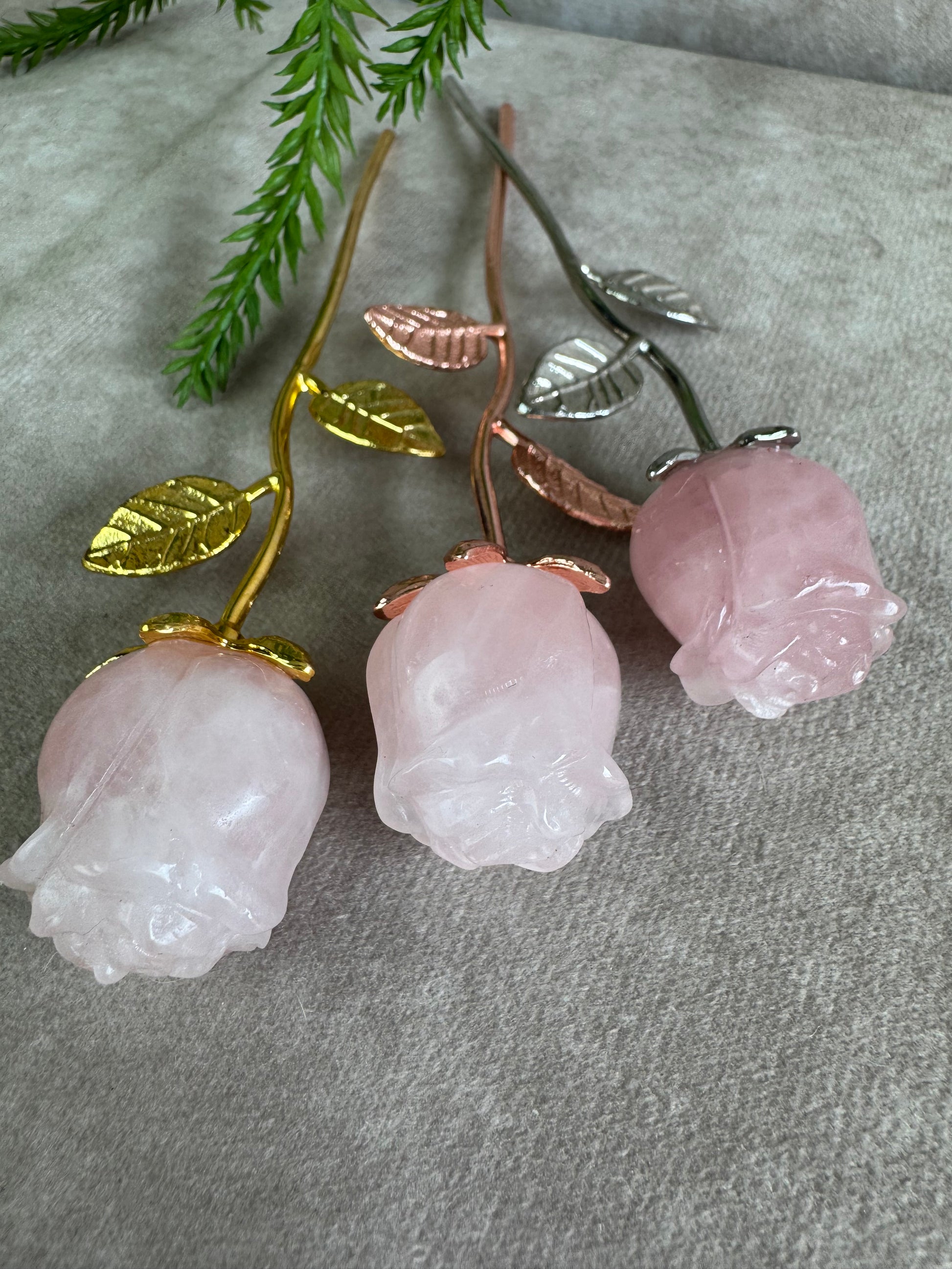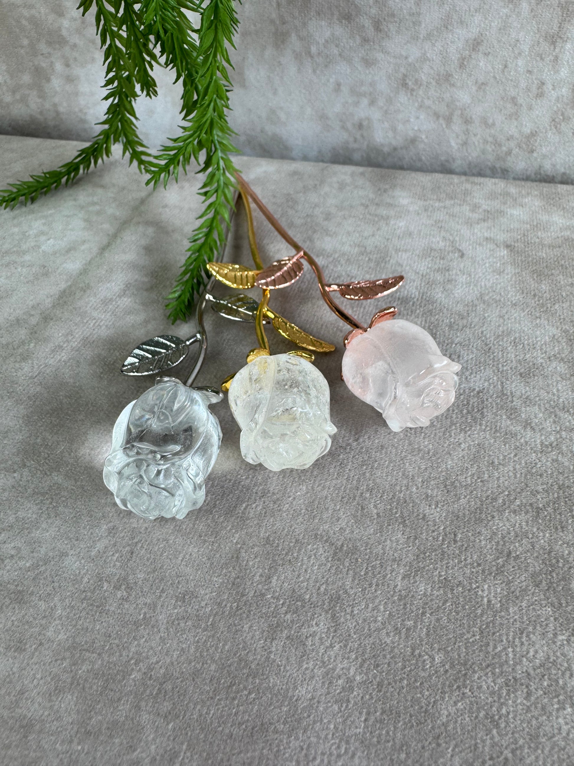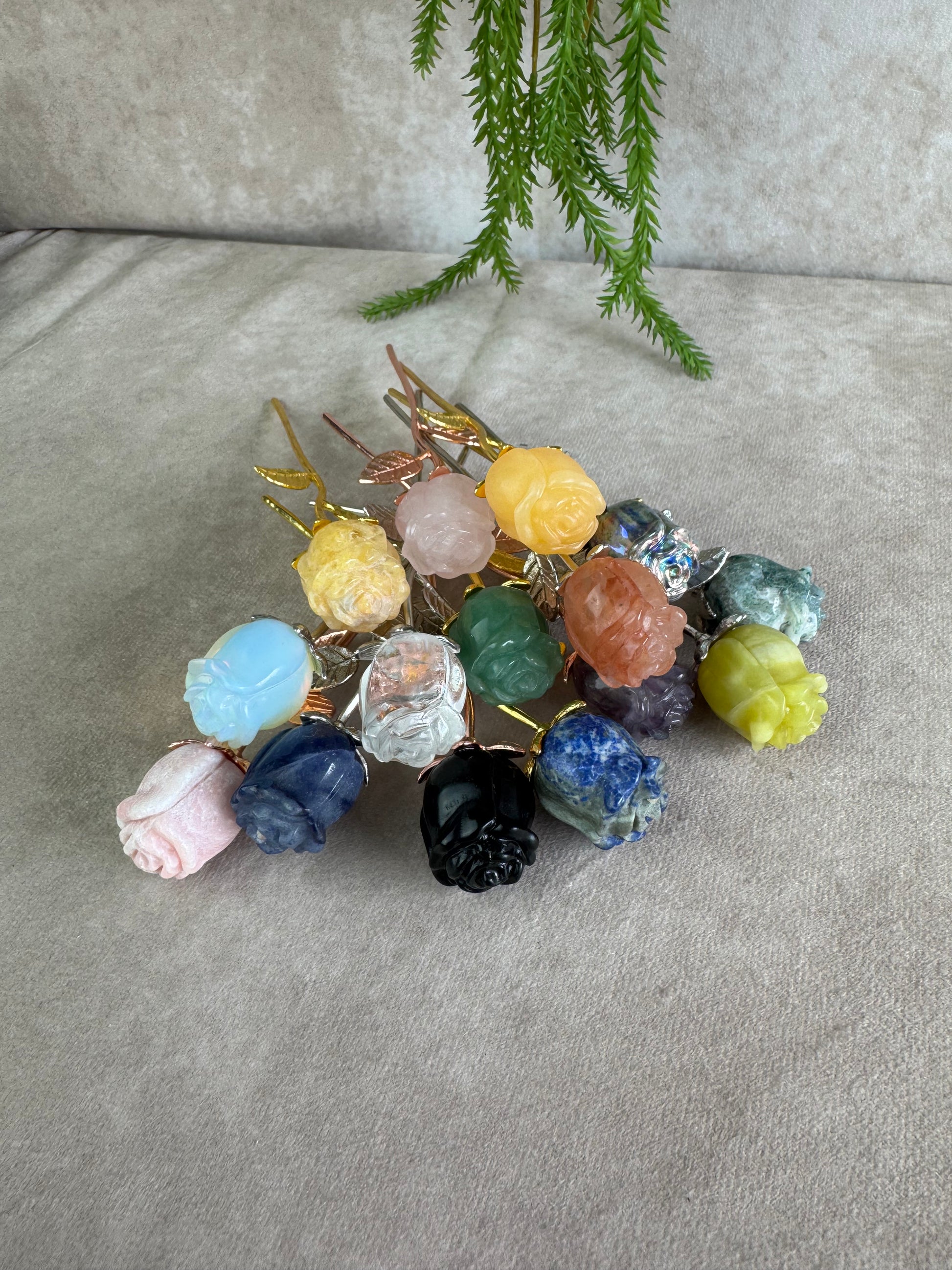 Deze prachtige edelstenen roosjes combineren de symboliek van de roos met de kracht van kristallen. Elke roos is met zorg geslepen uit een echte edelsteen en bevestigd op een verfijnde metalen steel in jouw keuze: goud, roségoud of zilver. Het resultaat is een tijdloos, elegant en energetisch waardevol decoratiestuk.