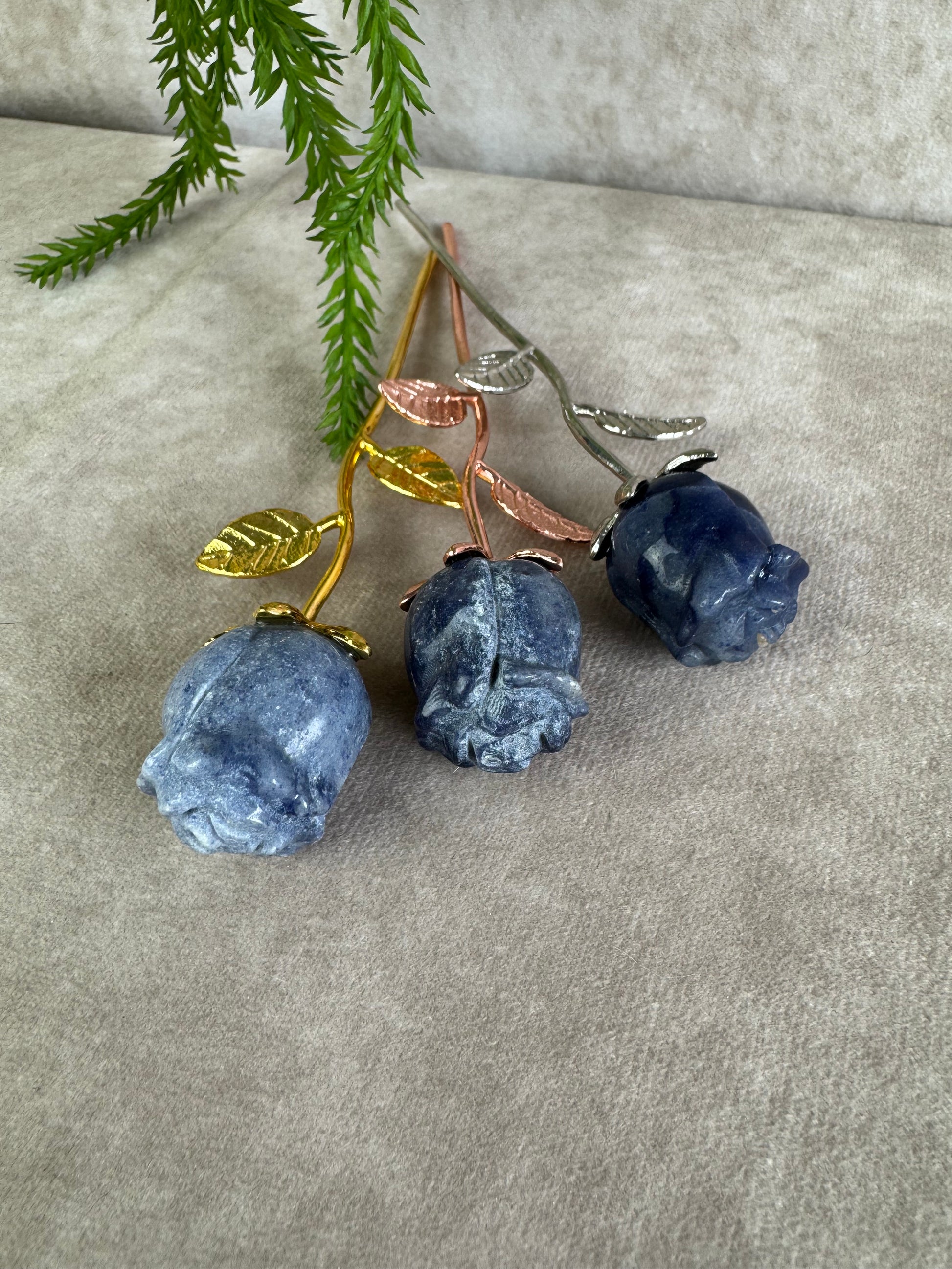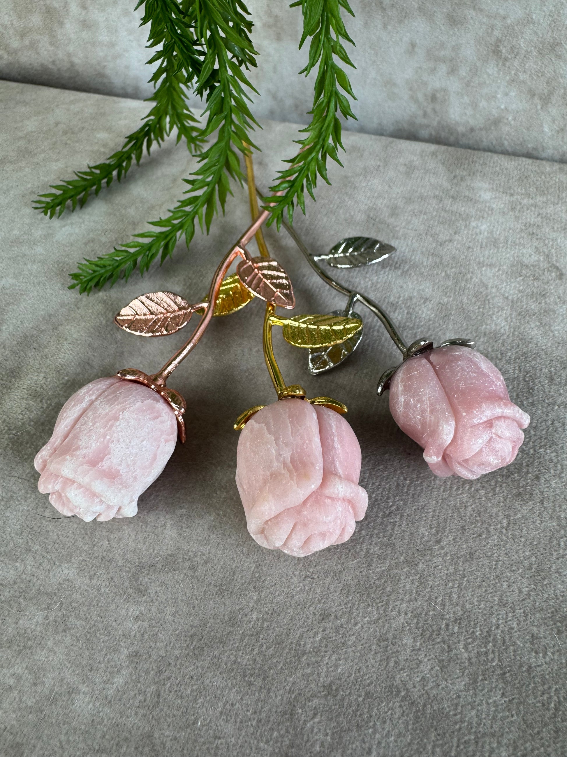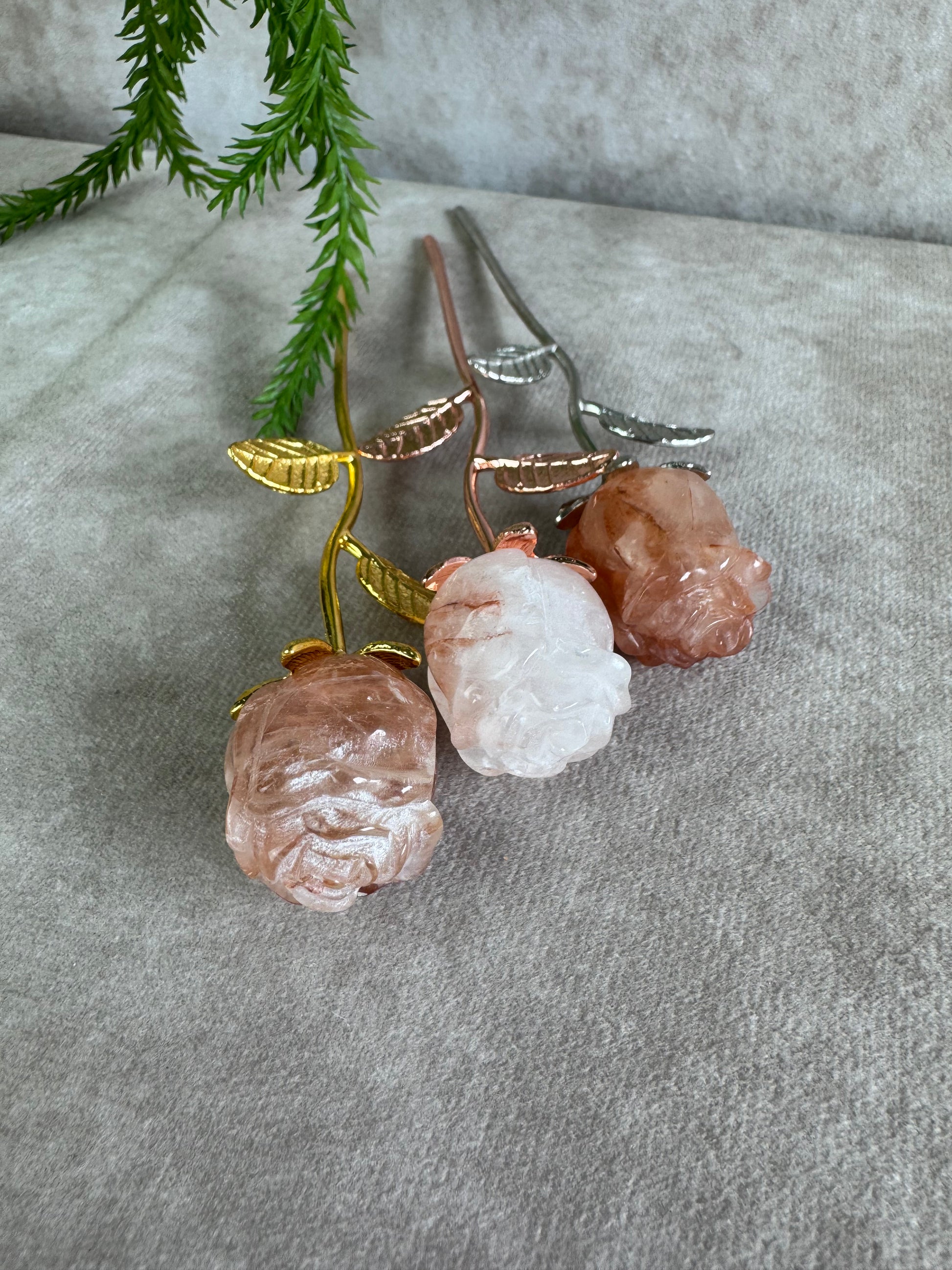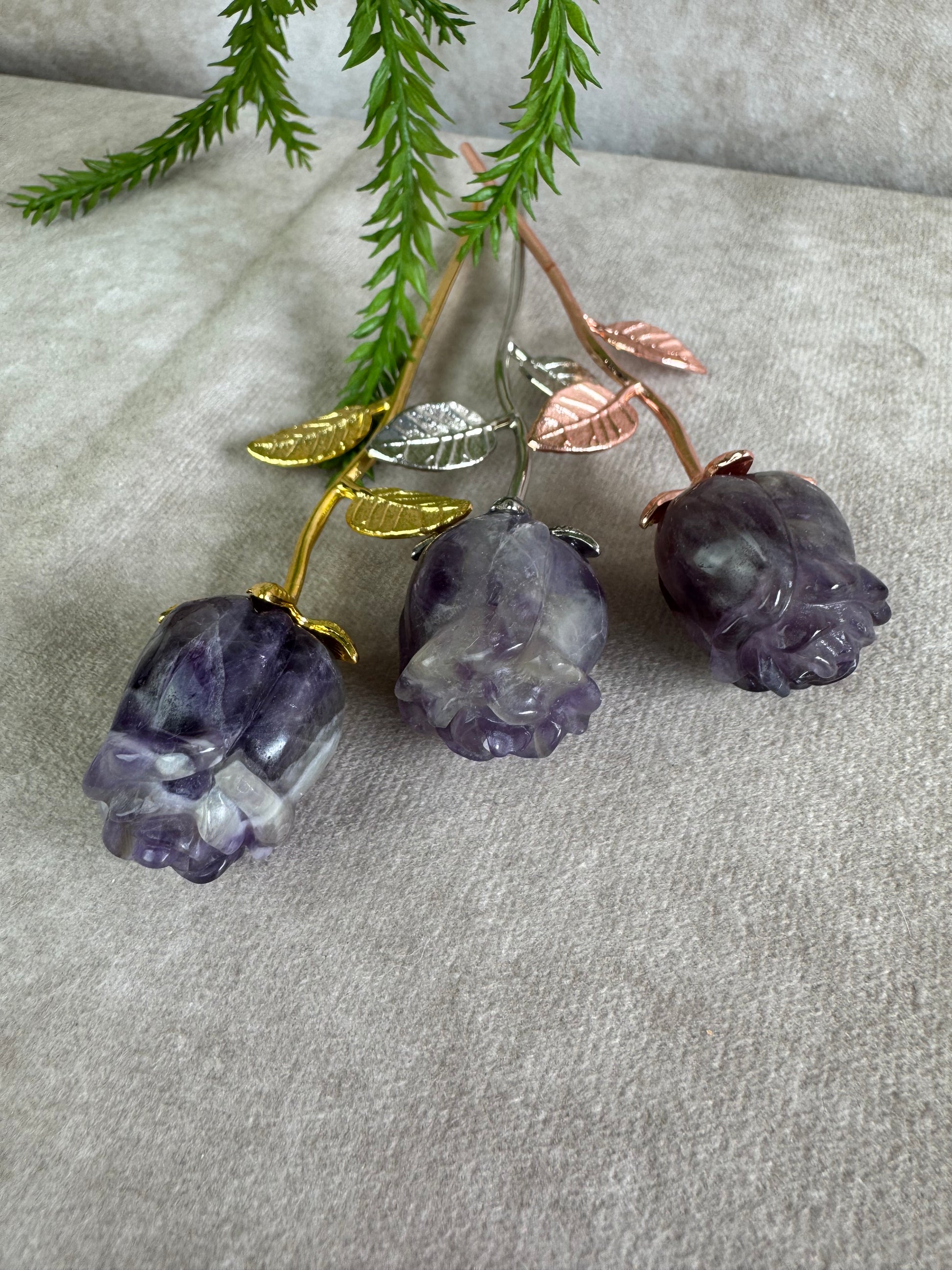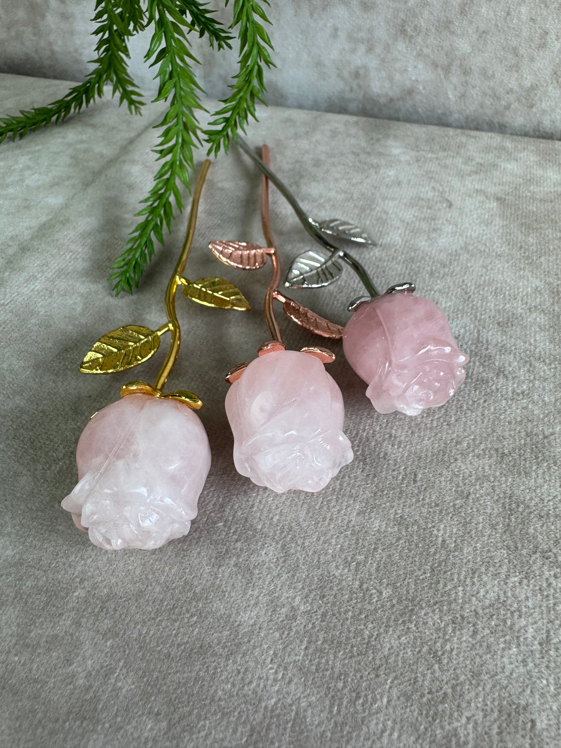 Deze prachtige edelstenen roosjes combineren de symboliek van de roos met de kracht van kristallen. Elke roos is met zorg geslepen uit een echte edelsteen en bevestigd op een verfijnde metalen steel in jouw keuze: goud, roségoud of zilver. Het resultaat is een tijdloos, elegant en energetisch waardevol decoratiestuk.