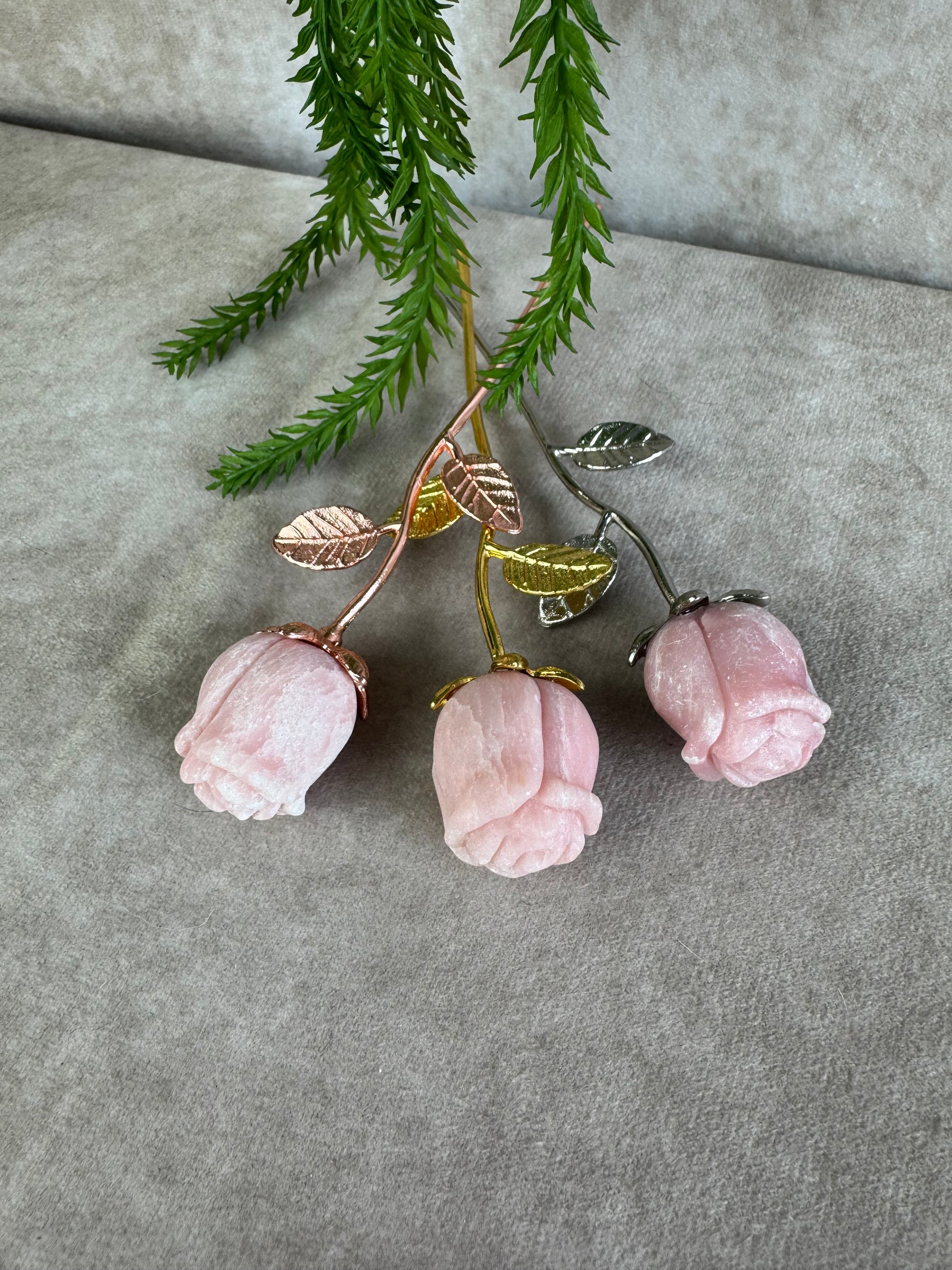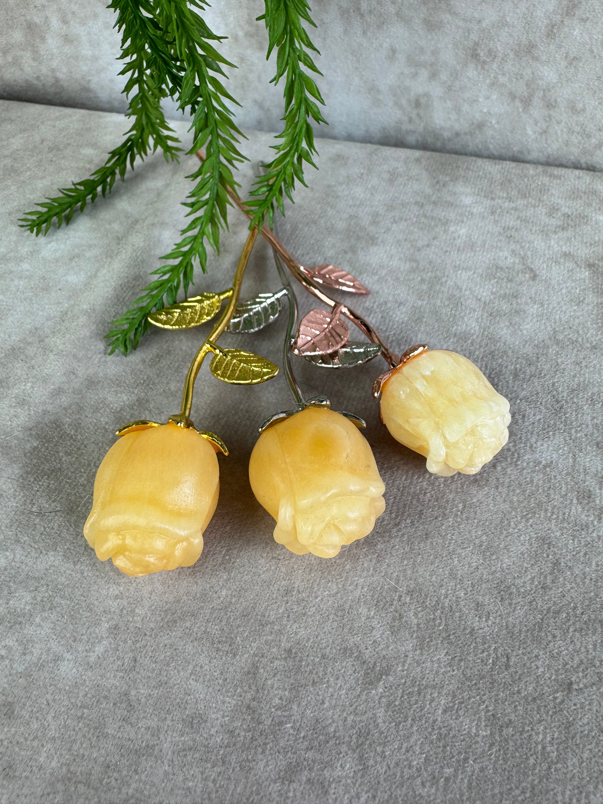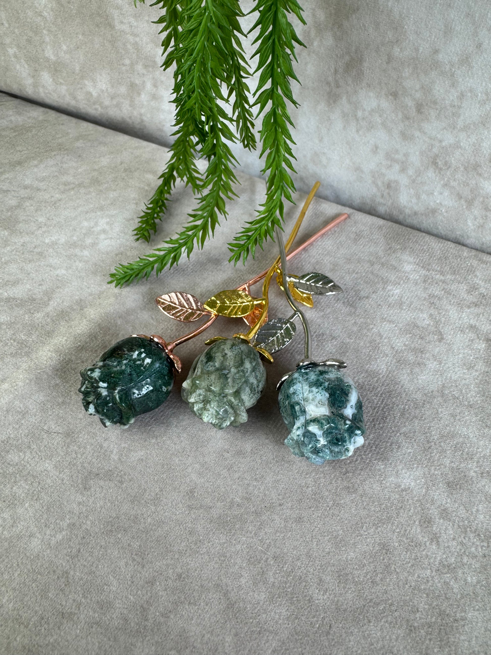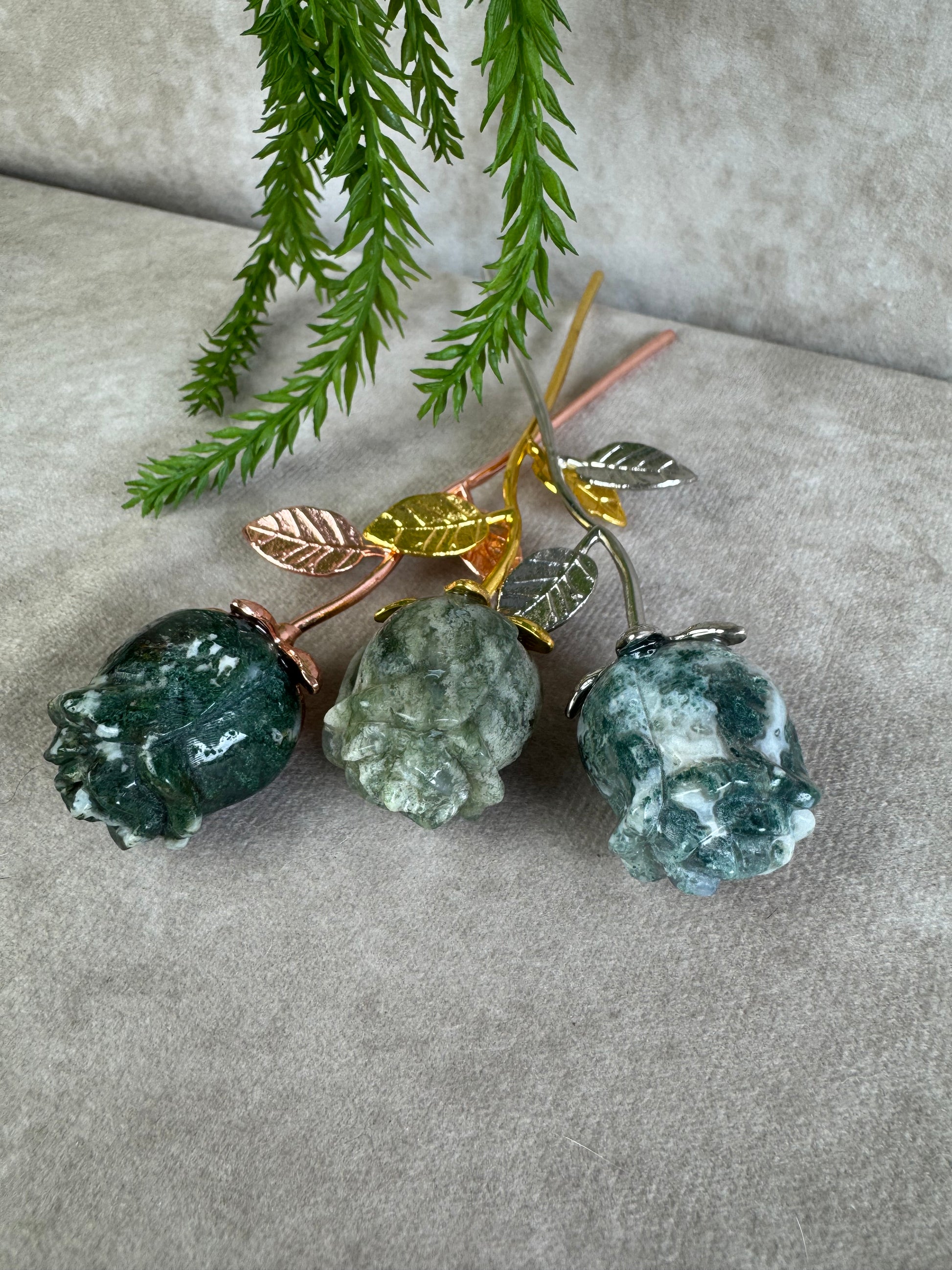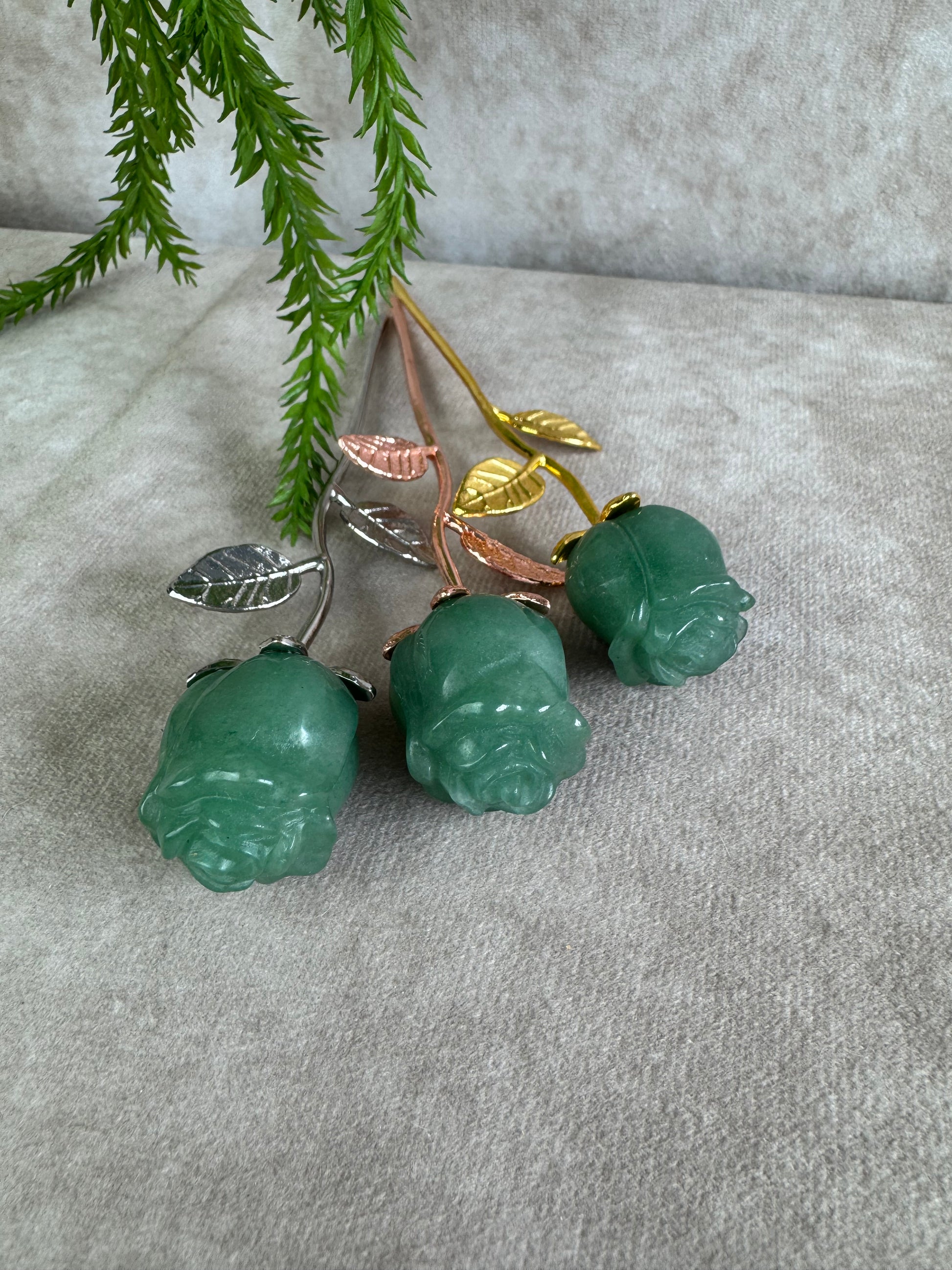 Deze prachtige edelstenen roosjes combineren de symboliek van de roos met de kracht van kristallen. Elke roos is met zorg geslepen uit een echte edelsteen en bevestigd op een verfijnde metalen steel in jouw keuze: goud, roségoud of zilver. Het resultaat is een tijdloos, elegant en energetisch waardevol decoratiestuk.