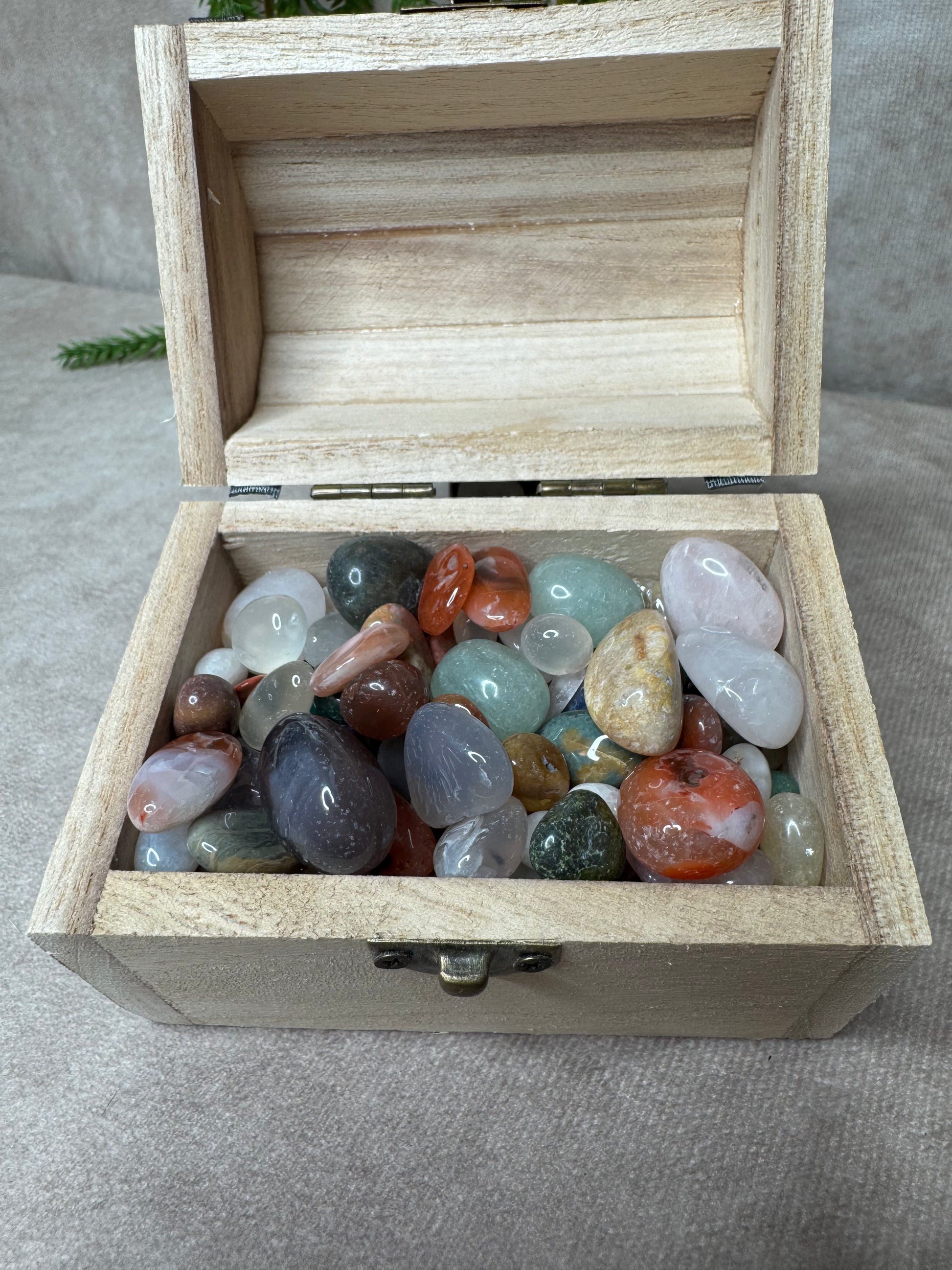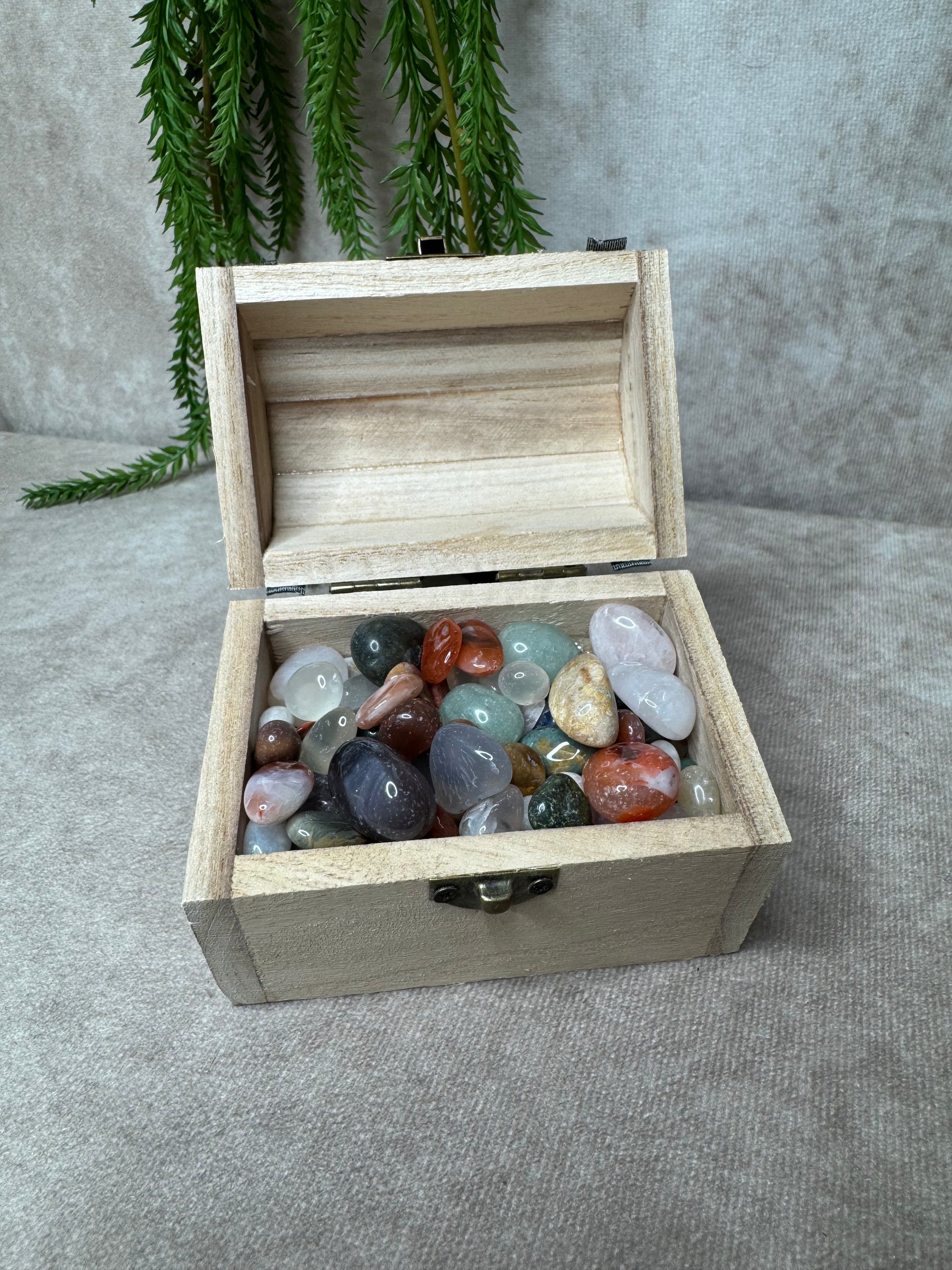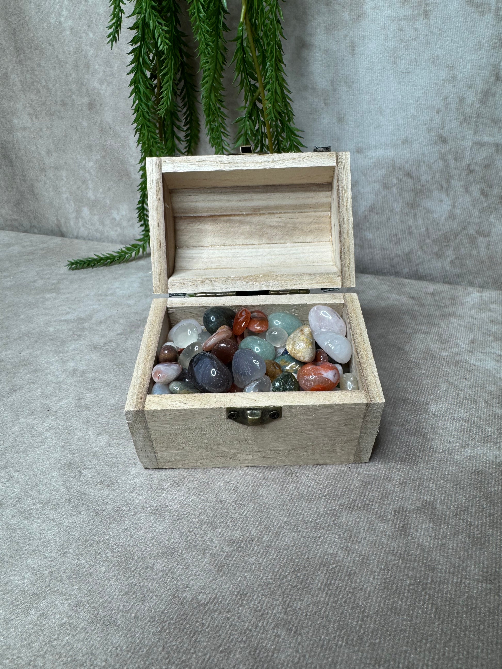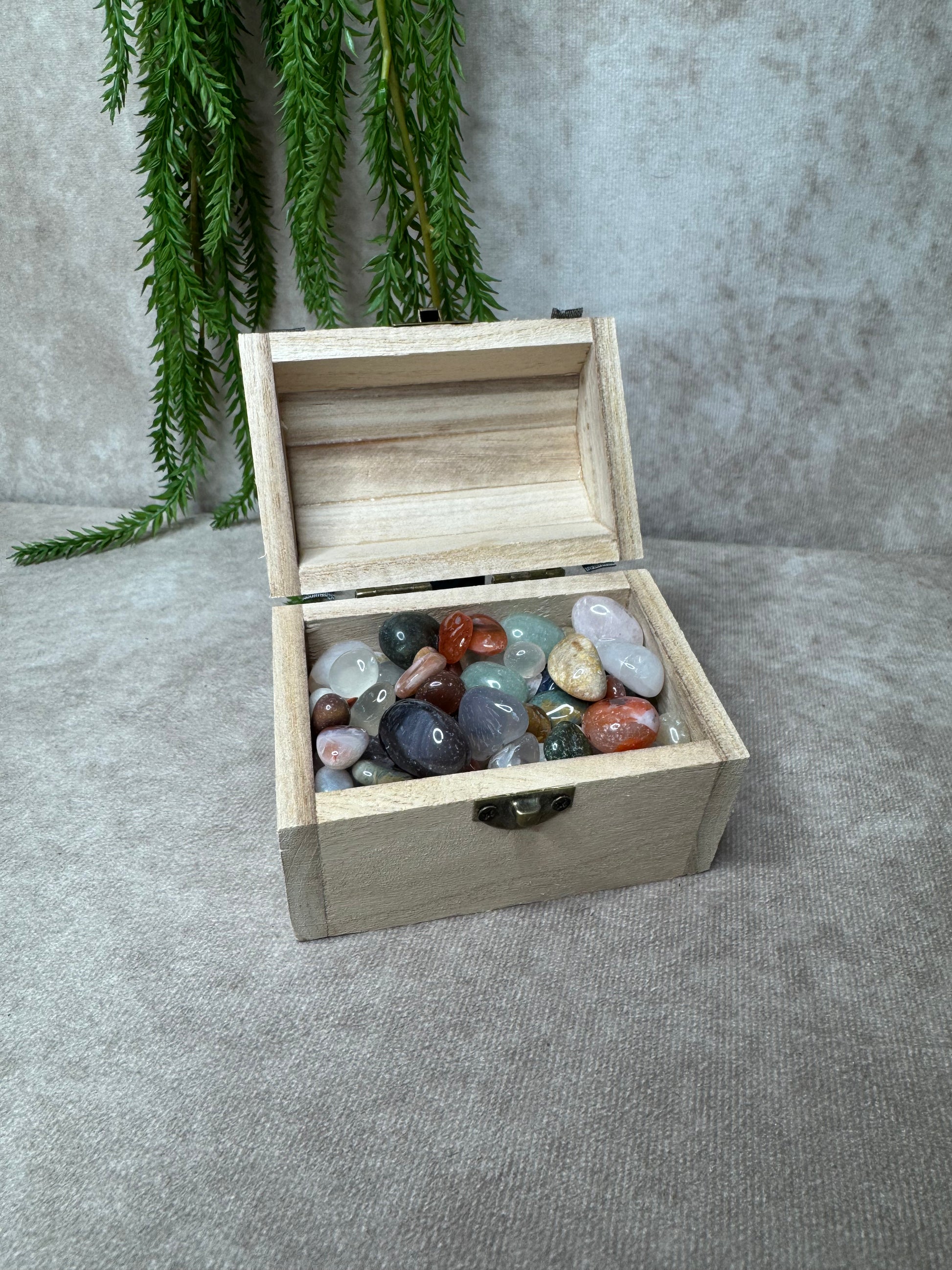 Dit betoverende schatkistje vol edelstenen is als een klein stukje magie om zelf te ontdekken of cadeau te geven. Het houten kistje met een afmeting van 9,5 cm breed, 6,5 cm diep en 7 cm hoog, zit boordevol zorgvuldig geselecteerde getrommelde edelstenen, elk met hun eigen kleur, energie en verhaal.
