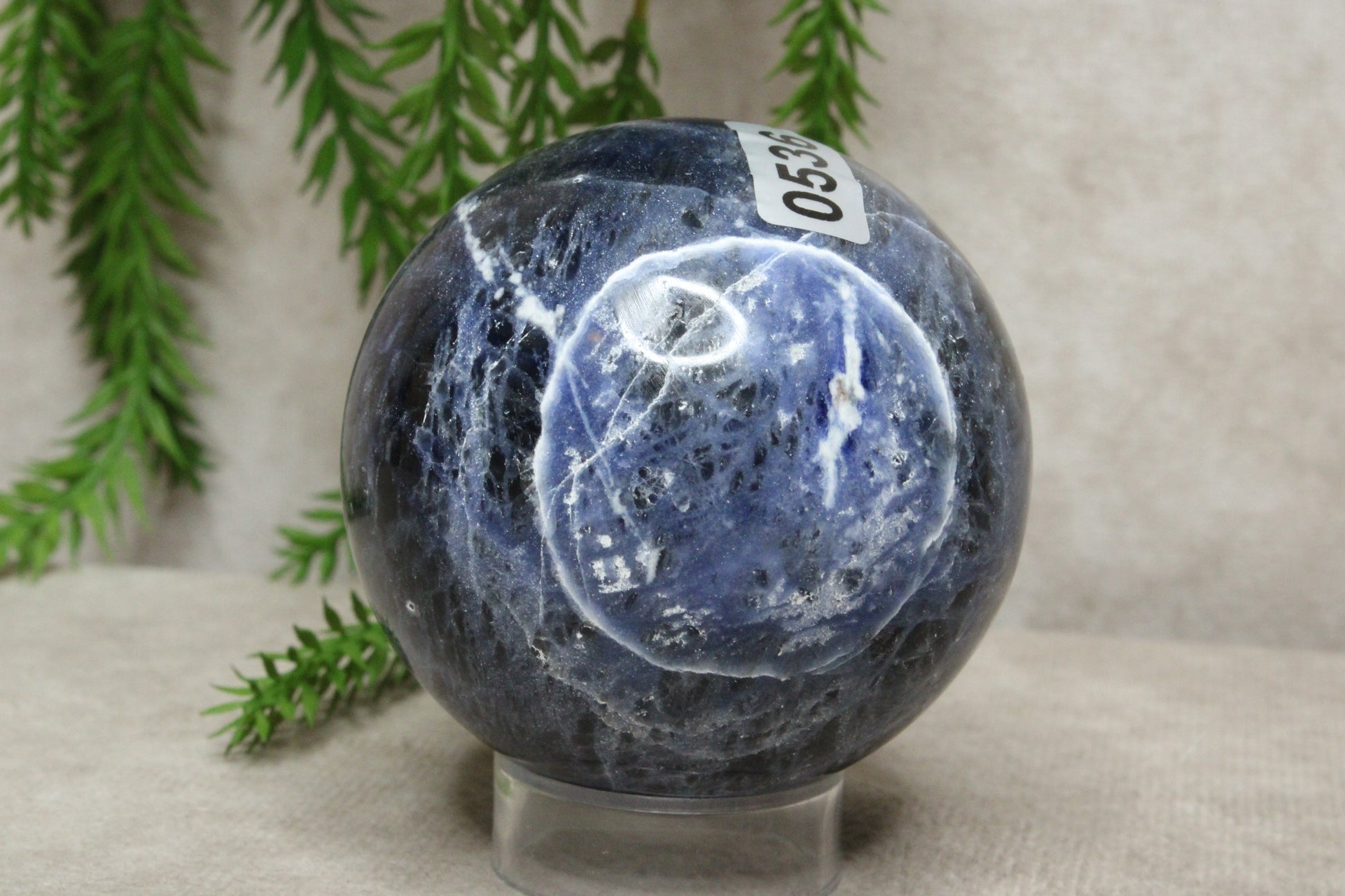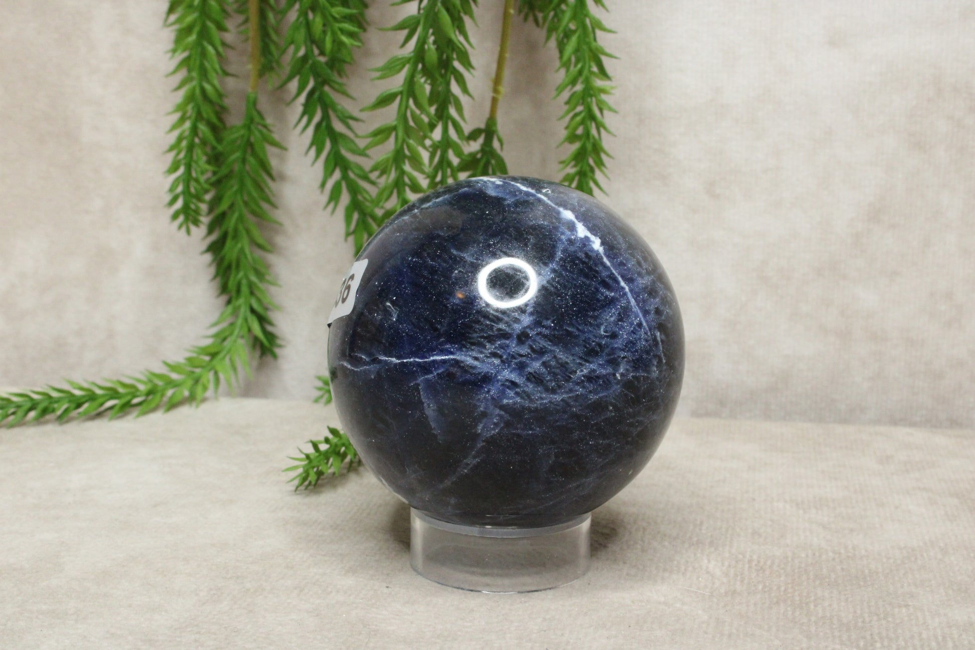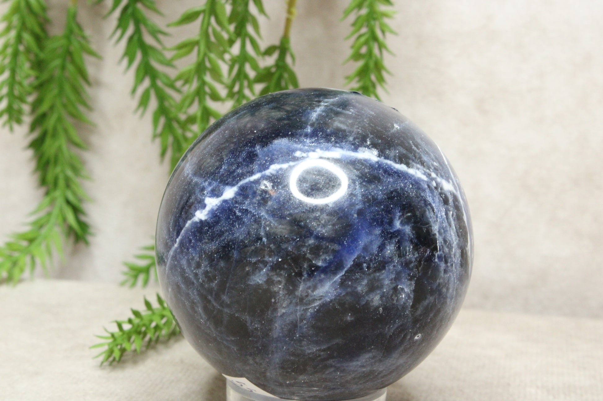 Deze sodaliet bol heeft een rustige en heldere uitstraling. Met een diameter van 6,1 cm en een gewicht van 278 gram is het een compact en fijn formaat dat gemakkelijk een plek vindt in huis. De diepe blauwtinten, vaak met lichte aders, geven de bol een natuurlijke en kalme uitstraling.