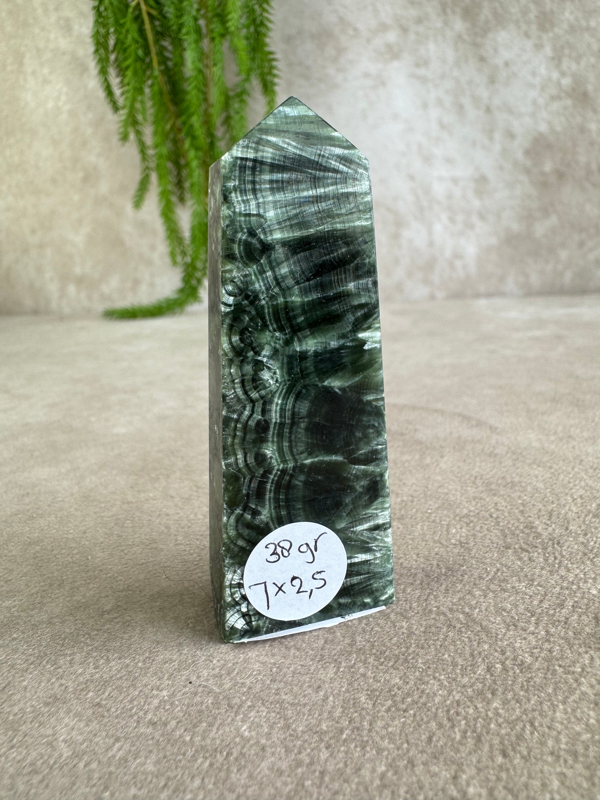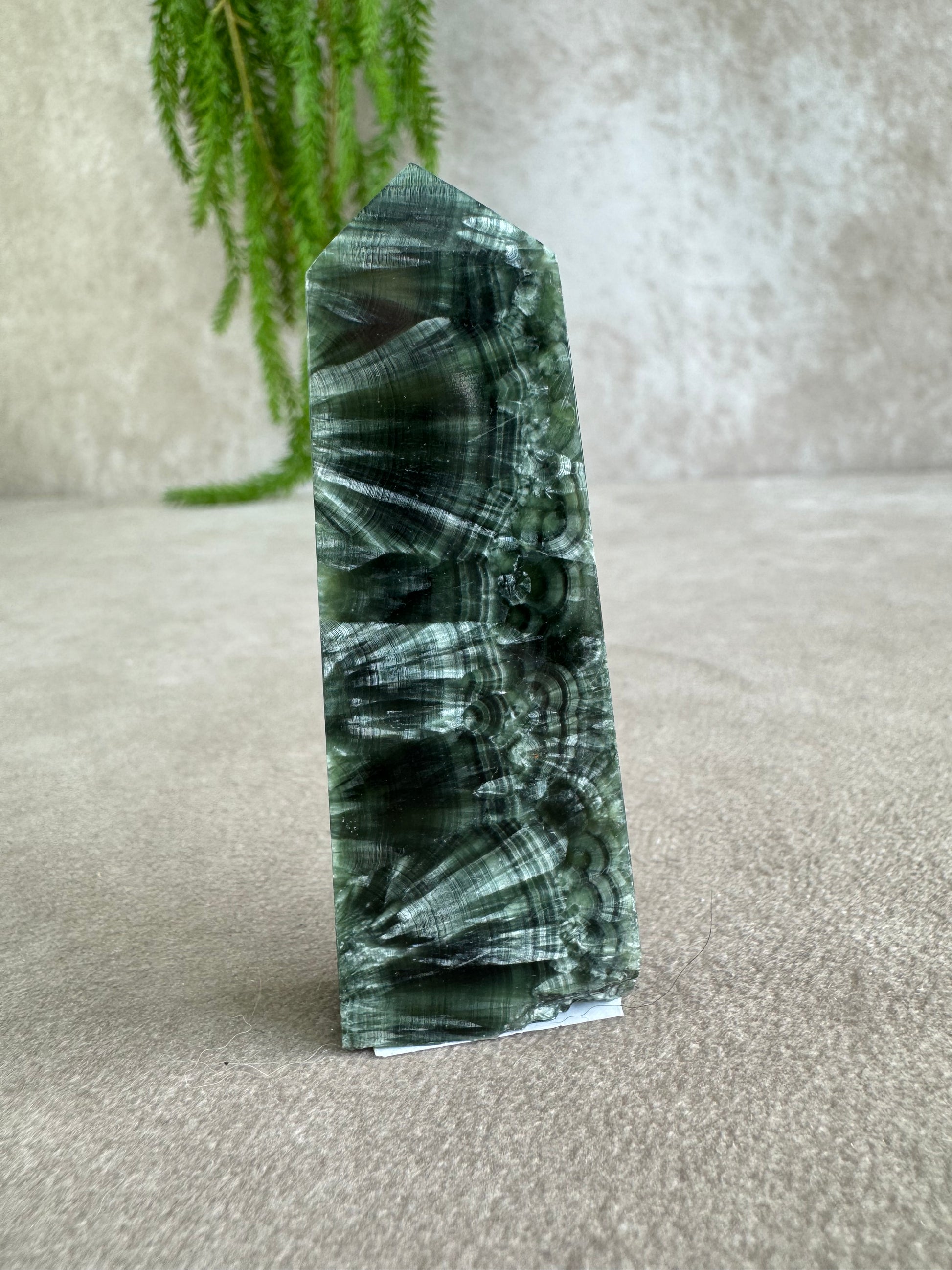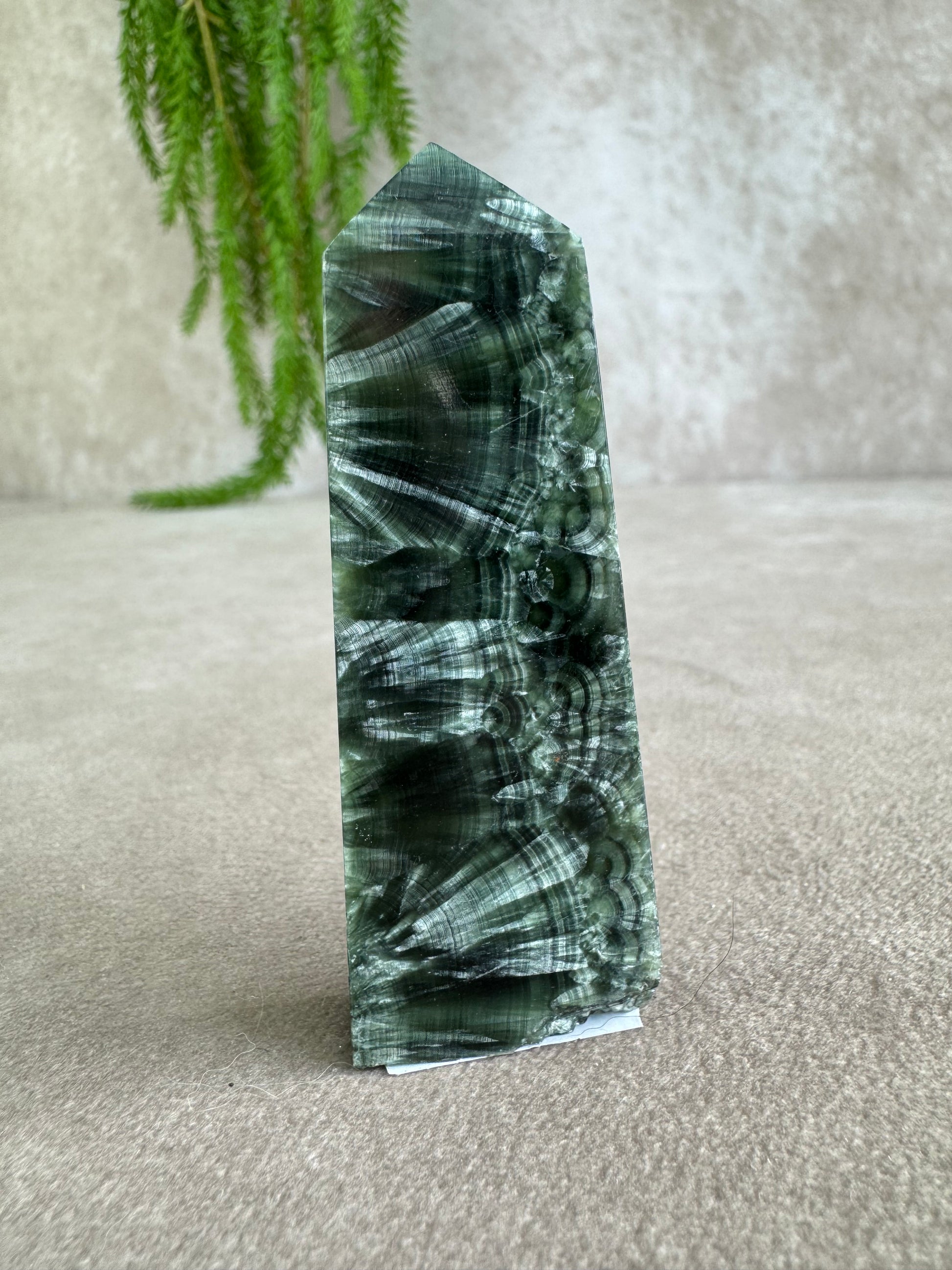 Serafiniet is een zeldzame steen, herkenbaar aan zijn diepgroene kleur met zilverachtige verenstructuur alsof er vleugels in de steen zijn vastgelegd. Deze natuurlijke tekening maakt elke toren uniek en visueel intrigerend.
