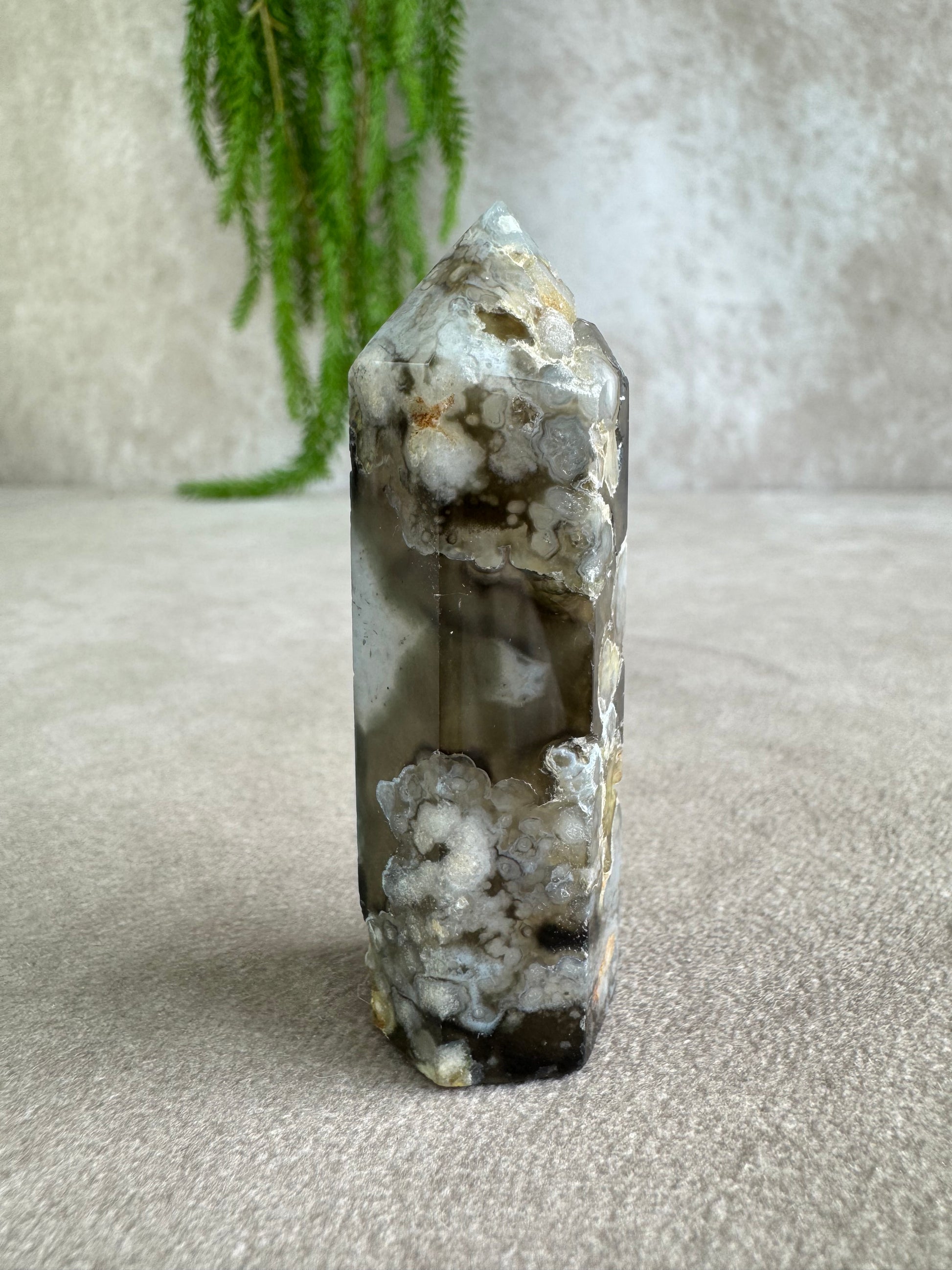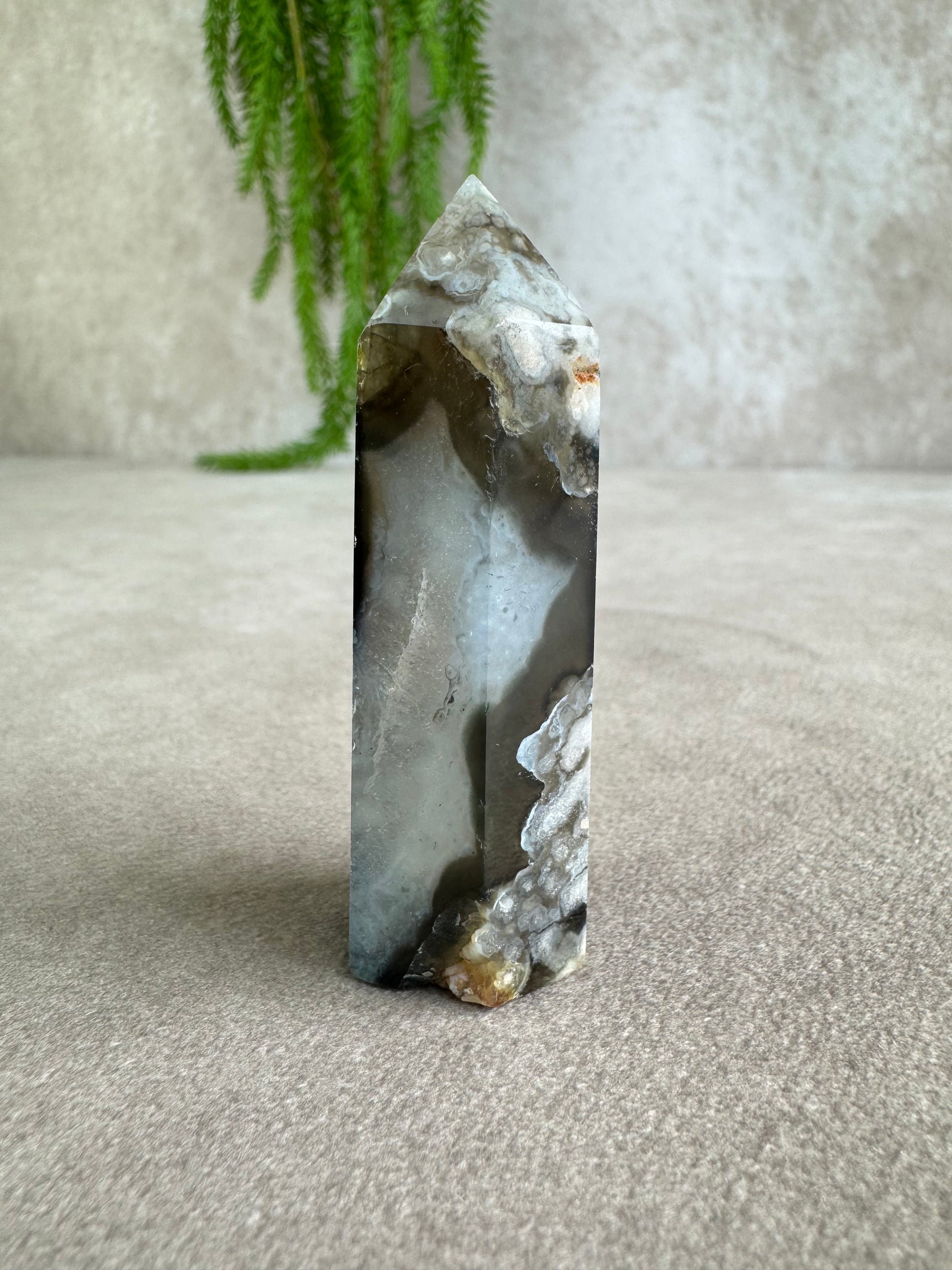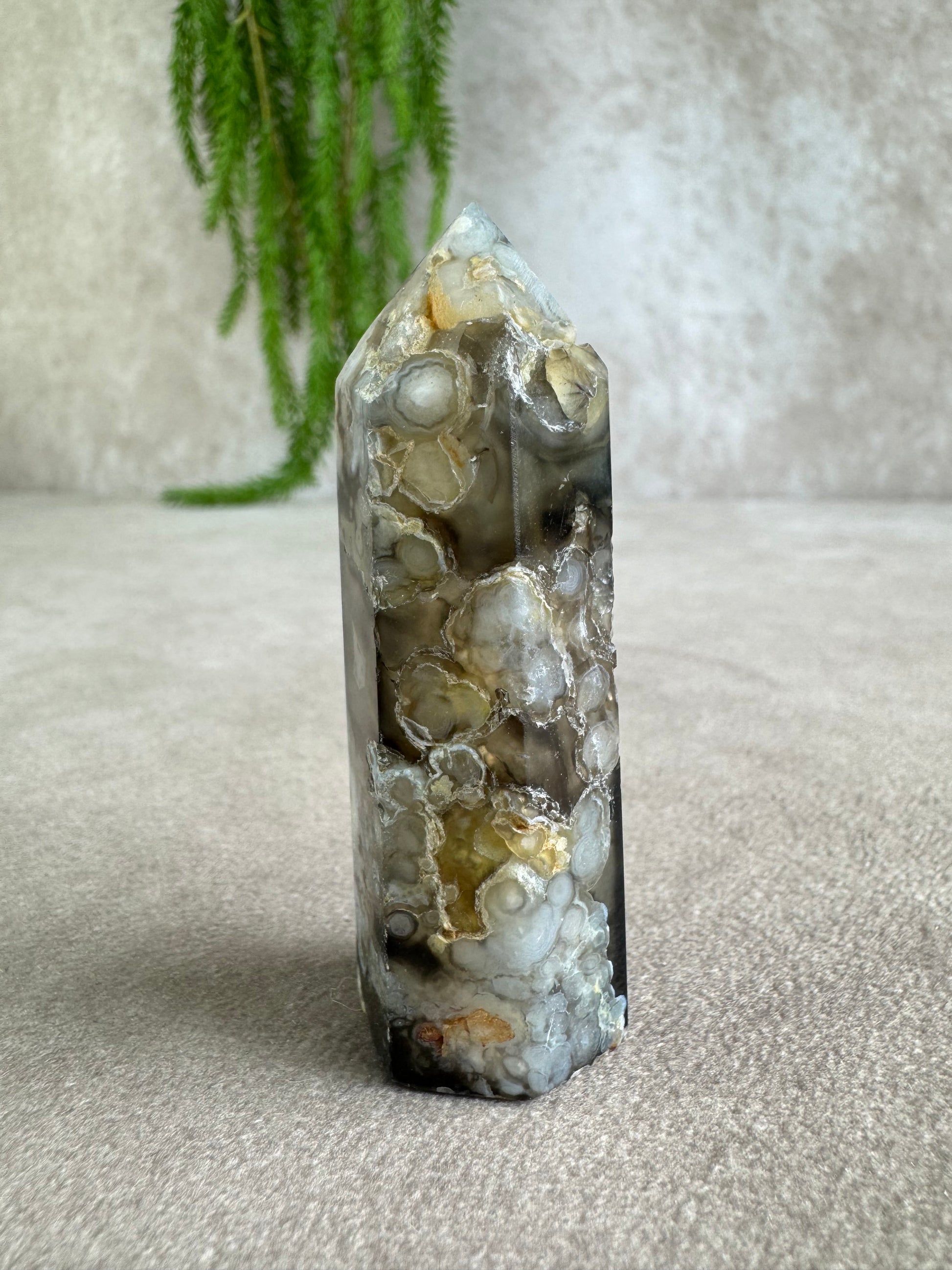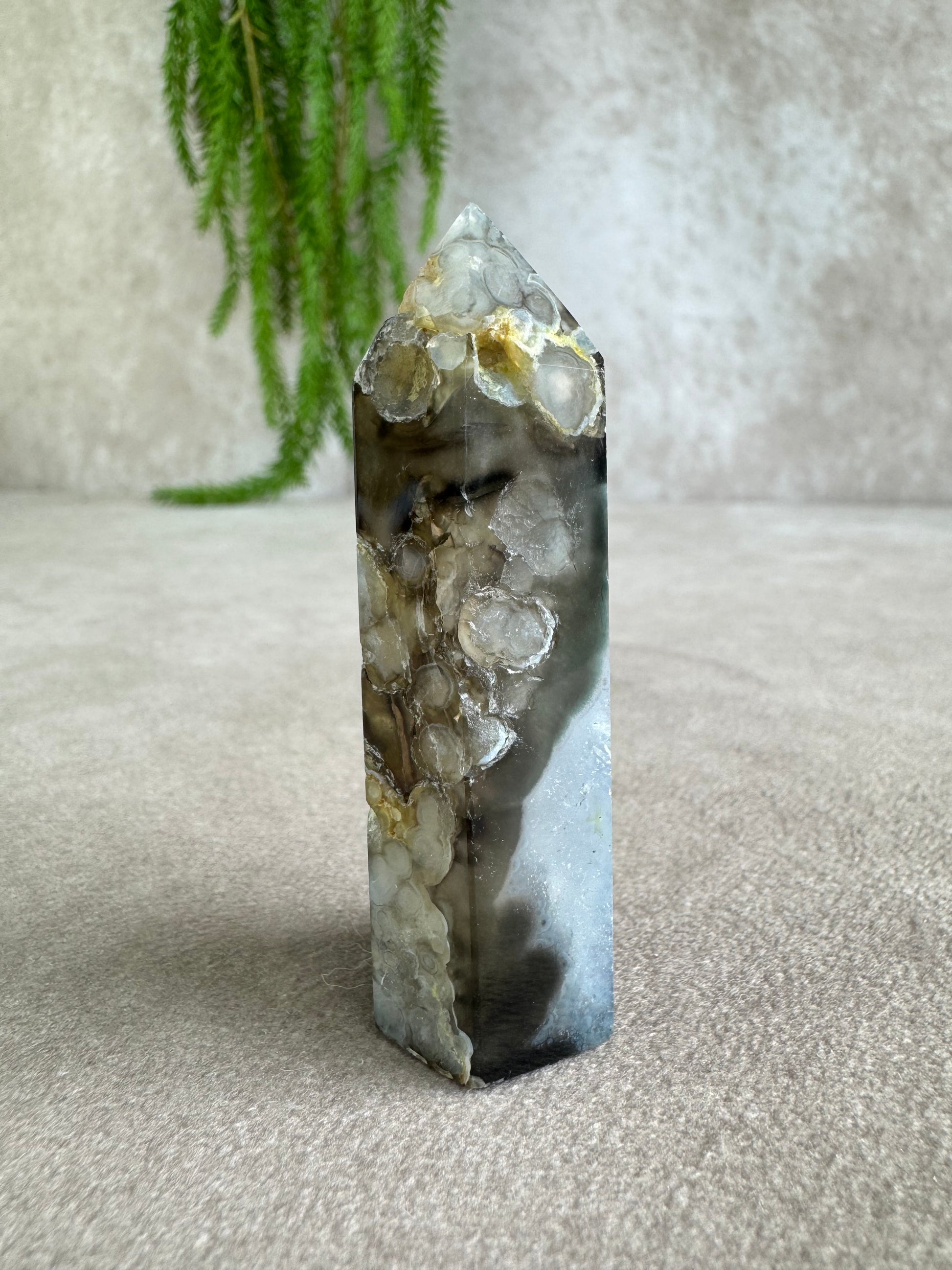 Bloemagaat staat bekend om zijn zachte, vrouwelijke energie en helpt bij persoonlijke groei, zelfvertrouwen en het ontplooien van potentieel. De zwarte variant voegt daar een extra laag bescherming en gronding aan toe, waardoor deze toren rust en kracht tegelijk uitstraalt.