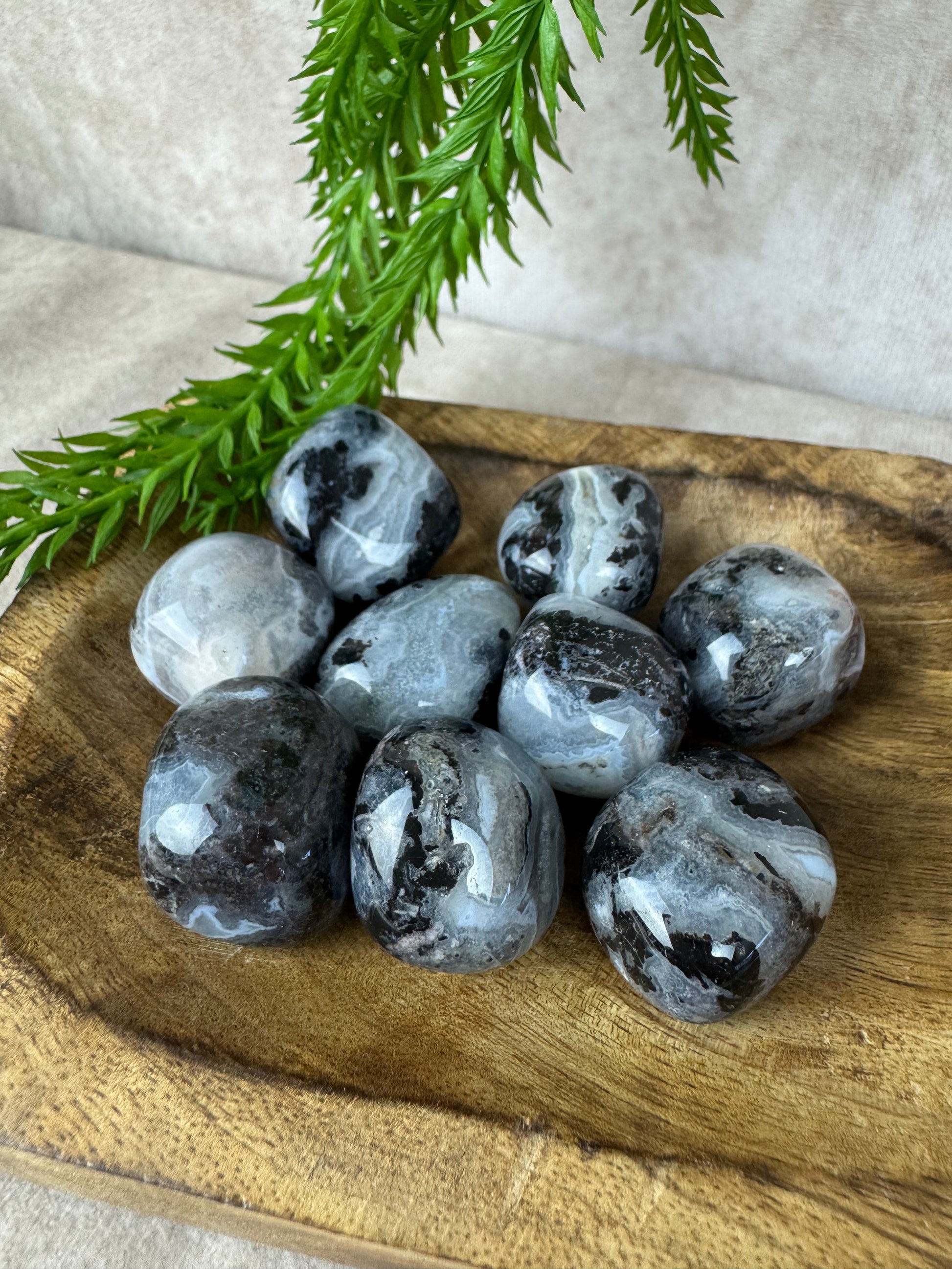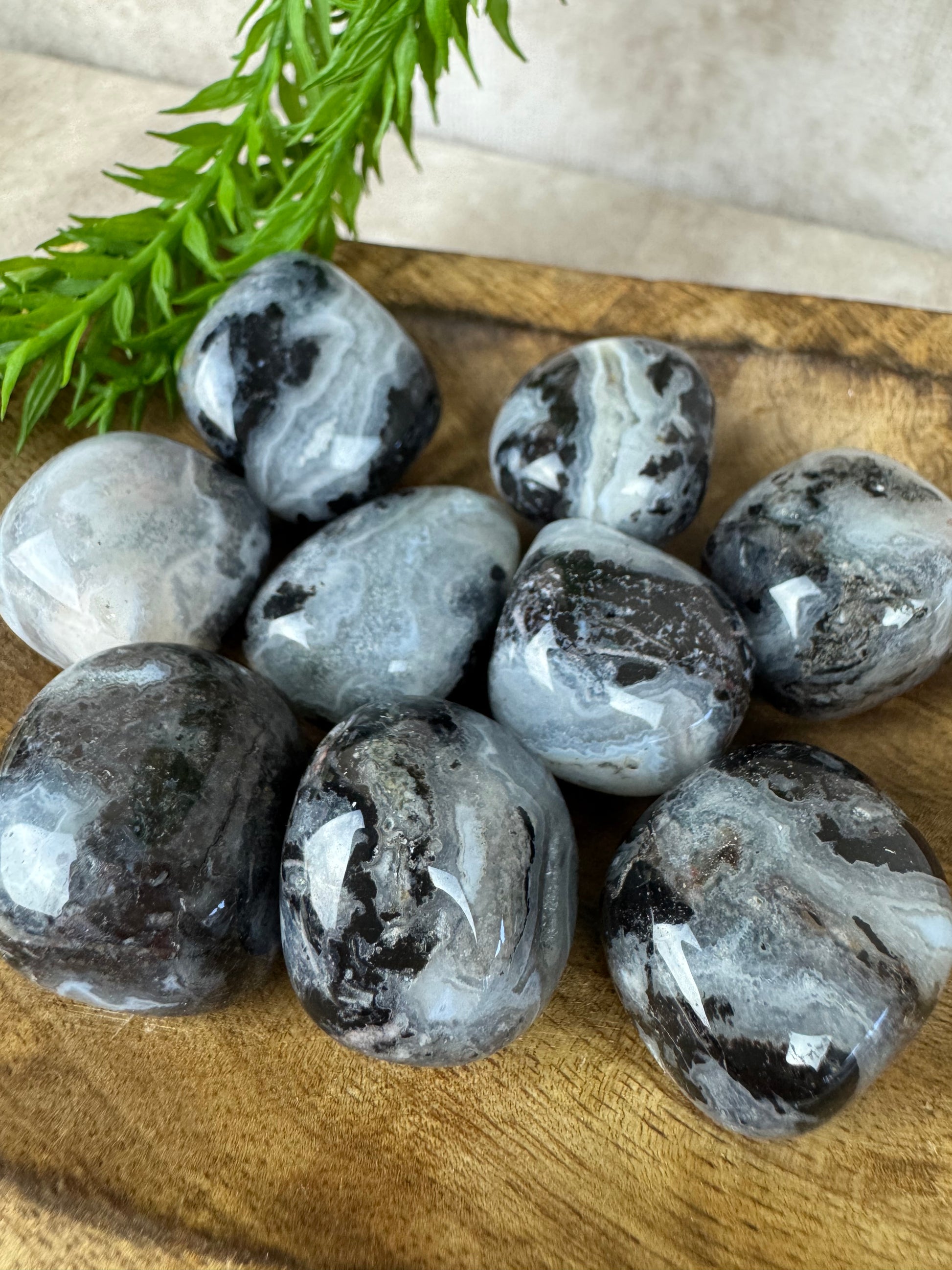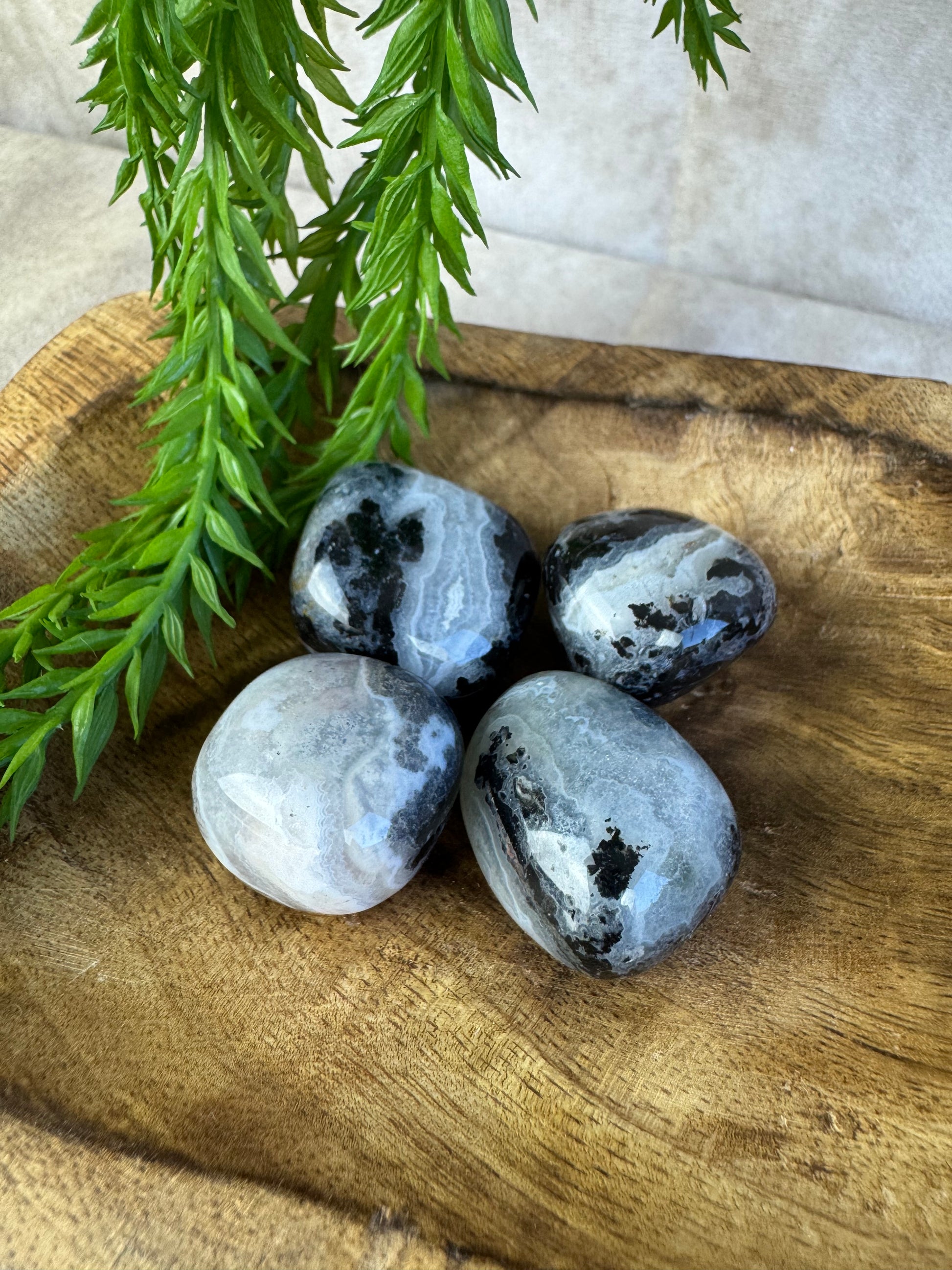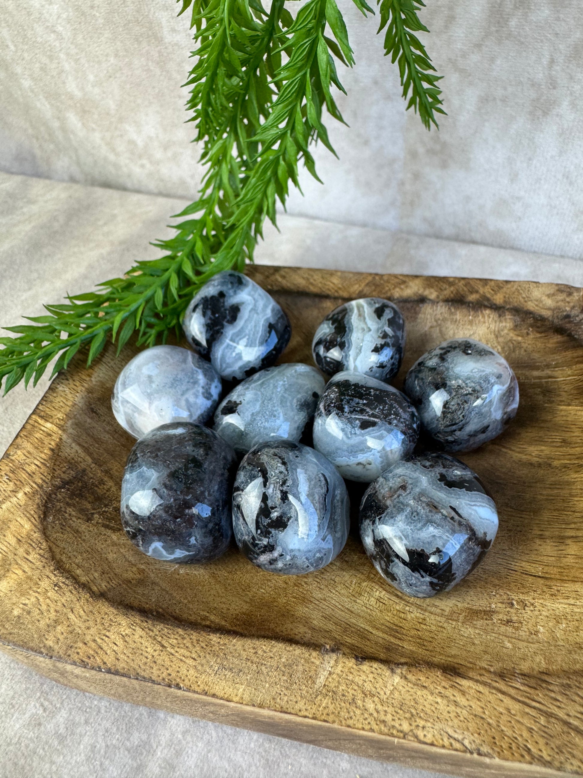 Deze trommelstenen van agaat met kwarts laten een prachtig kleurenspel zien van grijs, zwart en wit. Elke steen heeft zijn eigen unieke tekening en glans, waardoor geen twee exemplaren exact hetzelfde zijn.
