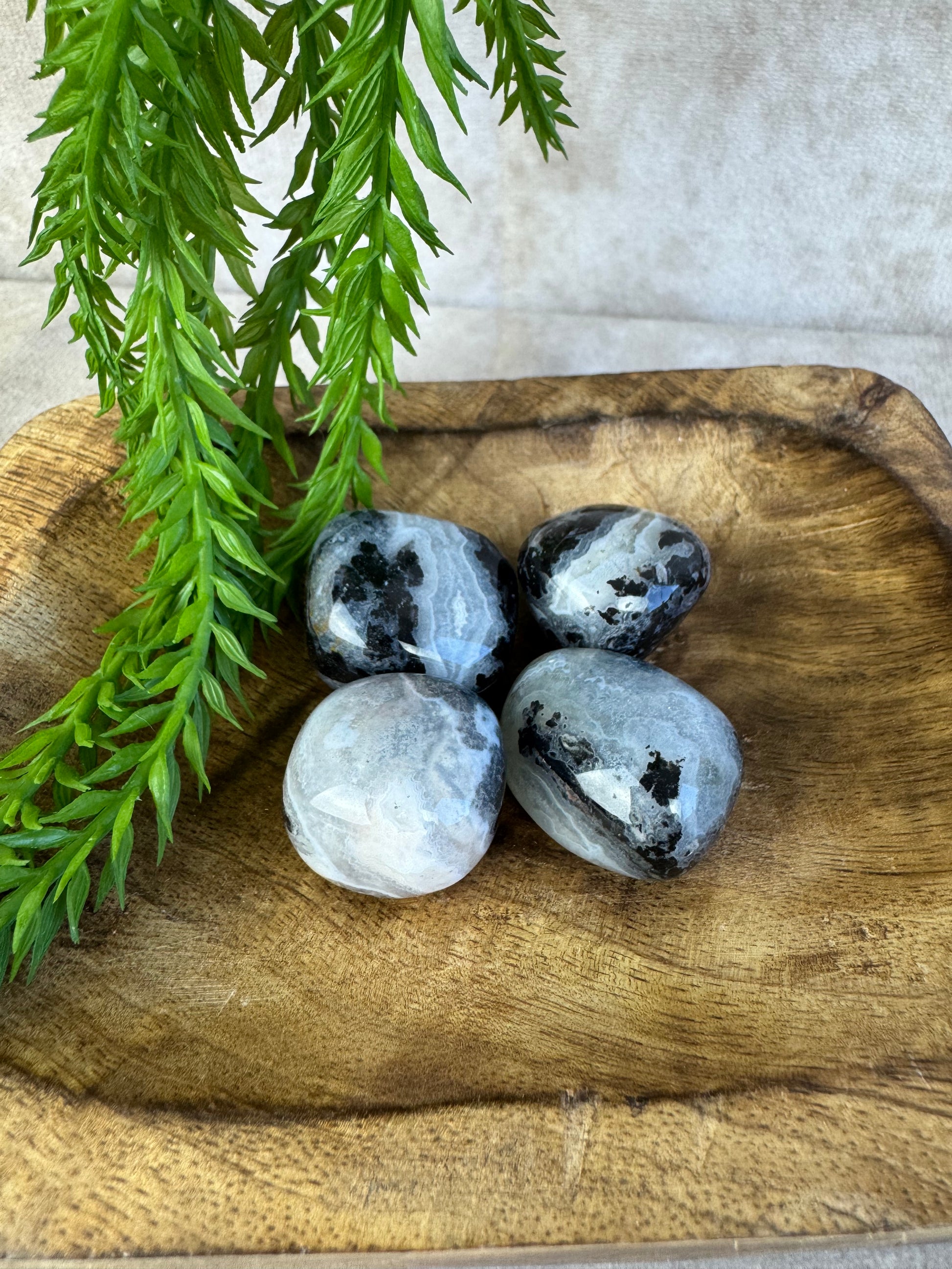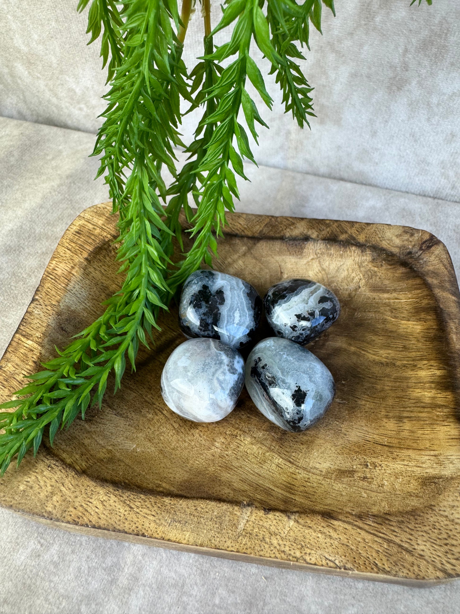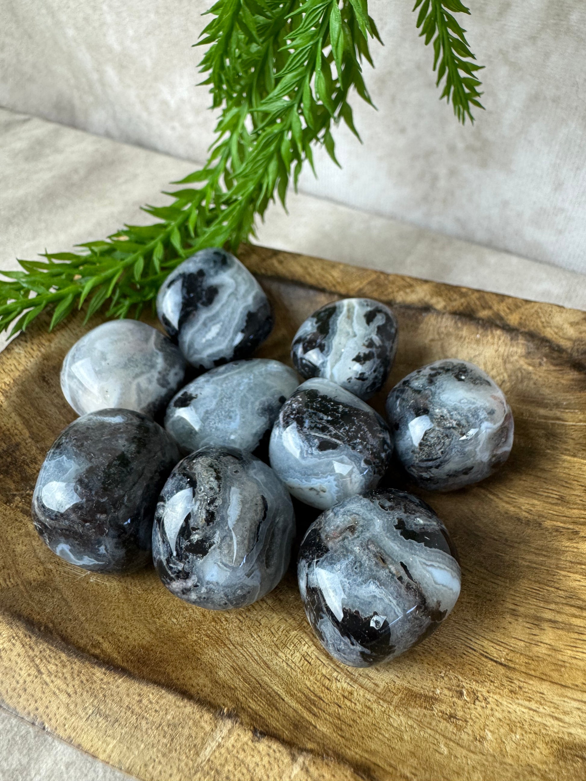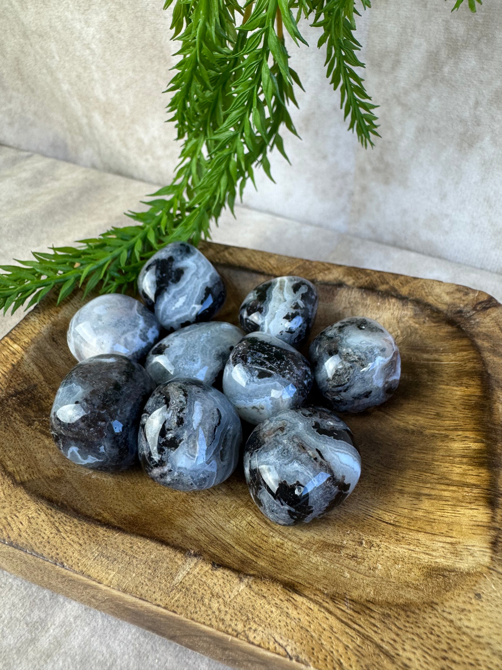 Deze trommelstenen van agaat met kwarts laten een prachtig kleurenspel zien van grijs, zwart en wit. Elke steen heeft zijn eigen unieke tekening en glans, waardoor geen twee exemplaren exact hetzelfde zijn.