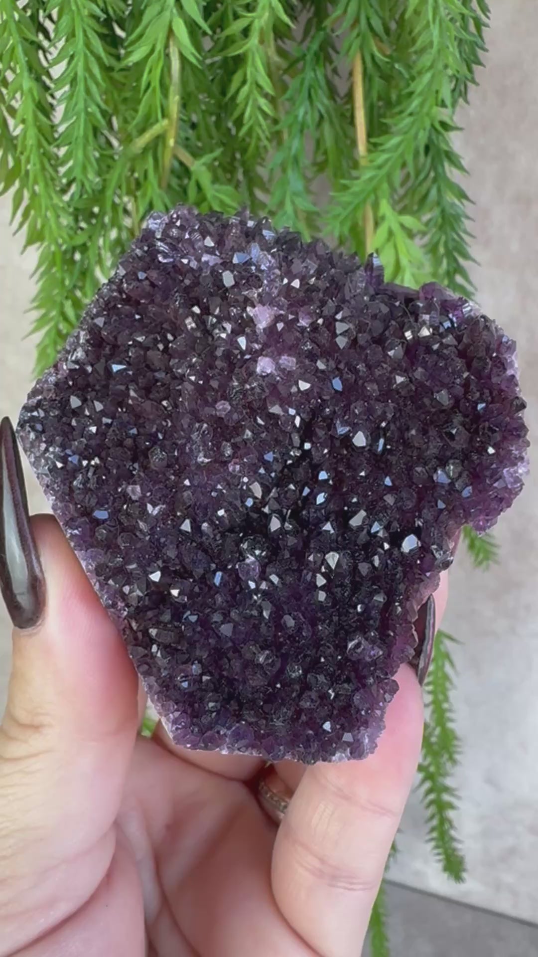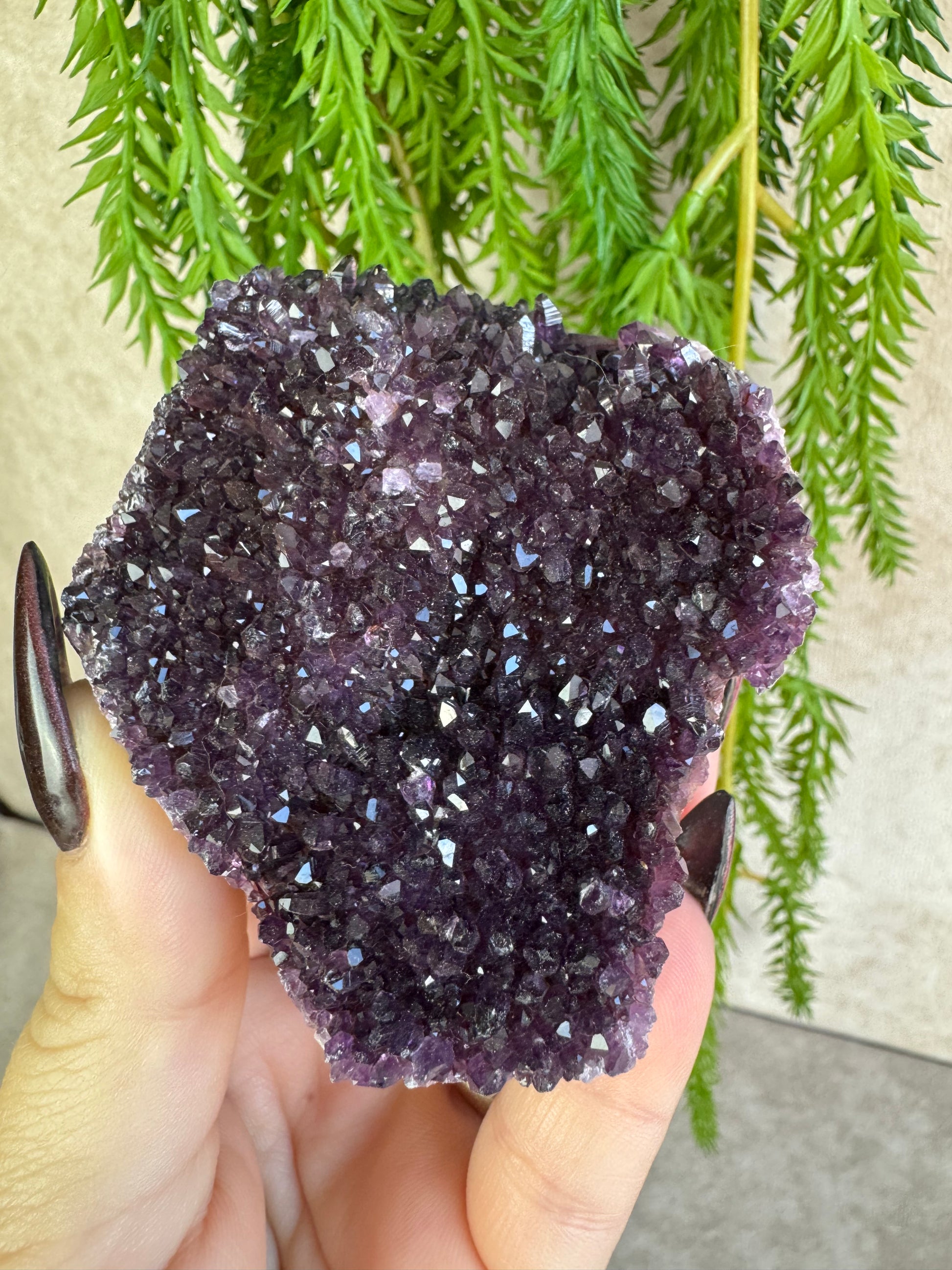 Dit prachtige amethist cluster uit Turkije van 7,5 x 6,2 cm is een uniek natuurstuk met sprankelende kristallen. De diepe paarse tinten en de mooie glans maken het tot een elegante blikvanger.