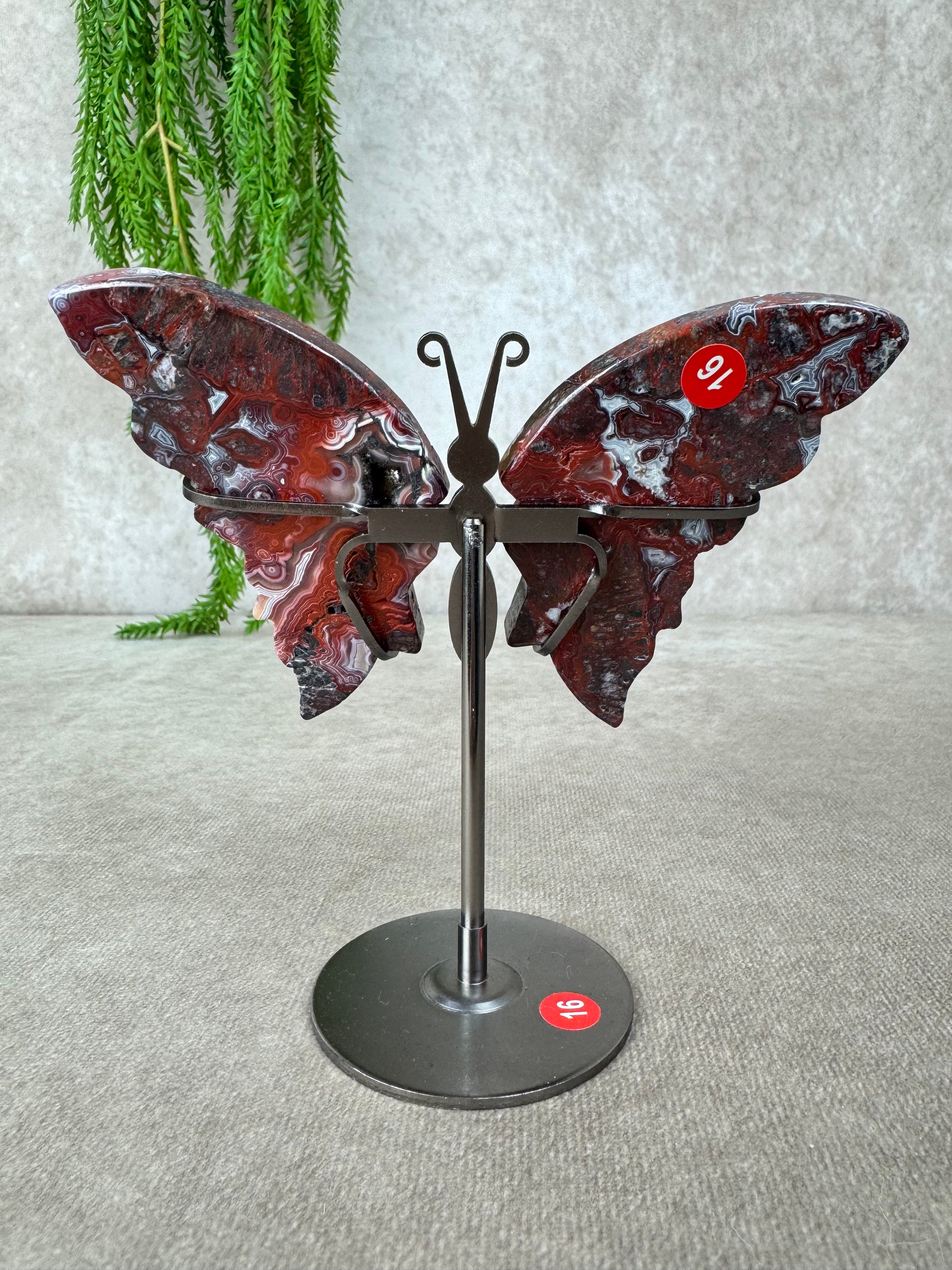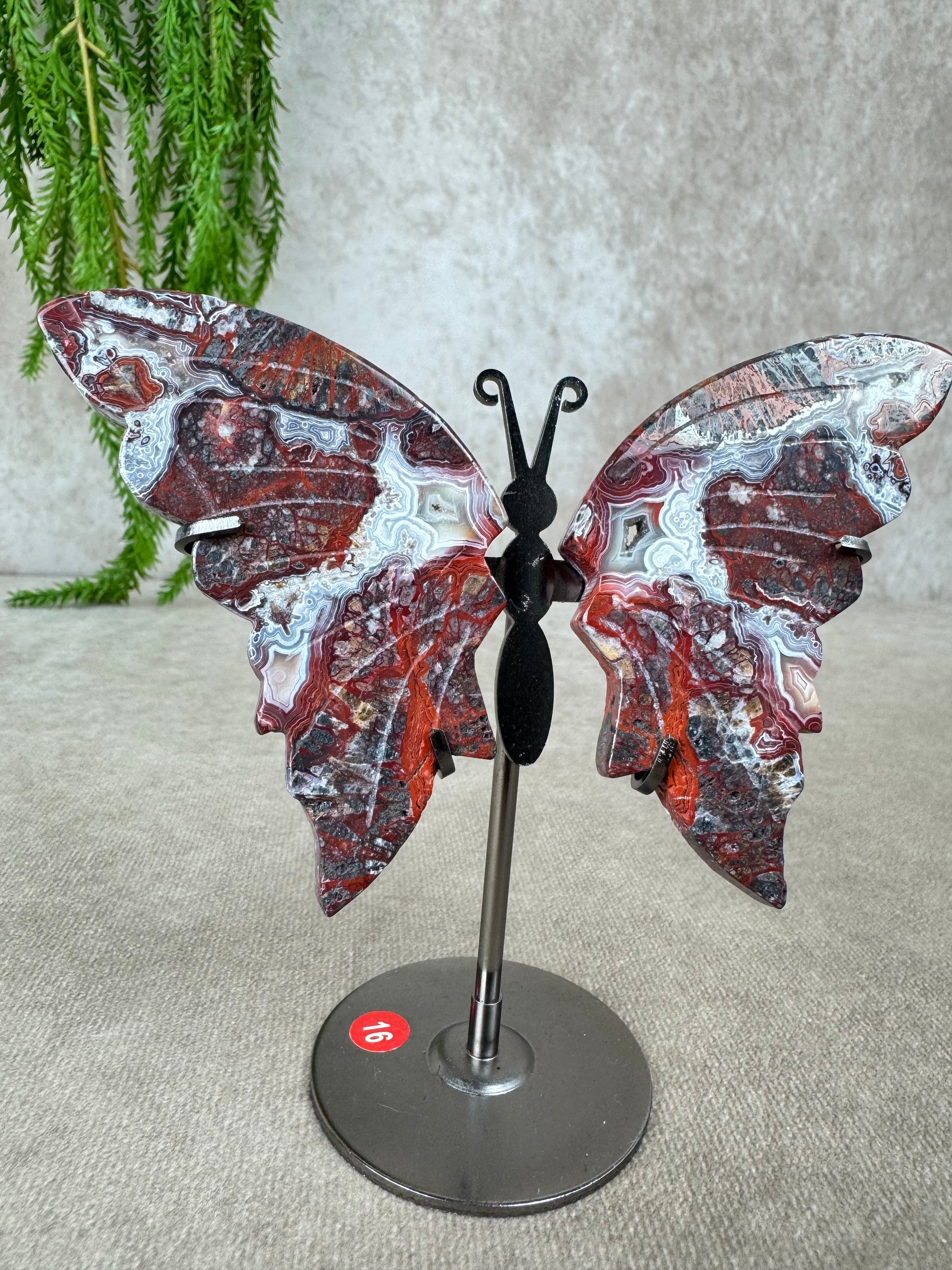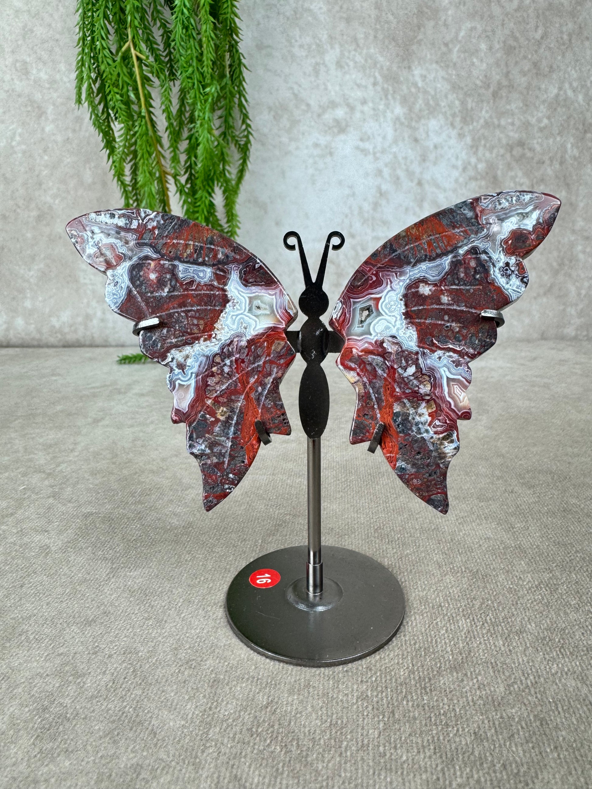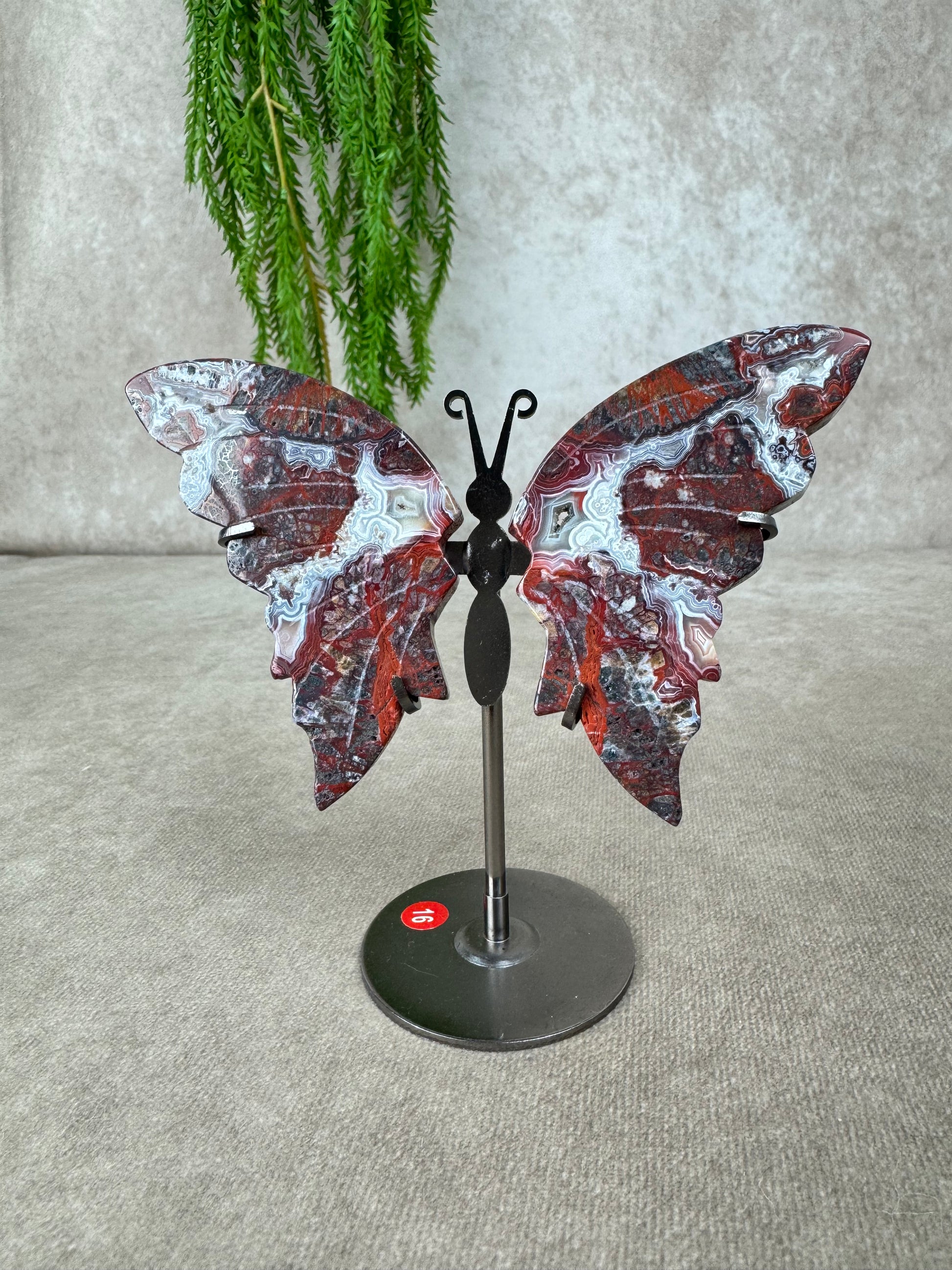 Deze opvallende crazy lace agaat vlinder van 12,5 cm hoog is een waar kunstwerk van de natuur. De rood- en witgetinte patronen kronkelen als dansende lijnen door de vleugels, waardoor elke vlinder een uniek en speels karakter heeft. Het zilverkleurige lijfje maakt het geheel compleet, met een elegante en harmonieuze uitstraling.