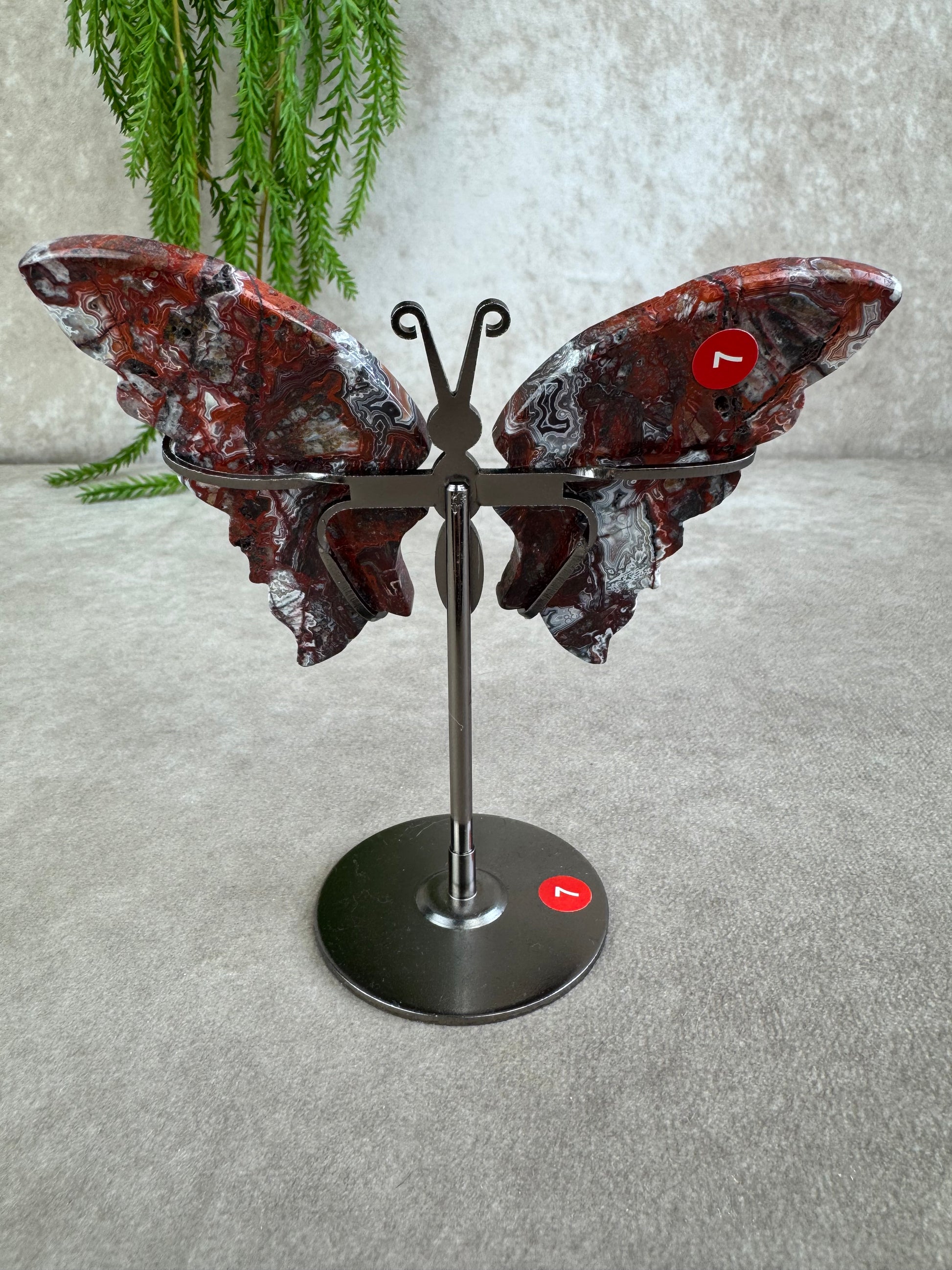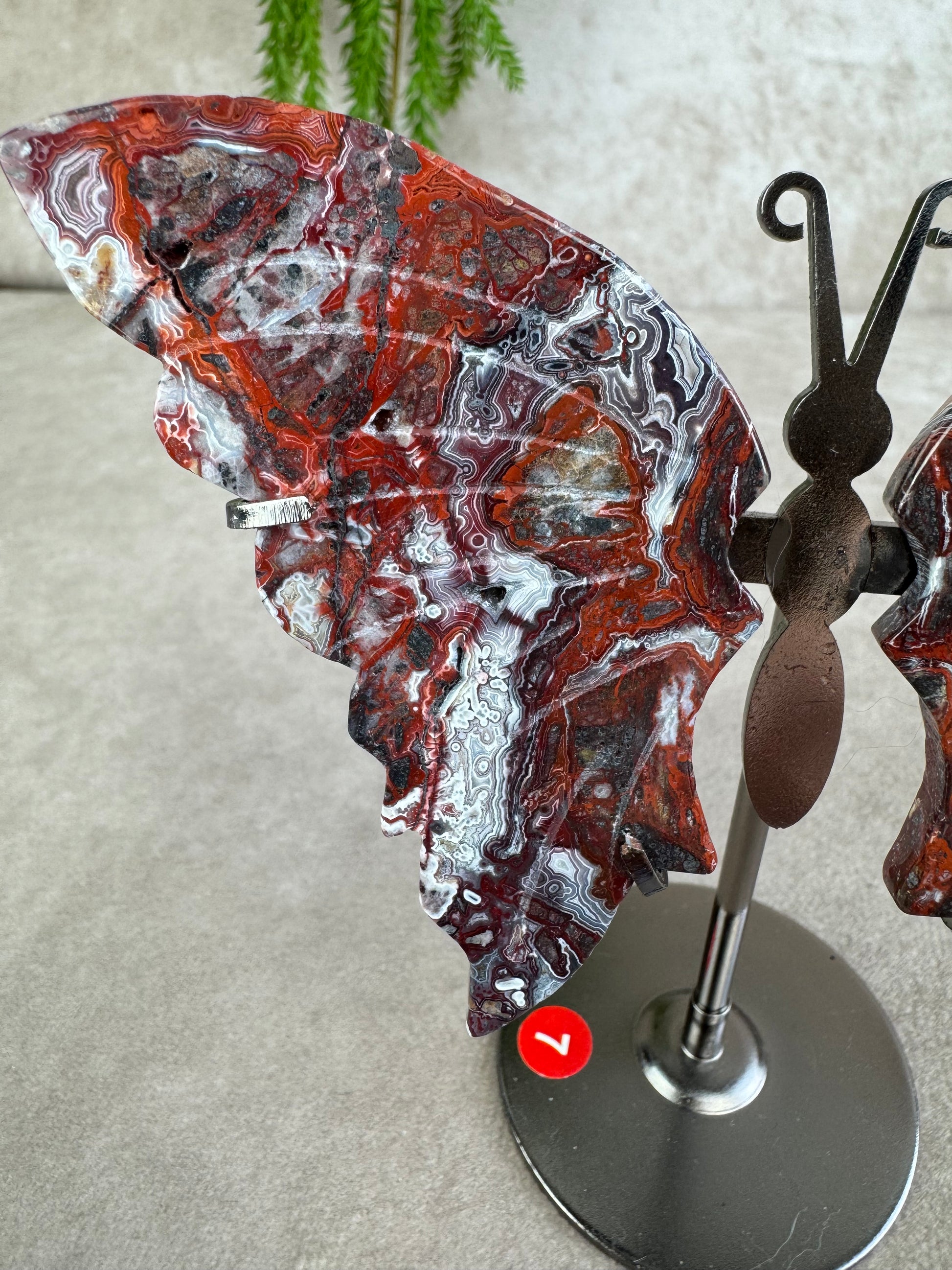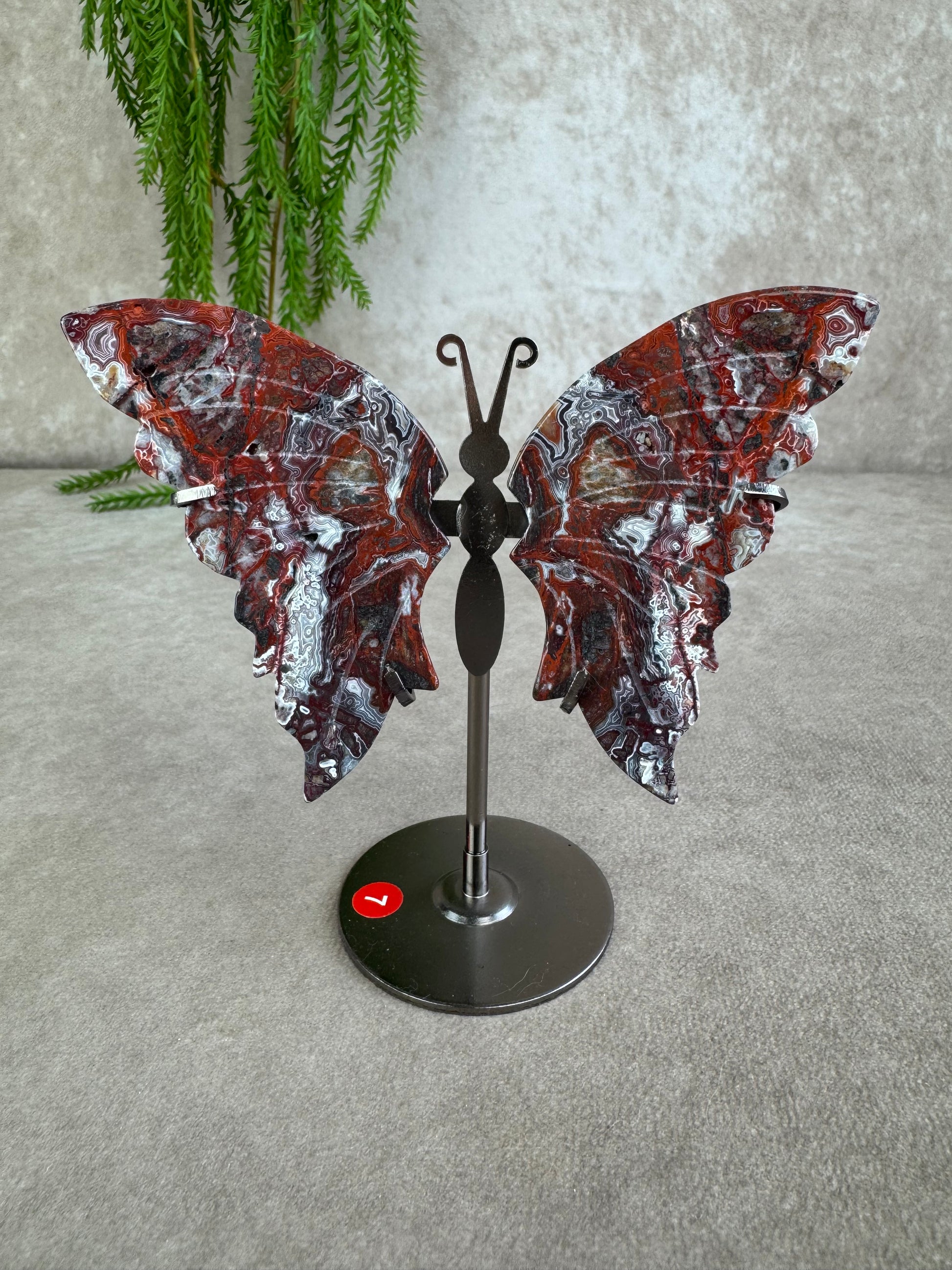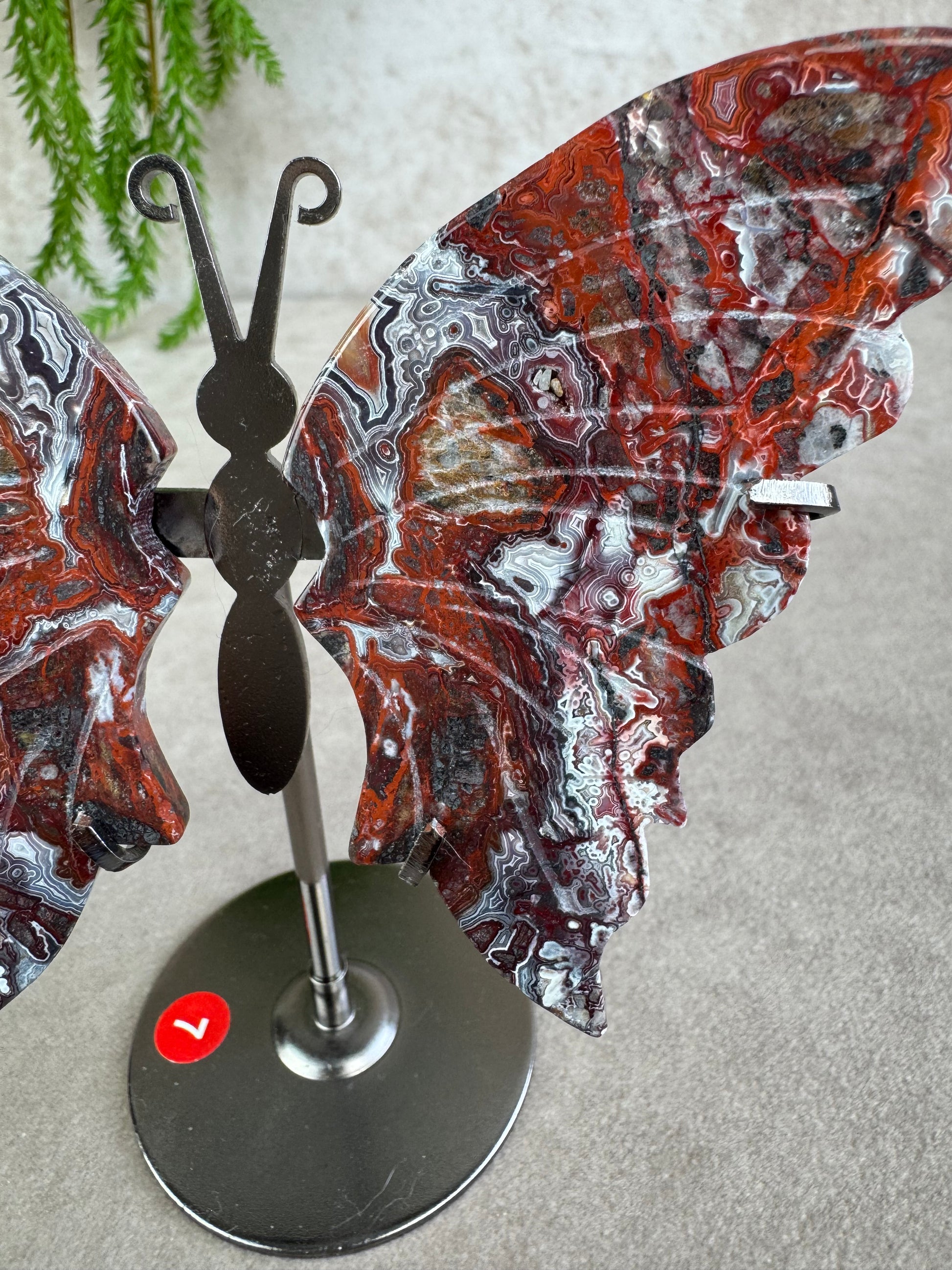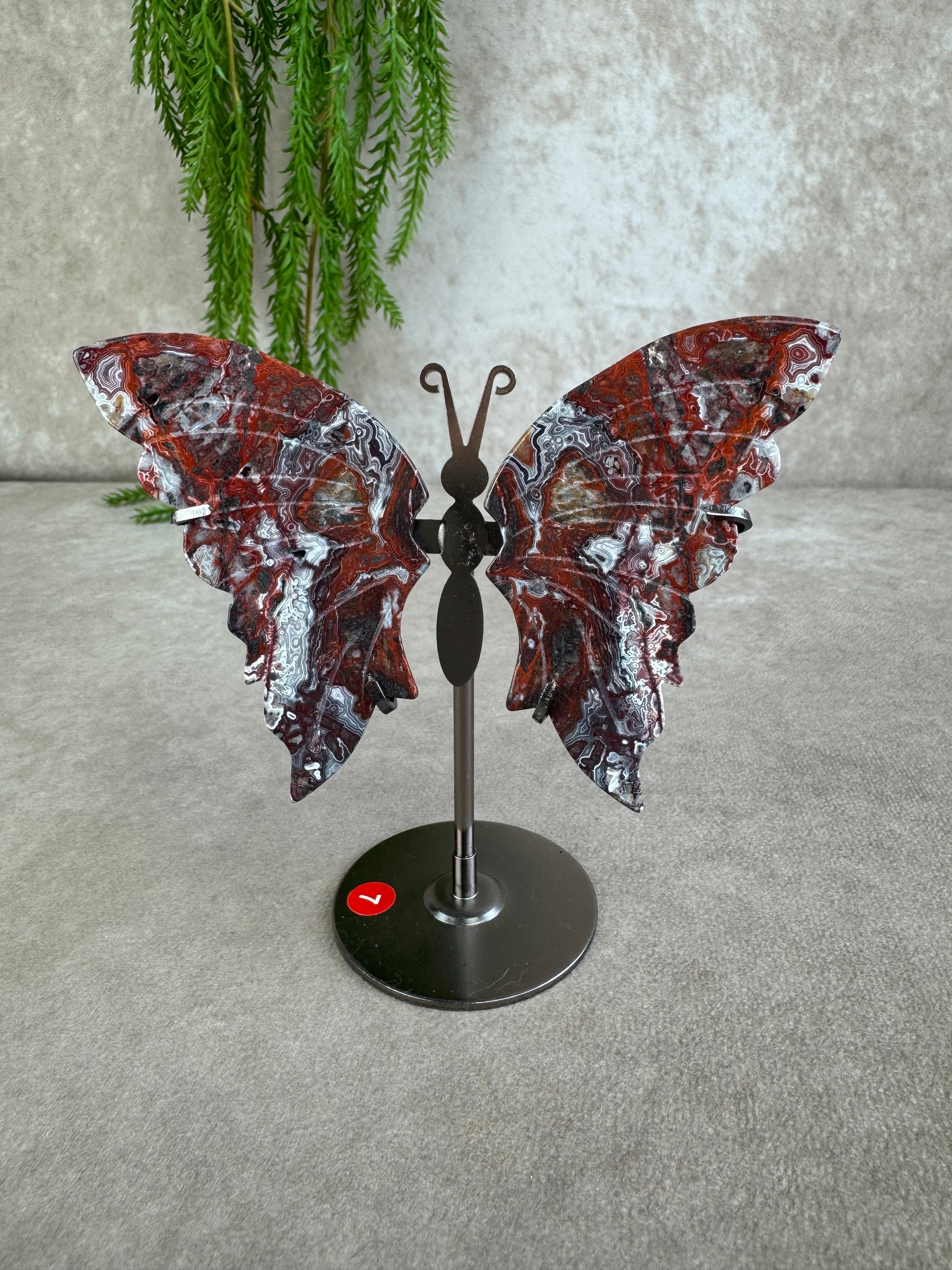 Crazy lace agaat staat bekend als de steen van vreugde, optimisme en vitaliteit. De natuurlijke wervelingen in rood, crème, bruin en wit geven de vleugels een speels en expressief karakter. de vlindervorm staat symbool voor transformatie en vrijheid en zo komt deze energie nog sterker tot leven.
