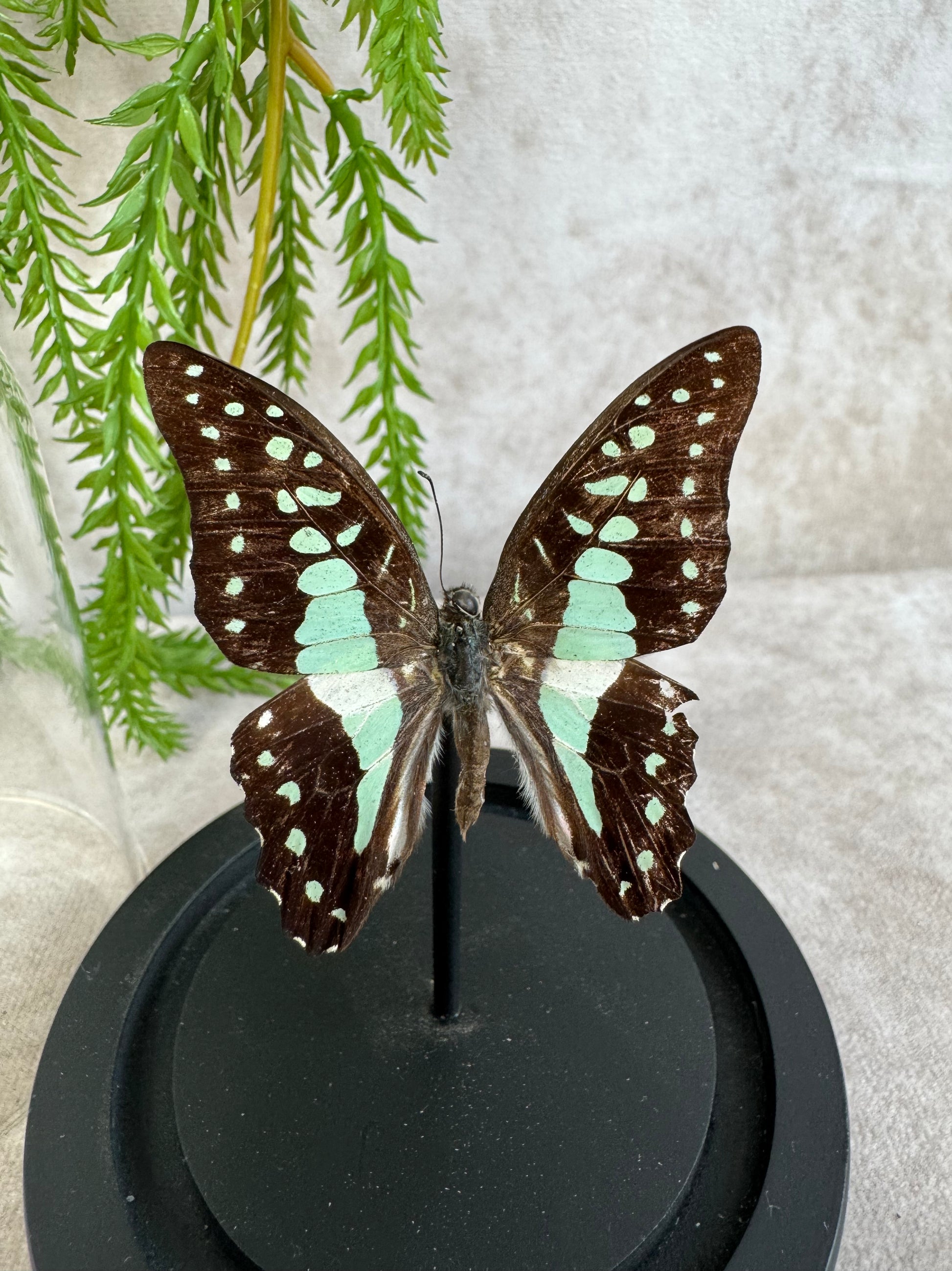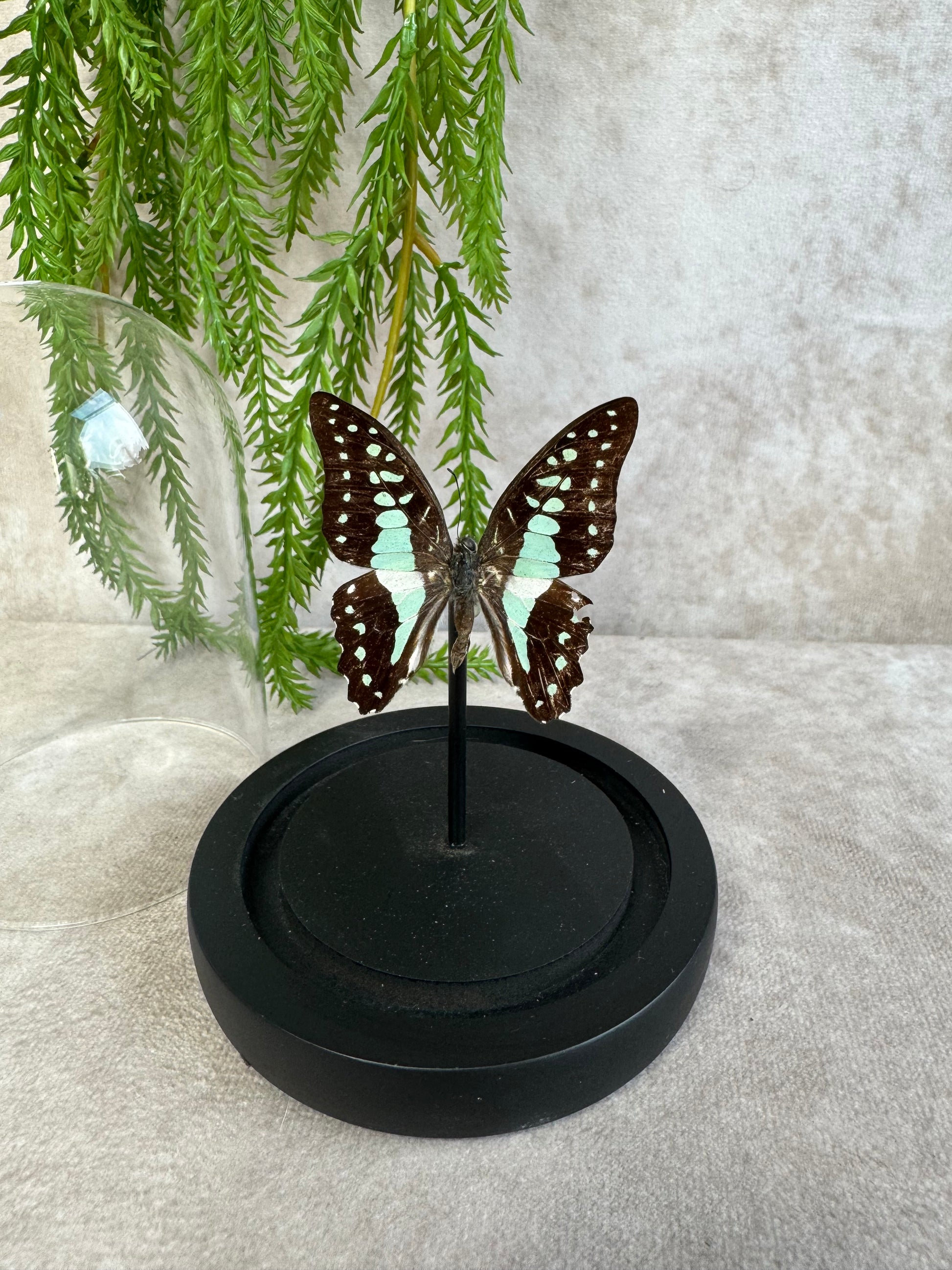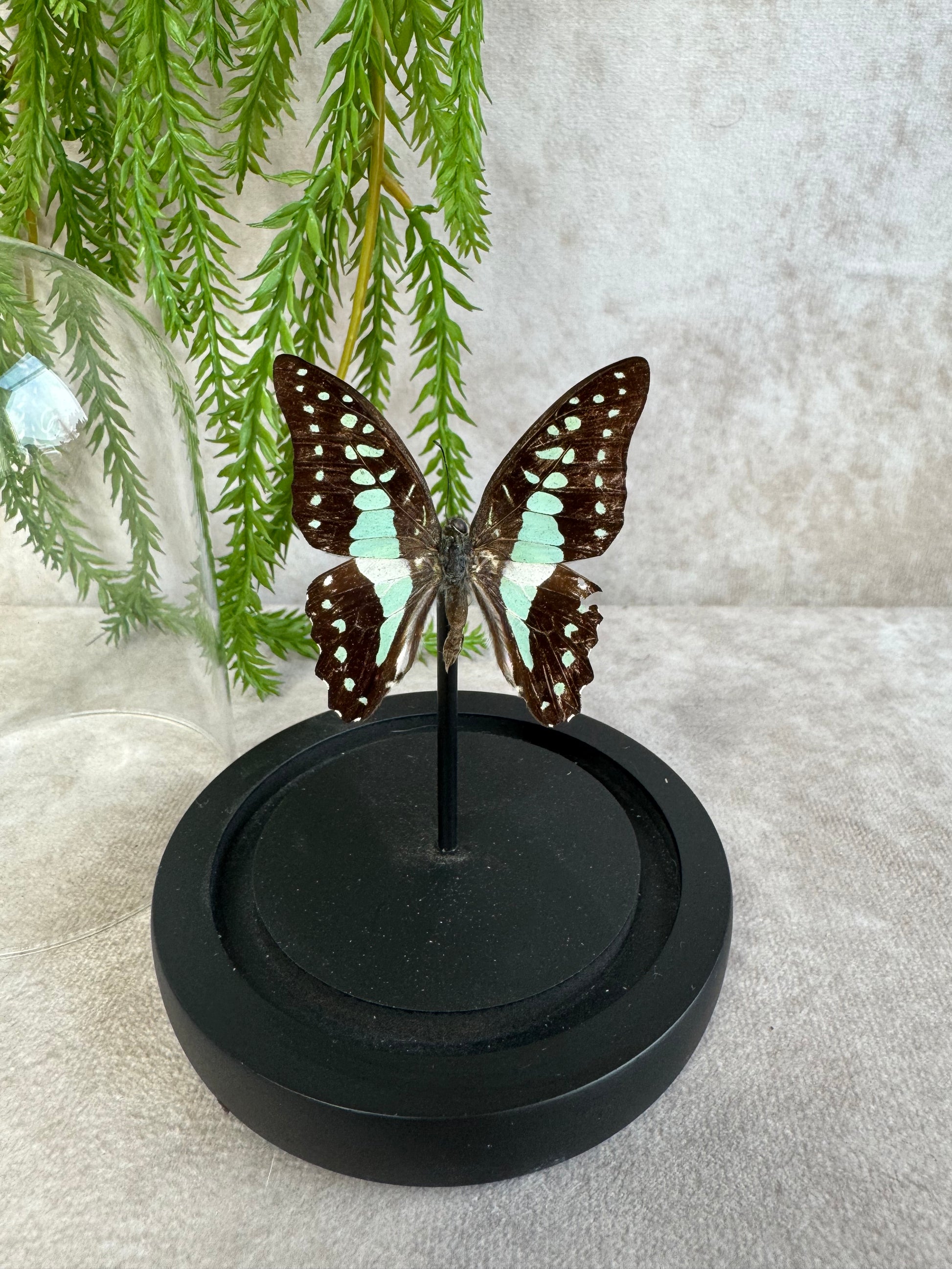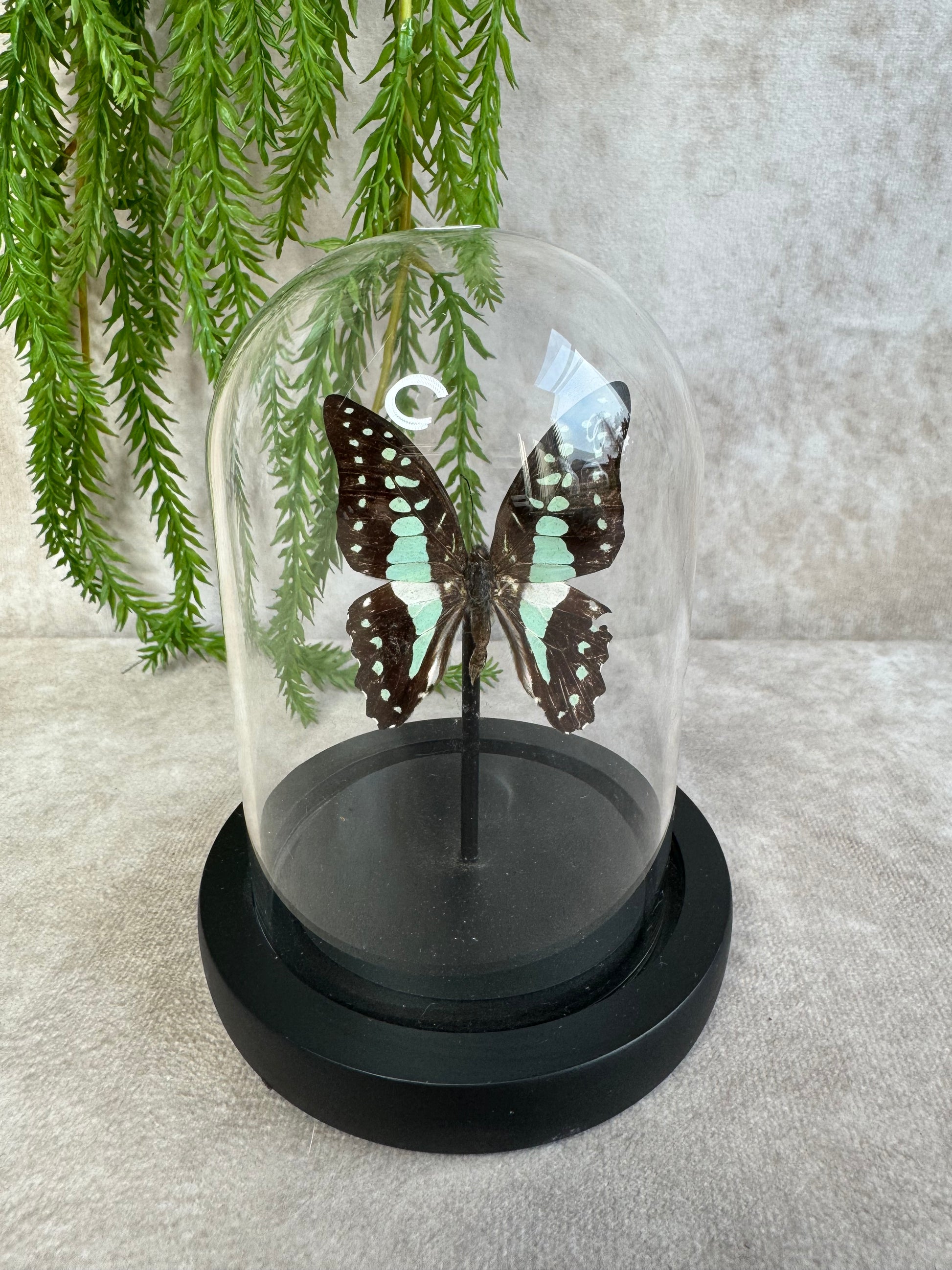 Deze natuurlijke vlinder in een elegante stolp is 13,5 cm hoog en voegt een uniek decoratief element toe aan elke ruimte.