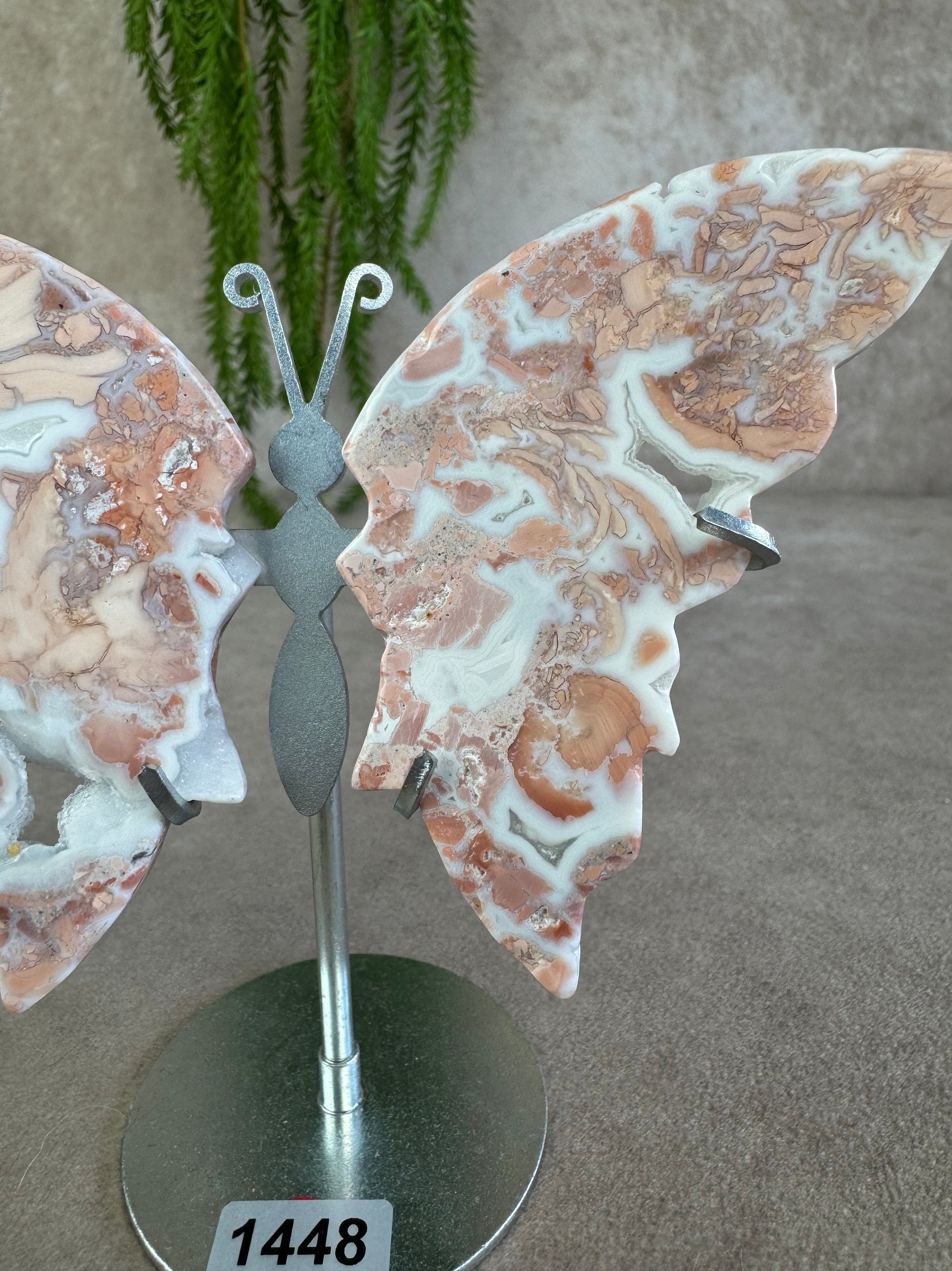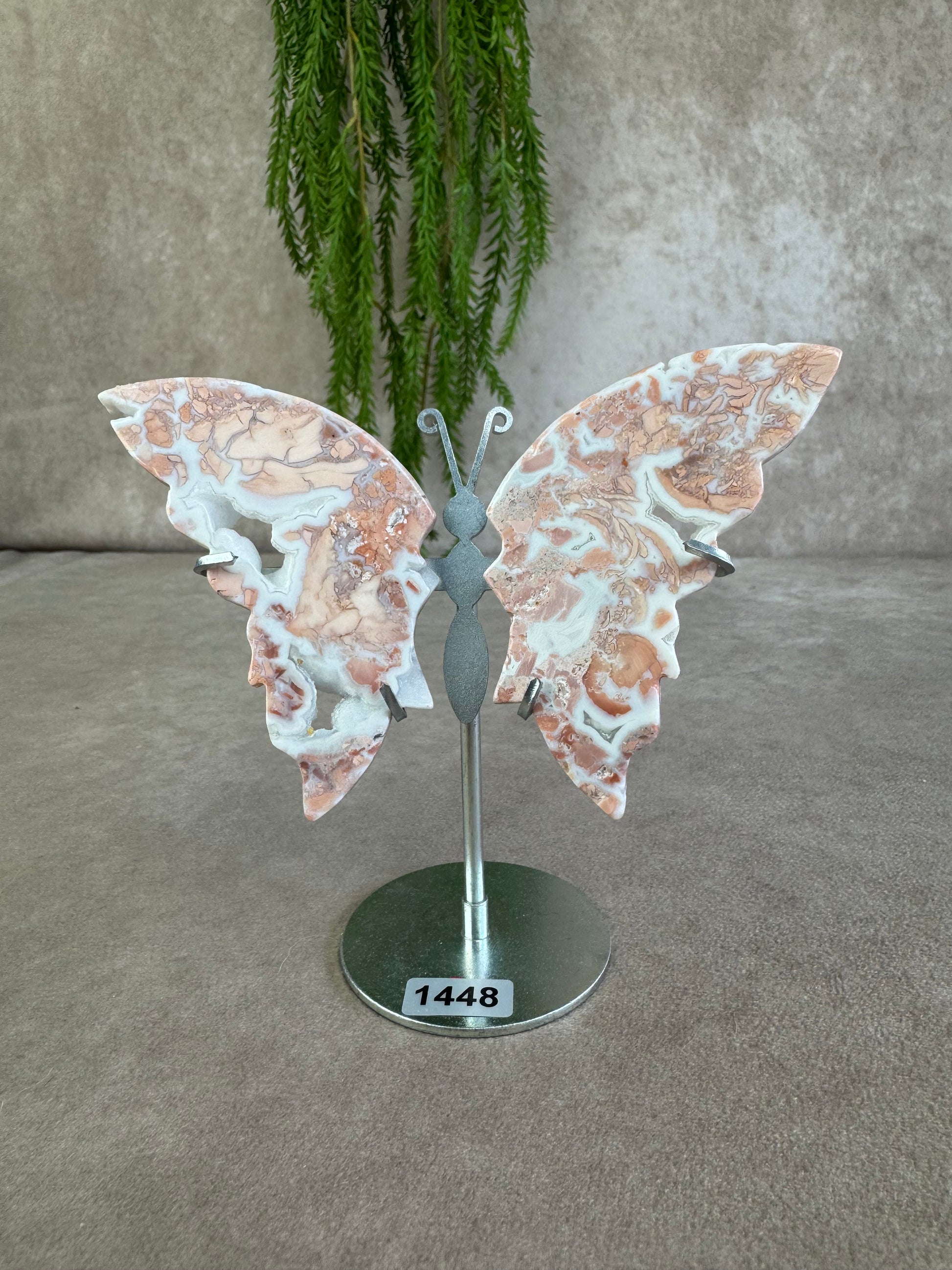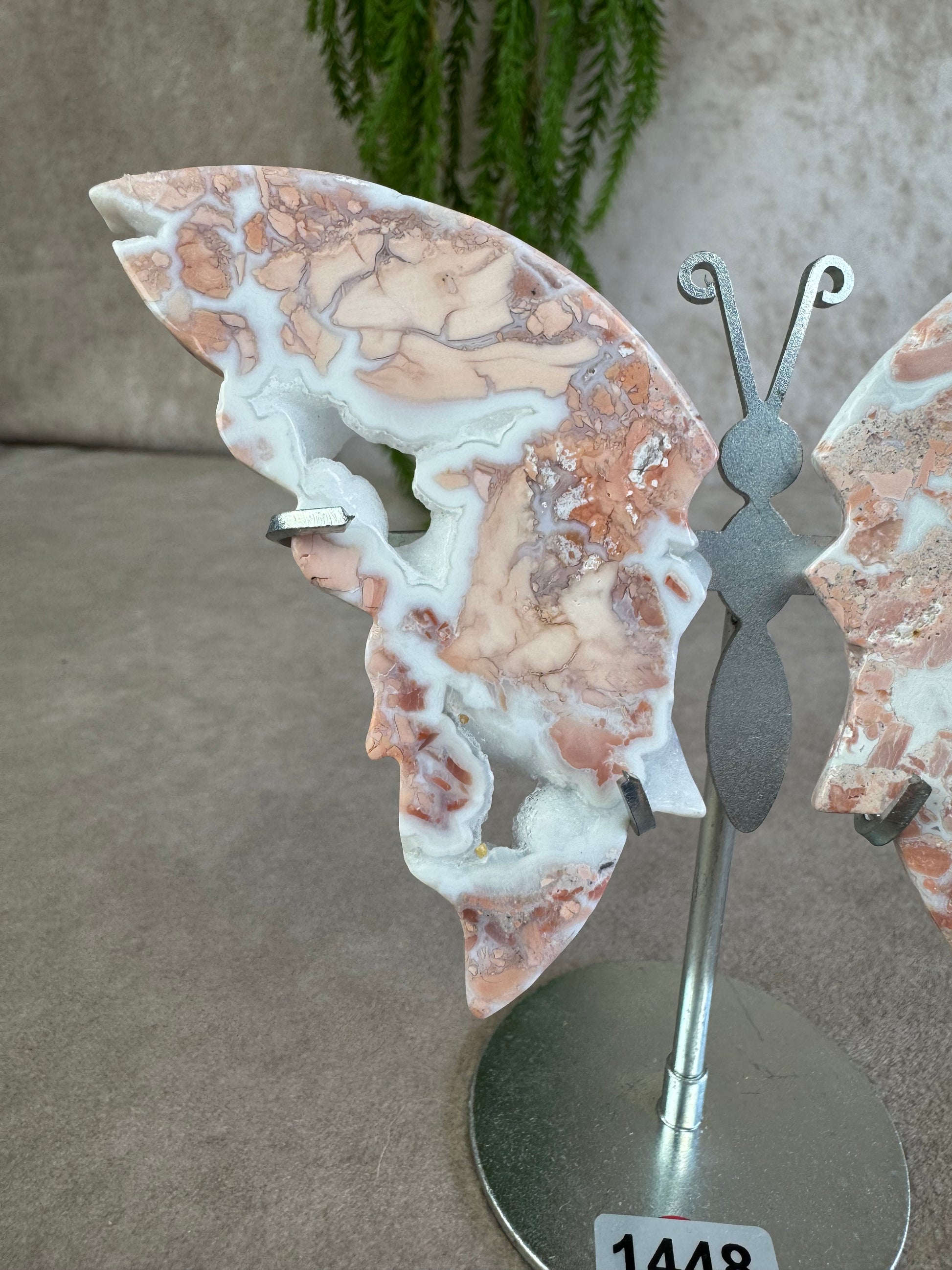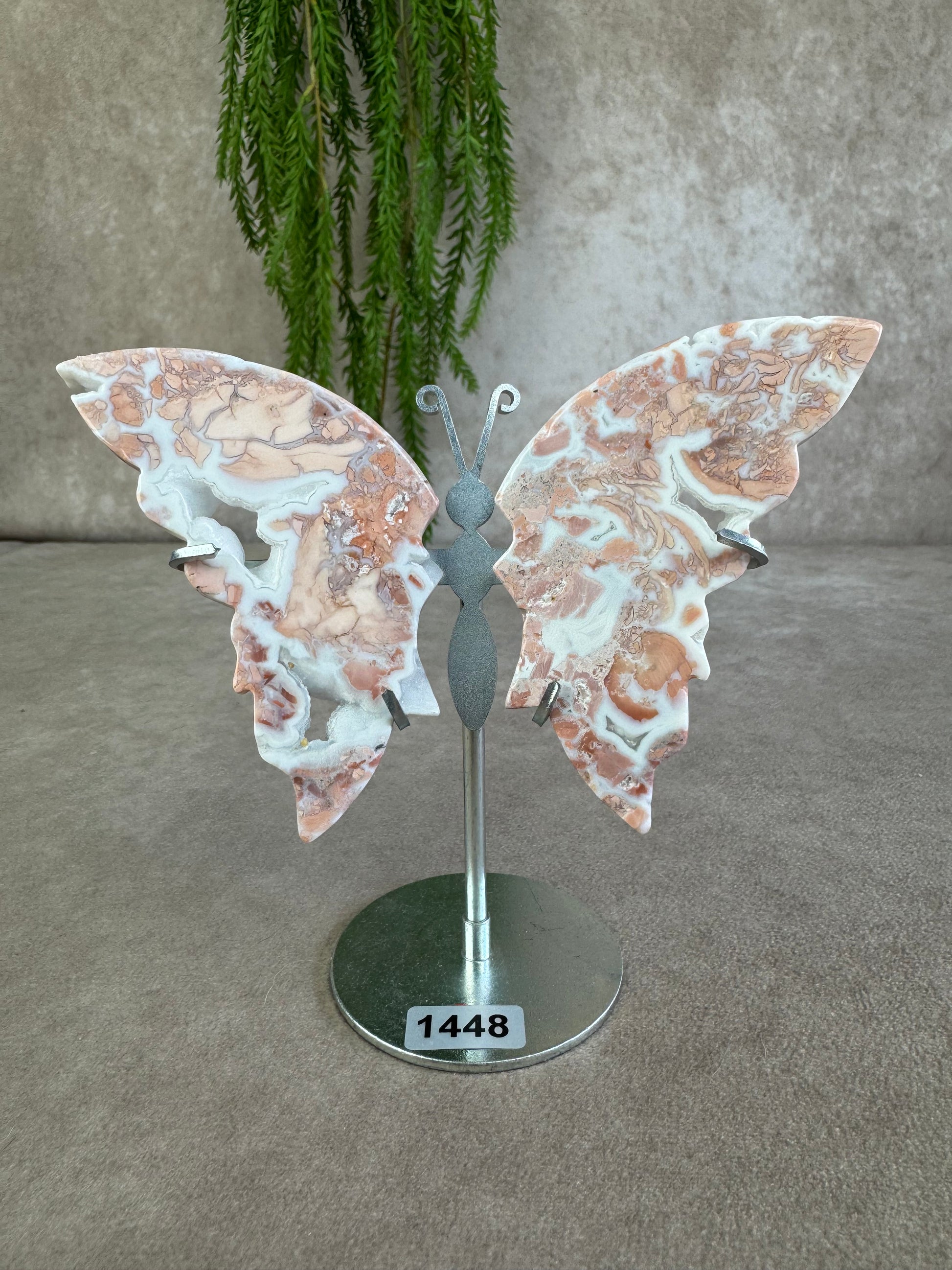 Deze betoverende vlinder van roze agaat met prachtige druzy-insluiting is een waar sieraad uit de natuur. Met een breedte van 13,4 cm en een hoogte van 11,5 cm (inclusief zilverkleurige standaard) is dit stuk een elegante blikvanger vol zachtheid en schittering.