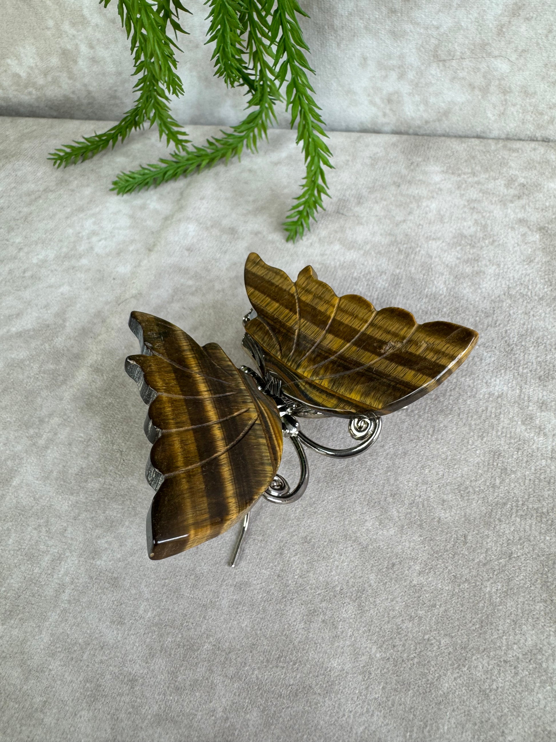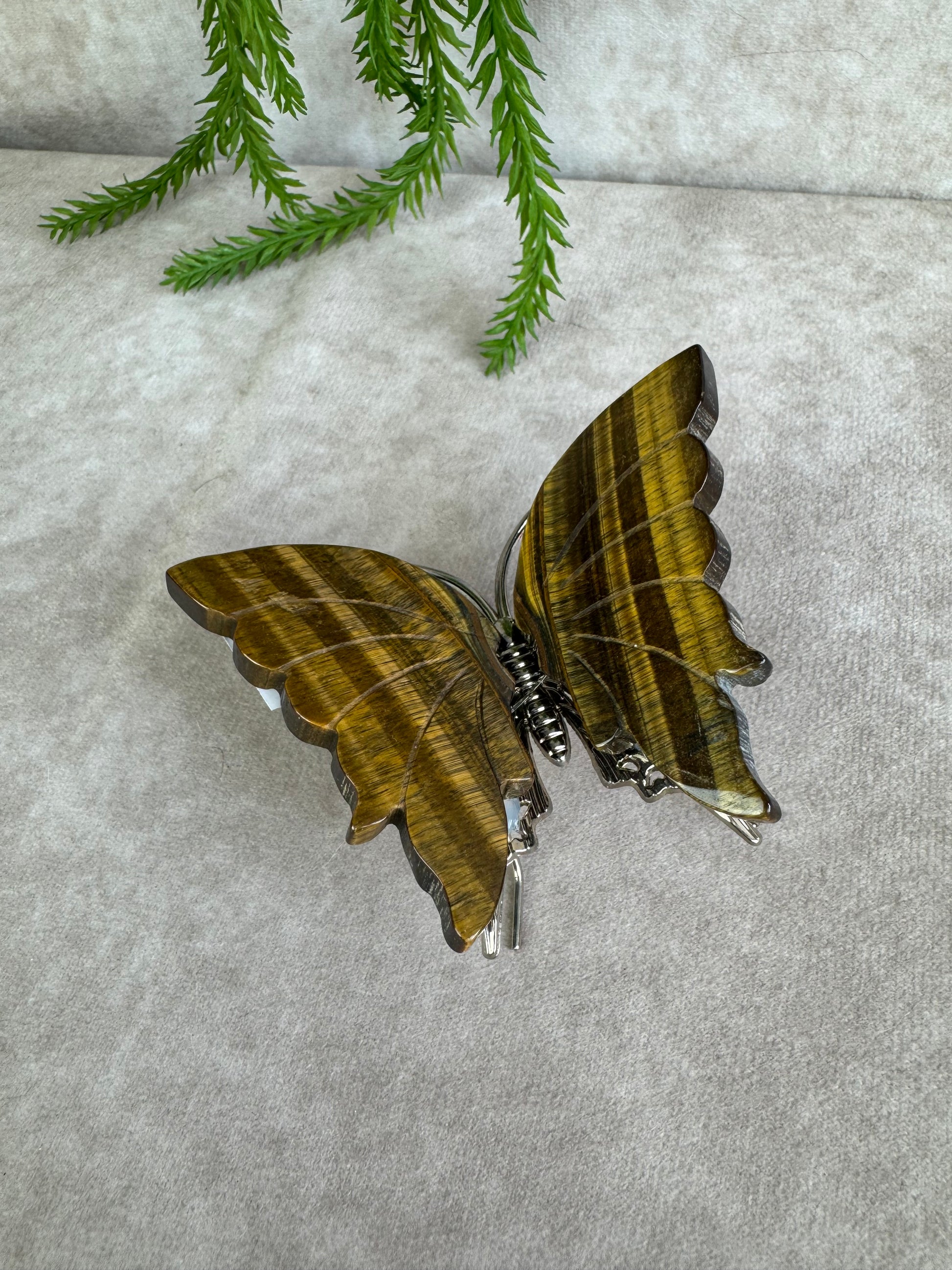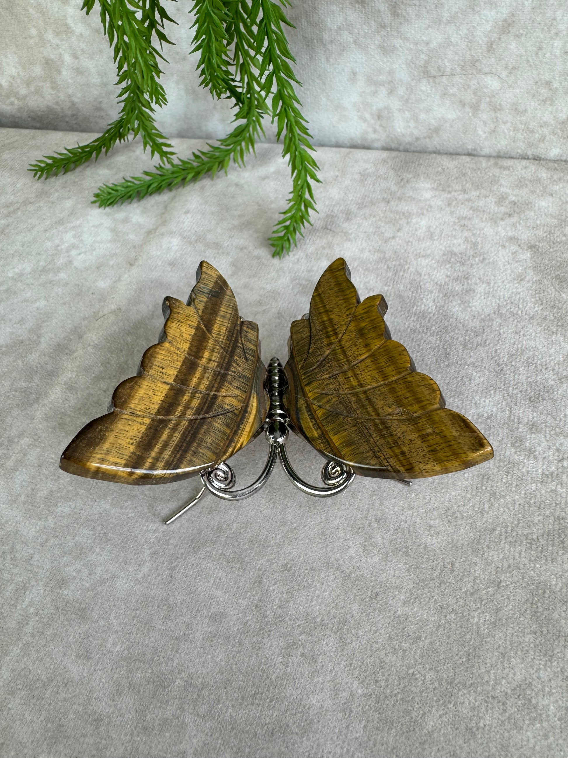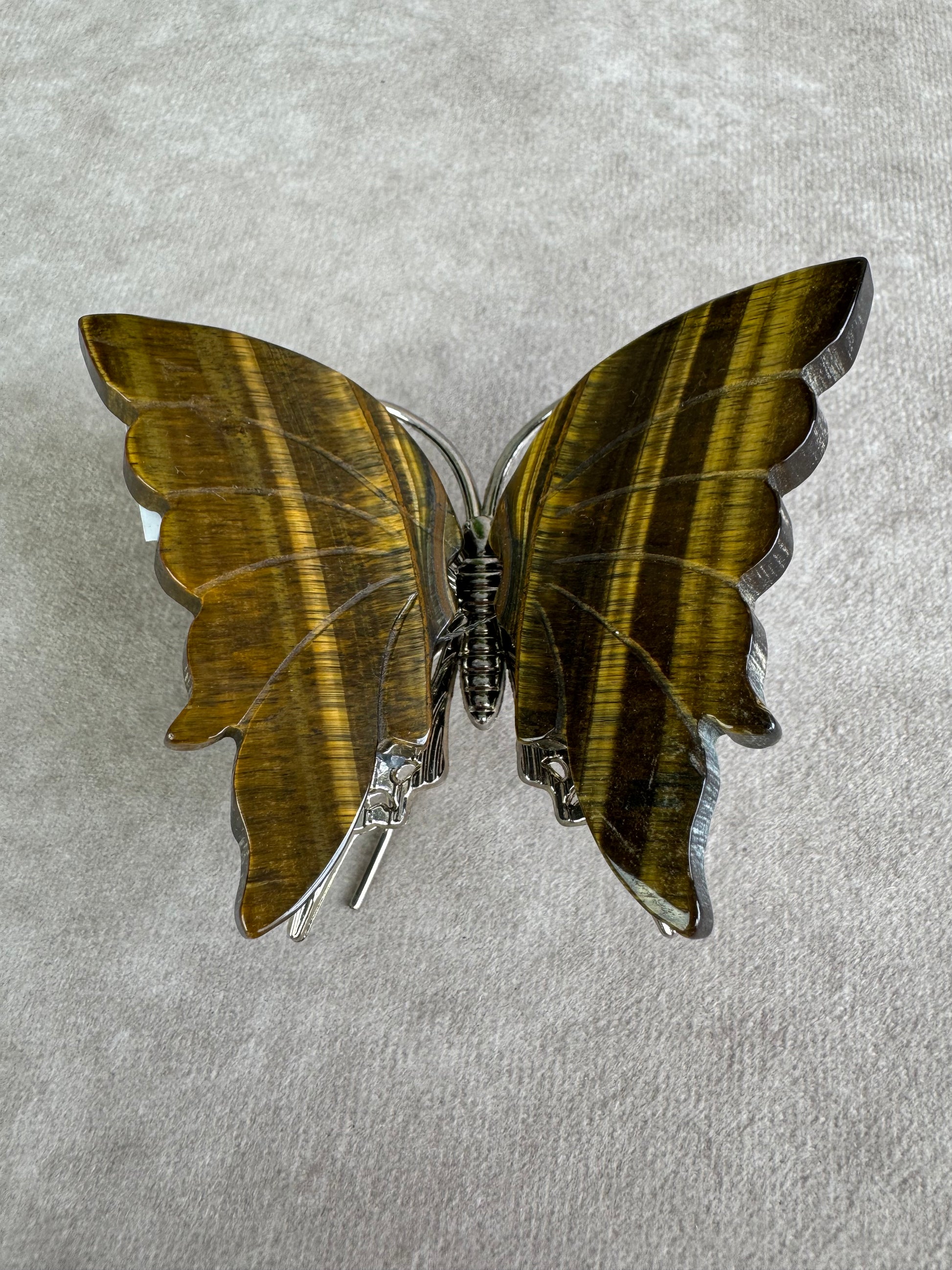 Deze prachtige vlinder van tijgeroog van 7 x 9 cm is een uniek stuk vol kracht en symboliek. De vleugels zijn zorgvuldig geslepen uit glanzend tijgeroog, een steen die bekend staat om zijn beschermende en aardende werking. Het zilverkleurige metalen lijfje voegt een elegant accent toe en maakt het geheel tot een sierlijk en gebalanceerd decoratiestuk.